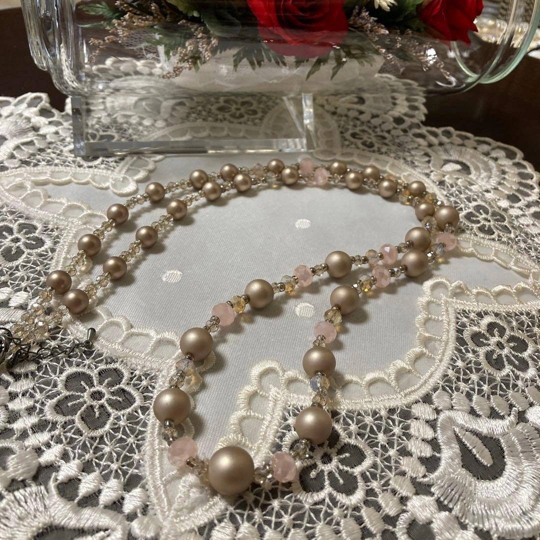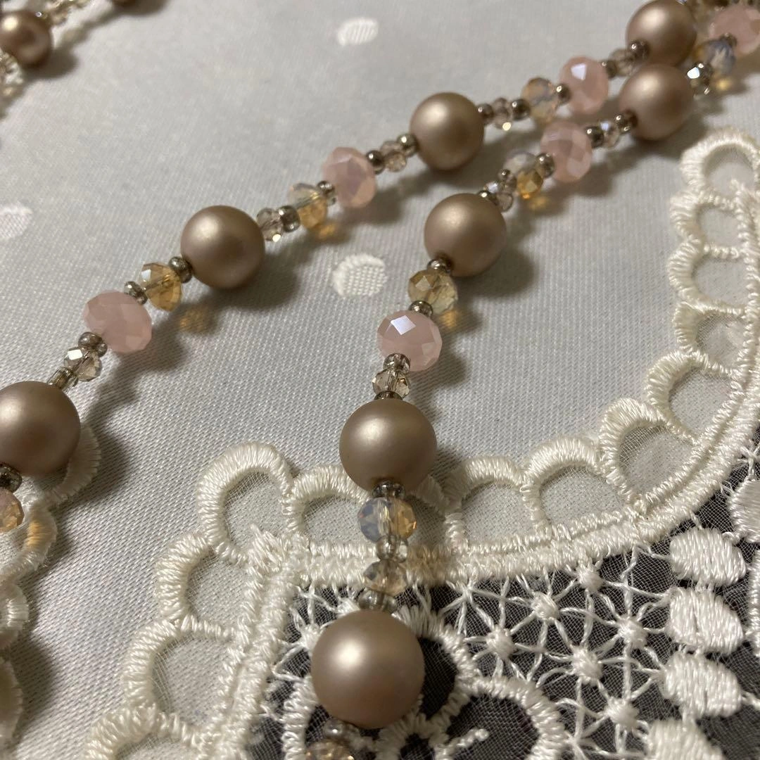 ピンクやホワイトのクリスタルが混ざりキラキラ光りとても素敵です。 ブラウン系のパールが間に存在感があります。 長さ80センチアジャスター5センチ ご希望の方はお気軽にご連絡ください。