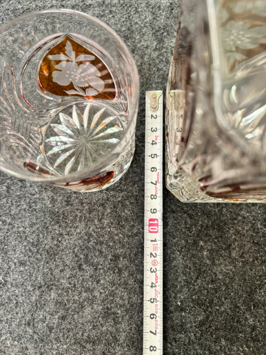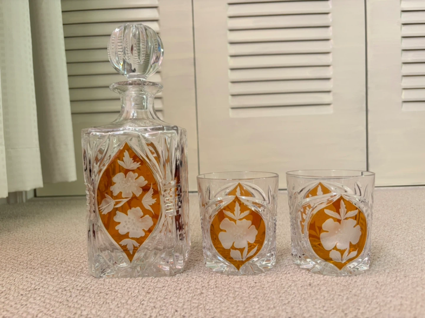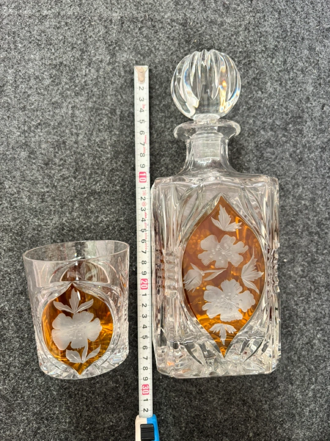 クリスタルのデカンタとグラスのセットです。デカンタはかなり重いです。 ・花柄のデザイン ・デカンタとグラス2個のセット ・使用感少なめ ご不明点があればお気軽にお尋ねください。