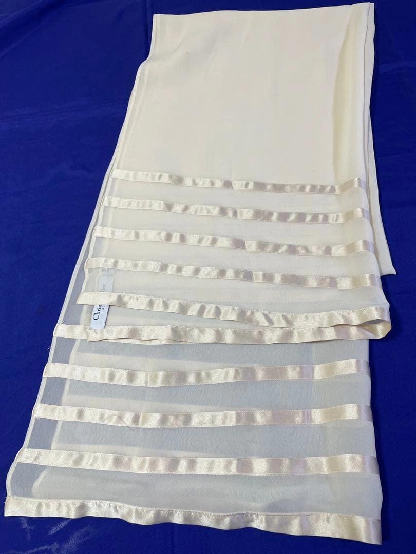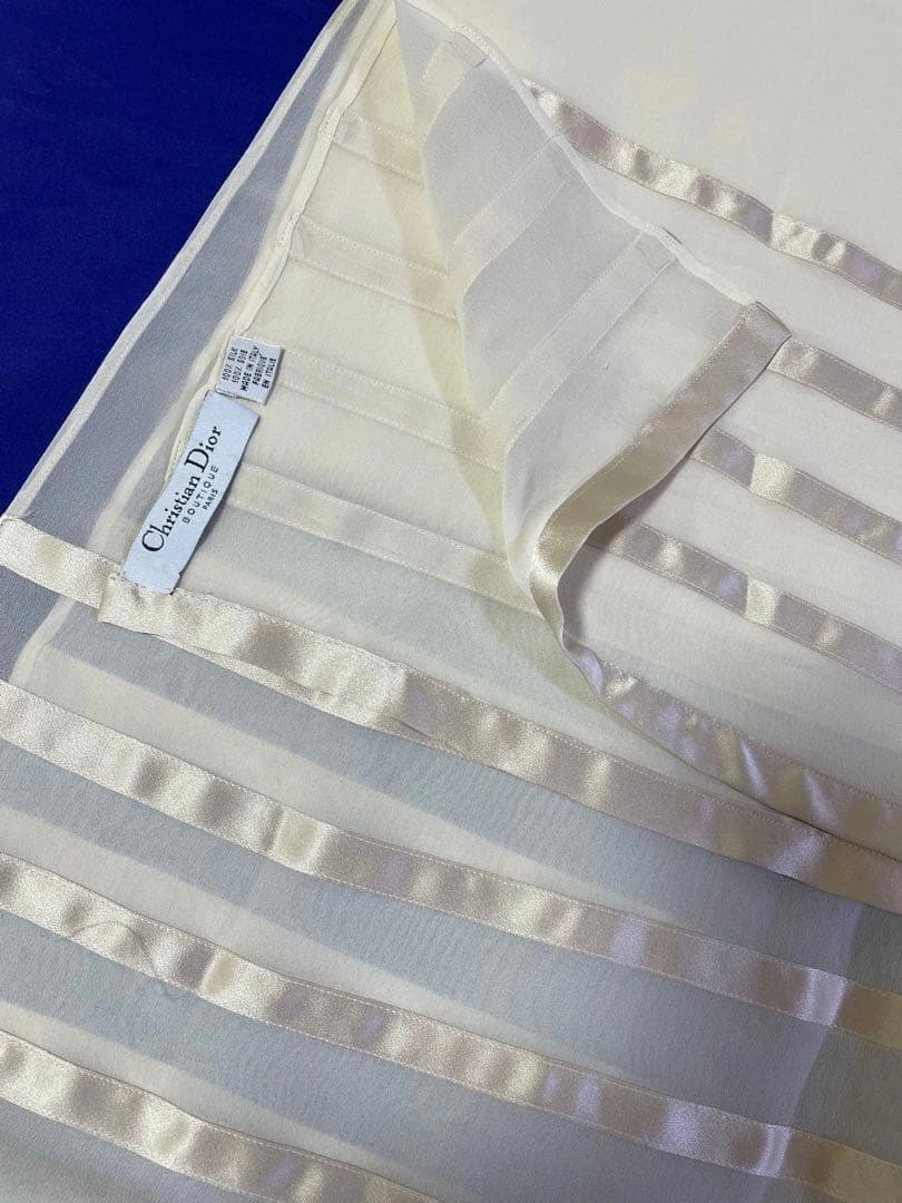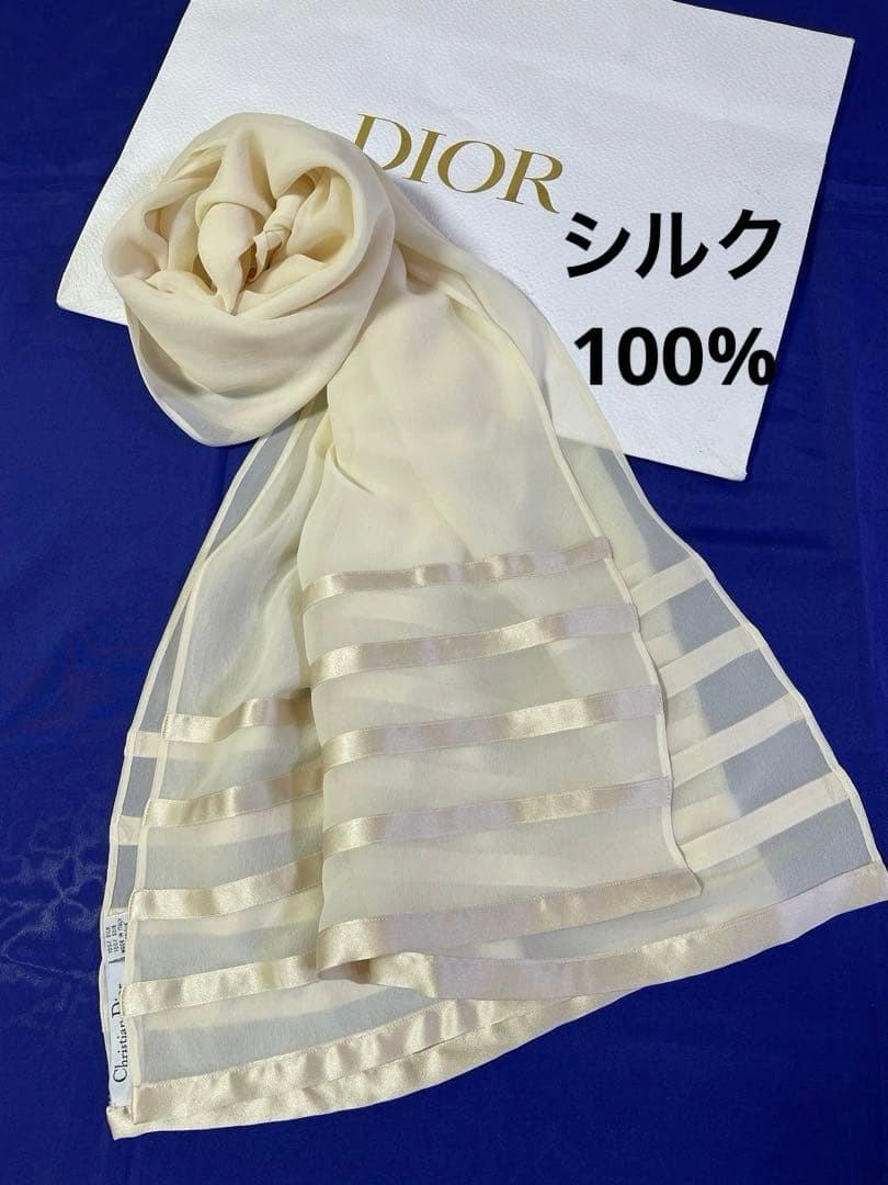 Christian Dior、クリスチャンディオールのストールです。 カラーはアイボリー、薄いクリーム色で、ラインの部分はピンクベージュのようなお色です。 素材はシルク100%。 サイズは約214cm×65cmです。大判で、幅も長さもたっぷりあります。 祖母の箪笥に眠っておりました。 極小の薄茶色のシミが数個あります(画像9.10)。 おそらく保管中の箪笥シミかと思います。 ストールの色と同化しますし裾の部分ではないので着用にはほとんど目立たない程度だと思います。 面積が広いので見落としがありましたらご容赦ください。 usedにご理解のある方のご購入をお願い致します。 NC.NRでお願い致します。 ※お使い頂ける方がおられましたらお値段交渉承ります。 ご希望の方はお気軽にご連絡ください。
