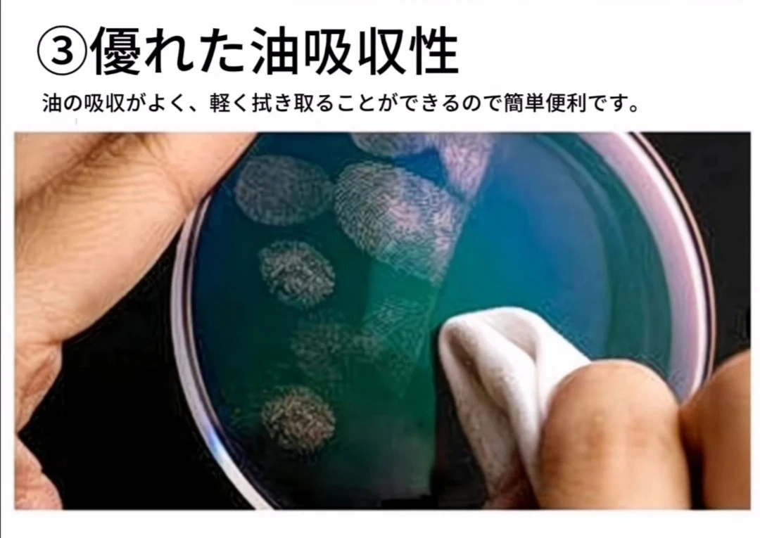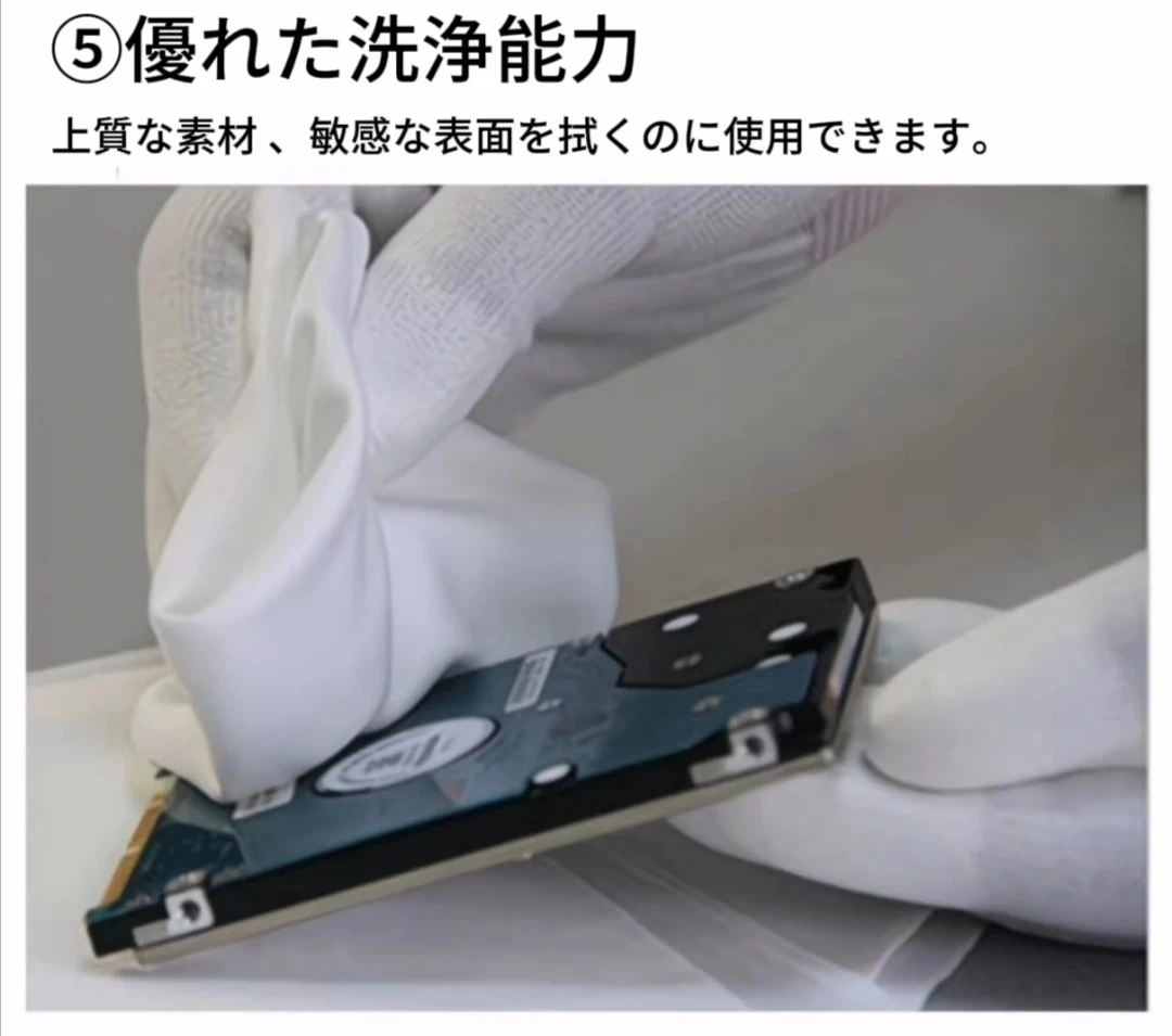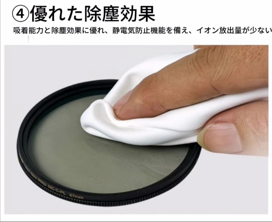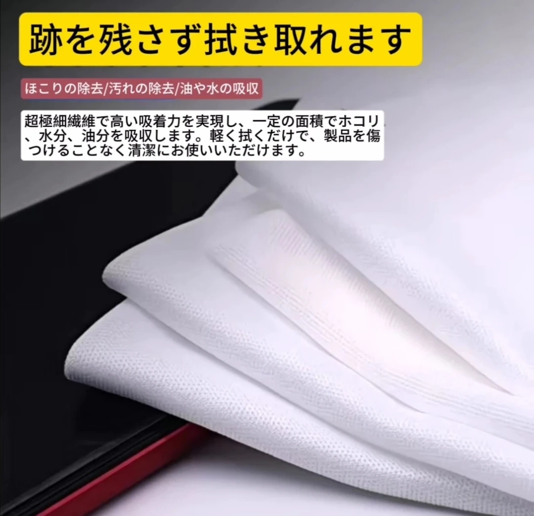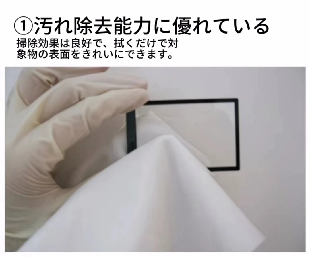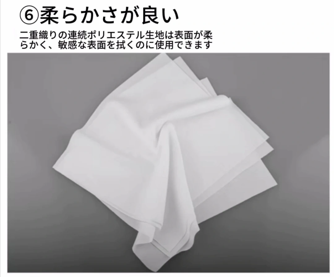 商品の特長・基本仕様 特長: ポリエステル超極細繊維を使用。表面積が大きいので、粘性の高い汚れを多量に拭き取る際に、優れた拭き取り性能を発揮します。 100%長繊維からなるニットタイプのワイピングクロスで、繊維の毛羽立ちや自己発塵が少ないワイパーです。端面レザーカット処理、ワイパー専用のクリーンルーム下での超純水洗浄加工により優れたリントフリー性を発揮します。 長極細繊維使用による毛細管現象と繊維間の空隙が多い事により、水や油、溶剤などを素早く吸収し、多量に保持します。 緻密で無数のミクロループが汚れをしっかりからめとります。 洗濯可能です。 途切れていない長い繊維から出来ているため、拭いた時に細かなケバが残りません。 用途: ①粘性の高い汚れを多量に拭き取る際に ②クリーンルーム内の清掃に ③眼鏡、スマホ、カメラのレンズ、ノートPC画面拭きに。清掃時クロスからの再付着が無く清掃が容易 メガネ拭きに使ったら今までのクロスよりクリア感がUP。 使用方法: 洗剤を使わず、レンズ表面の”油脂”を取り去ってくれます。眼鏡の場合は、軽く水洗いをしたのちに何度かふき取りをすると、新品のようにきれいになります。 手入れ: 使用後は、石鹸水で軽くもみ洗いをして、乾燥させると、ふき取り能 力は完全に復活します。 材質:ポリエステル超極細繊維 色:ホワイト 容量:1枚 シートサイズ:200×200(mm) 価格:1点500円 2点800円 3点1000円