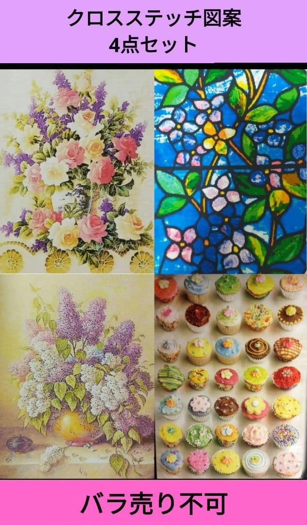 クロスステッチ図案4点セット ・①ステンドグラス スミレ【画像2・3】 ・②カップケーキ【画像4・5】 ・③フローラルブーケ【画像6 ・7】 ・④咲き誇る薔薇【画像8・9】 変換表【画像10】 ・OLMPUS→DMC ・Anchor→DMC ・COSMO→DMC #Azクロスステッチ クロスステッチは、もうやらないので出品します。 海外から代理店に頼んで日本に輸入してもらい購入したものや海外オークションで購入した物等が有りますので、日本には無い物も有るかと思います。 コツコツ集めていたものなので袋に劣化や、やろうと思って開けたものもあります。 他にもクロスステッチキット・図案のみが有ります。 自宅保存の為、神経質の方や完璧を求める方は、ご購入はお控えください。 購入後イメージ違い等、言う方はお断りします。