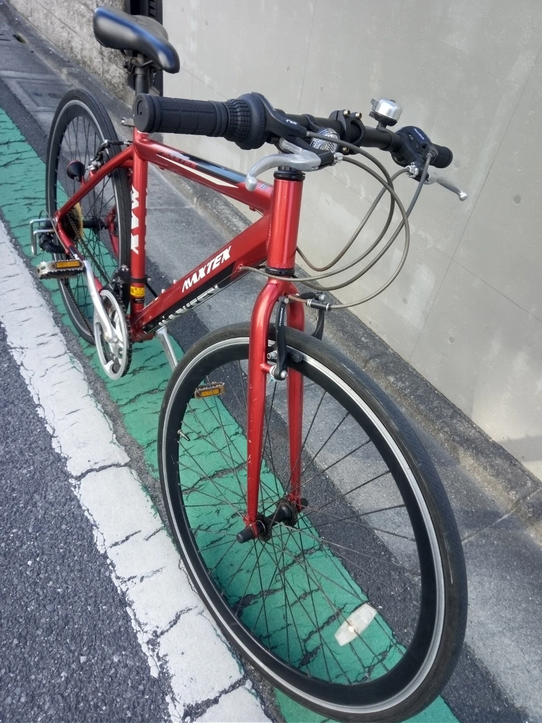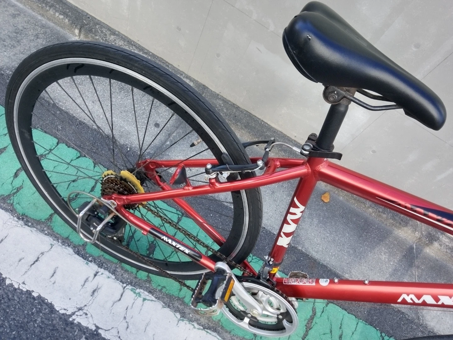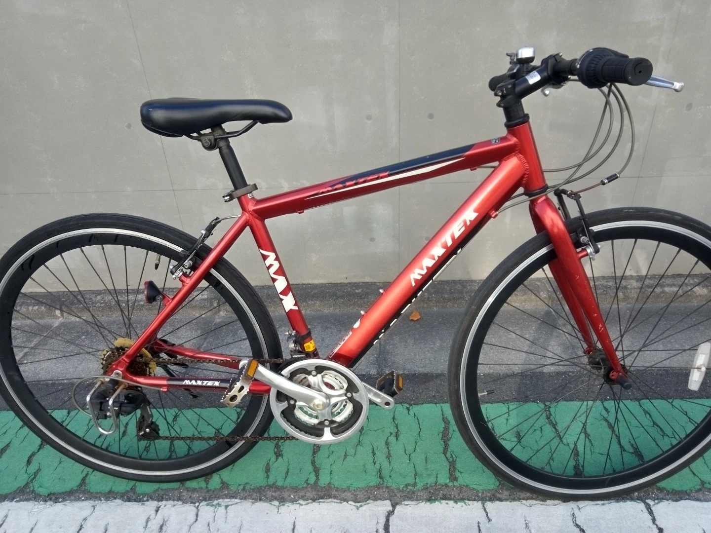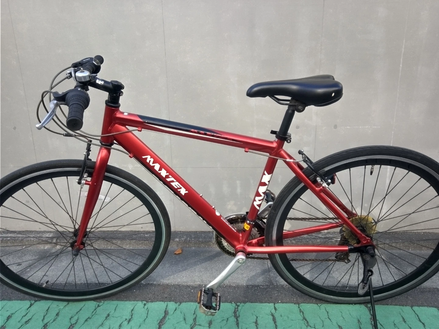 MAXTEXというのクロスバイクです。21段変速 700✕28 オレンジ色に近い赤色 僅ににキズ、サビがありますが全体的にはとてもきれいです。 簡易点検、整備済み。直ぐに乗れます。 サイズ 700✕28 CT470 適応身長目安 150cm以上 シートポスト稼働します。 変速 外装21段変速 ・ライトなし。 ・ワイヤー式錠です ・サイドスタンドです。 ・かご、リアキャリアなし ・前後フェンダーなし。 ・タイヤの山、溝あり。やや劣化あり。 ・前後Vブレーキ、正常に稼働します。 ・仏式バルブ、アダプター付き普通の空気入れで入ります。 ・サドルは一部に擦り傷、切れあり。 防犯登録あり。譲渡証明書あり。 ご購入前提で、自転車走行30分程度なら送料無料でお届けします。
