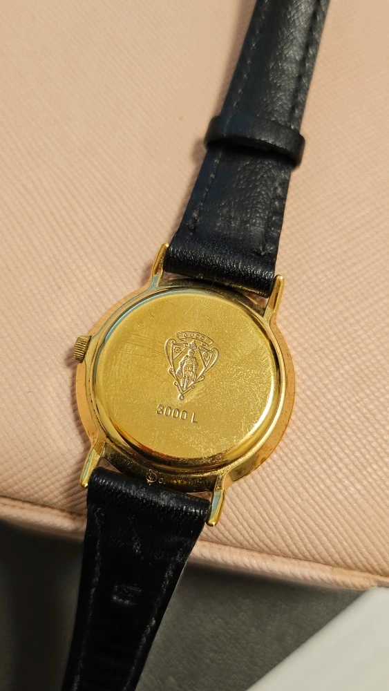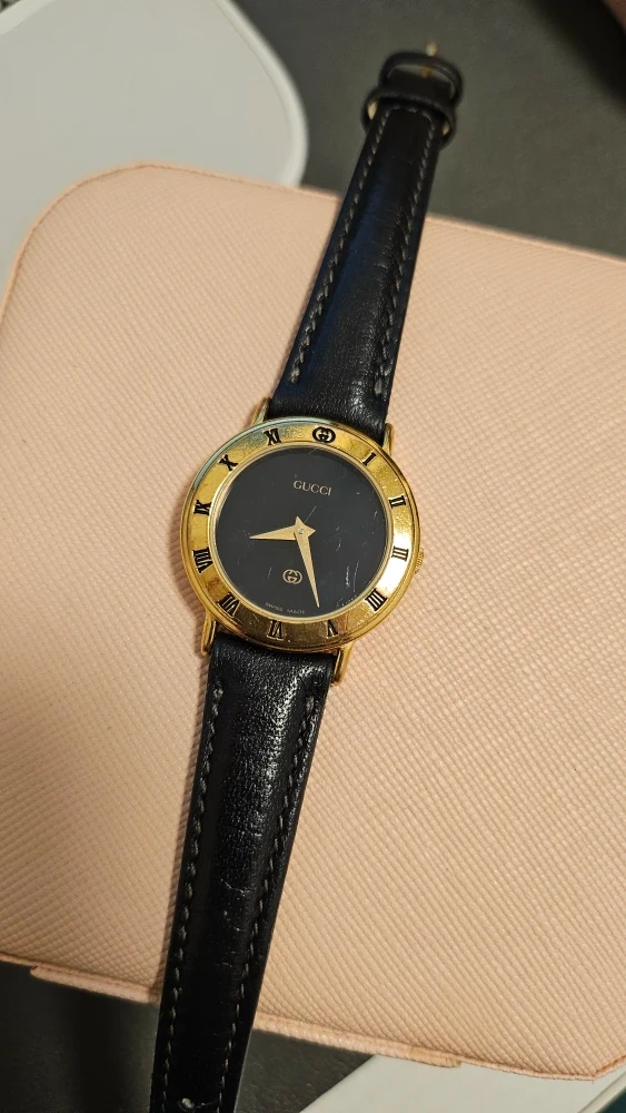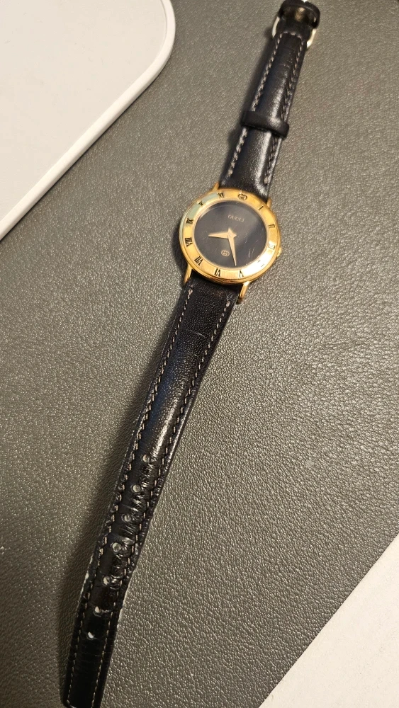 グッチの腕時計です ヴィンテージで母から譲ってもらいました。ベルトも一回変えています。 時計はとまっているので、ご了承いただけるかたにぜひ。 【情報】 ブランド:グッチ 型番:3000L カラー:ブラック、ゴールド 【状態】 ベルトに傷み、使用感あり 中古品であることご了承ください