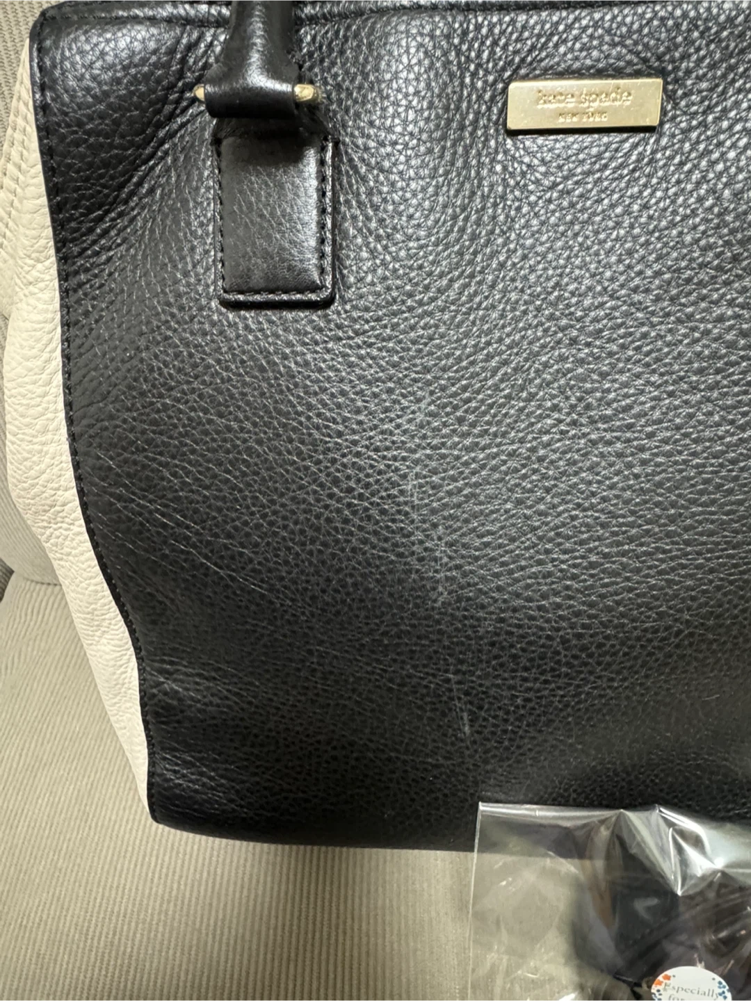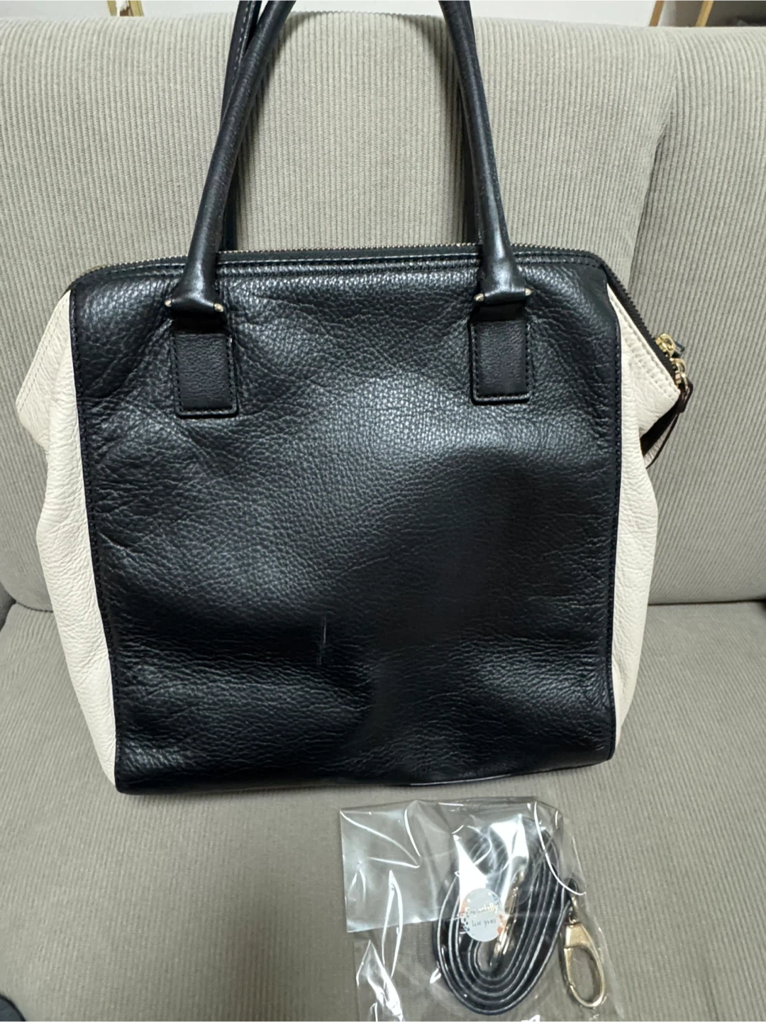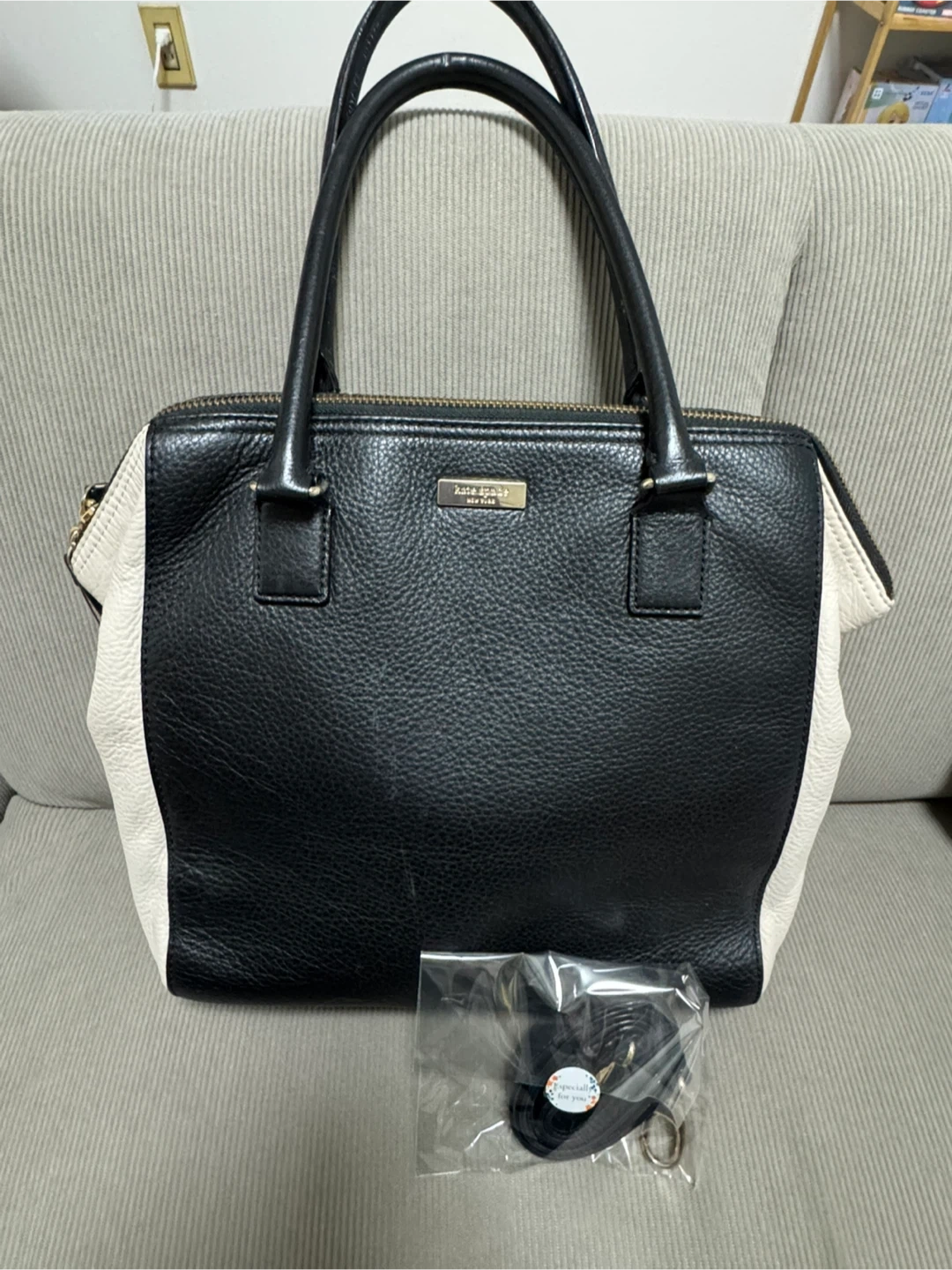 ケイトスペードのハンドバッグです。 ・ブランド:ケイトスペード ・カラー:ブラック、ホワイト ・付属品:ショルダーストラップ(未開封) ・状態:一部に小さなキズあり ・大きさ約30×30×12cm 中古品であることをご了承ください。