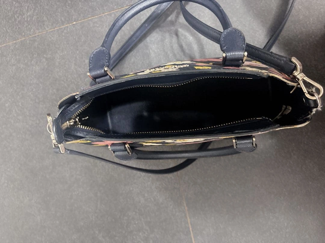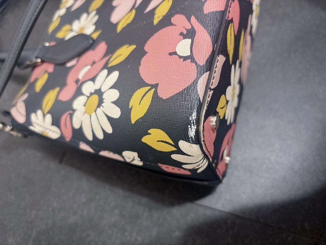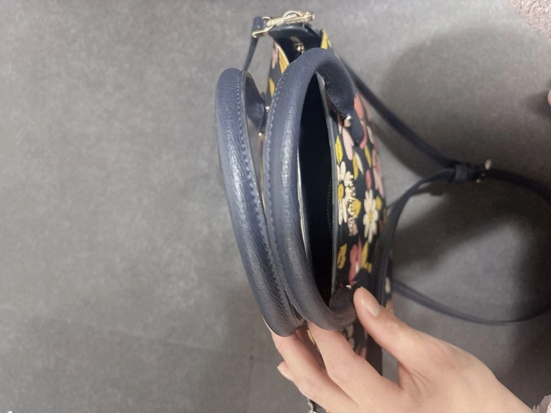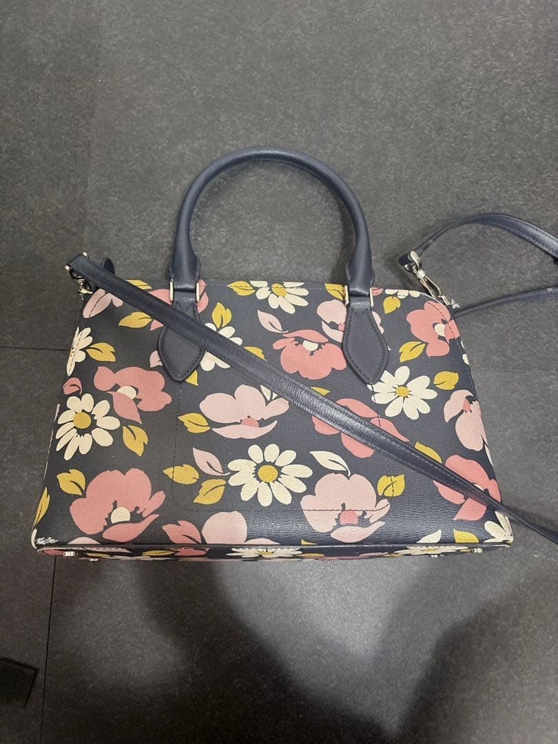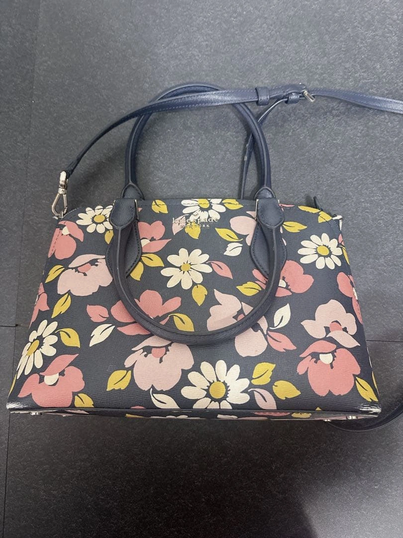 ご覧いただきありがとうございます。 Kate Spade(ケイトスペード) の「Darcy フラワースモール 2WAYサッチェルバッグ」です。 上品な花柄デザインとコンパクトなサイズ感が特徴の人気モデルです。 【商品詳細】 ・ブランド:Kate Spade New York(ケイトスペード) ・モデル名:Darcy Flower Small 2WAY Satchel ・カラー:ネイビー ピンク、黄色、白の花柄 ・サイズ:約 縦18cm × 横24cm × マチ10cm ・仕様:ハンドバッグ/ショルダーバッグ(2WAY仕様) ・状態:やや傷や汚れあり(角スレや金具部分に小さな擦れがありますが、全体的にはきれいな印象です) 普段使いはもちろん、フォーマルにも合わせやすい万能なデザインです。 使用感をご了承のうえ、ご検討ください。