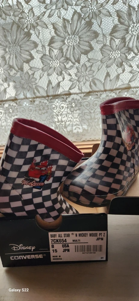 コンバースのレインブーツです。 ・ブランド:コンバース ・サイズ:15cm ・ベビー オールスター N MICKEY MOUSE PT Z ・カラー:マルチカラー、チェッカー柄 ・カーズのデザイン ・箱付き ・多少の使用感有り ・ご希望でしたら最後の写真のアンパンマンの黄色雨カッパをお付けします。 中古品であることをご了承ください。