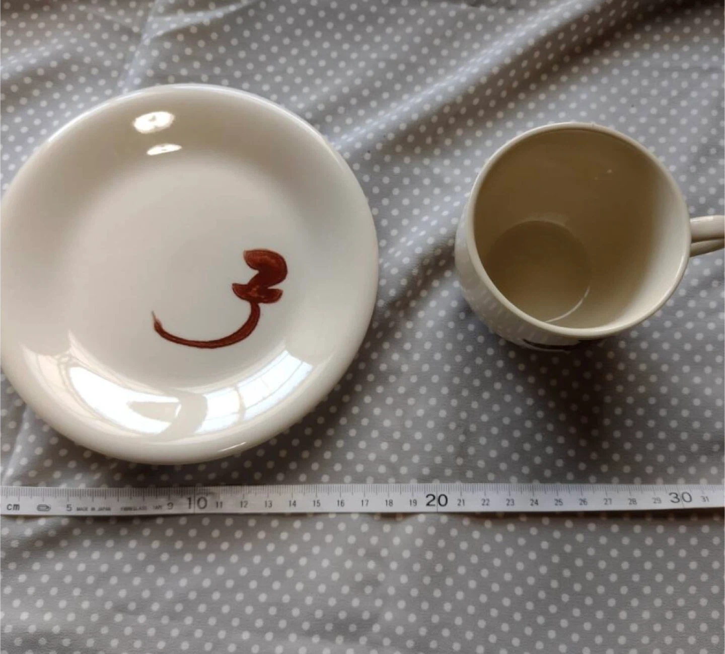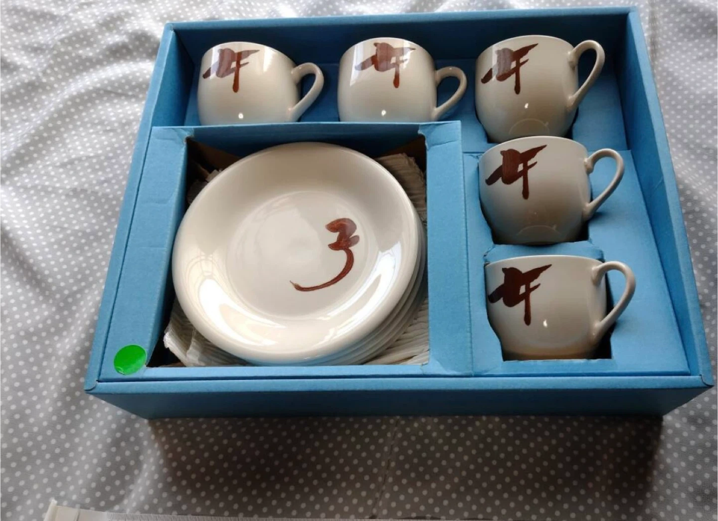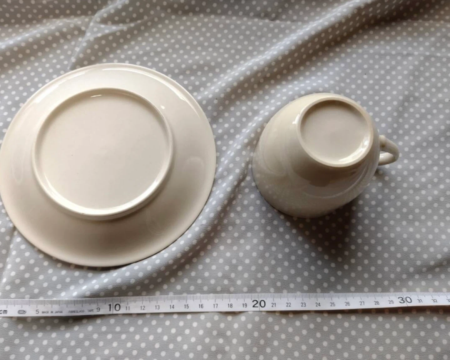 箱はボロいですが中身は未使用です カップ5個とソーサー5枚のセットです カップ高さ6.5cm 口直径7.5cm ソーサー直径16cm ソーサーにしてはサイズが大きいので皿かもしれません 箱は青の無地で何も書いてません ガムテープと伝票を直接貼って発送しますので箱はあまり期待しないでください 80サイズ5kg以下にて発送予定