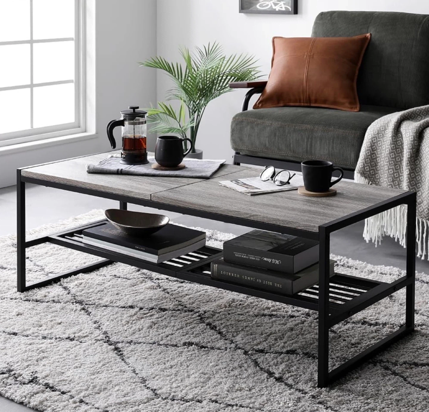 ローテーブルです ・サイズ:幅105cm x 奥行き80cm x 高さ45cm ・棚の高さ:約14.4cm ・天板までの高さ:約38cm ・色:グレー、ブラック ・状態:使用感少なめ 部屋の模様替えのために出品します。 お渡しの際は大まかに分解します。 ※六角レンチも付属します