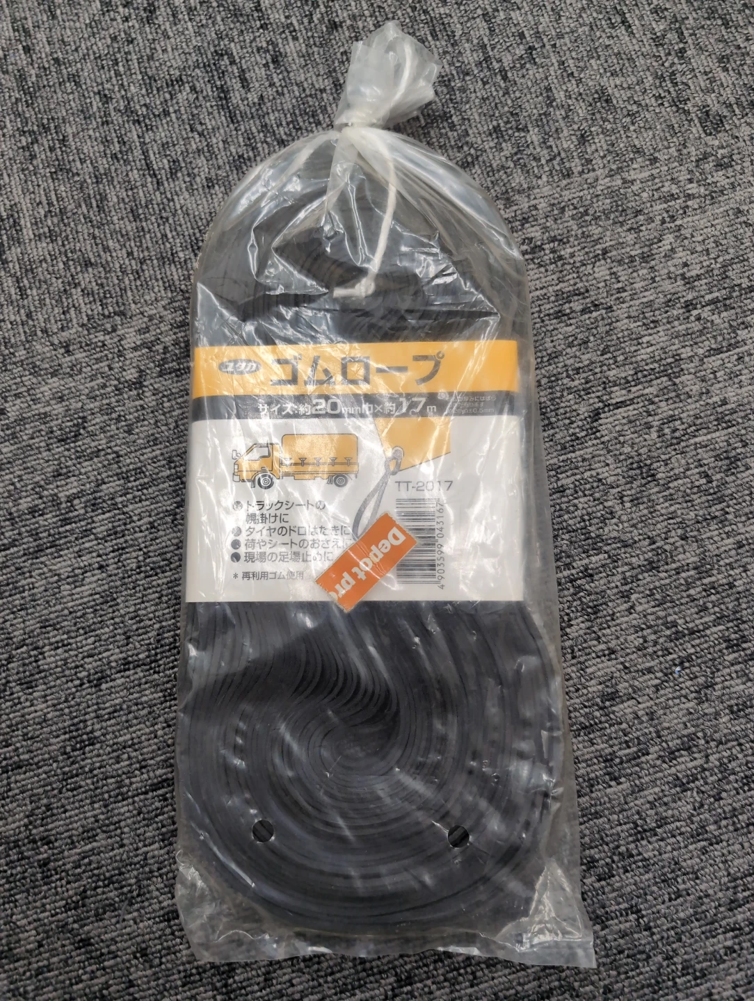 ゴムロープです。 ・サイズ:約20mm×約1.7m ・トラックシートの幌掛けに ・タイヤの泥はたきに ・荷やシートのおさえに ・現場の足場止めに ・型番: TT-2017 買って開けてもない新品の中古品であることをご了承ください。