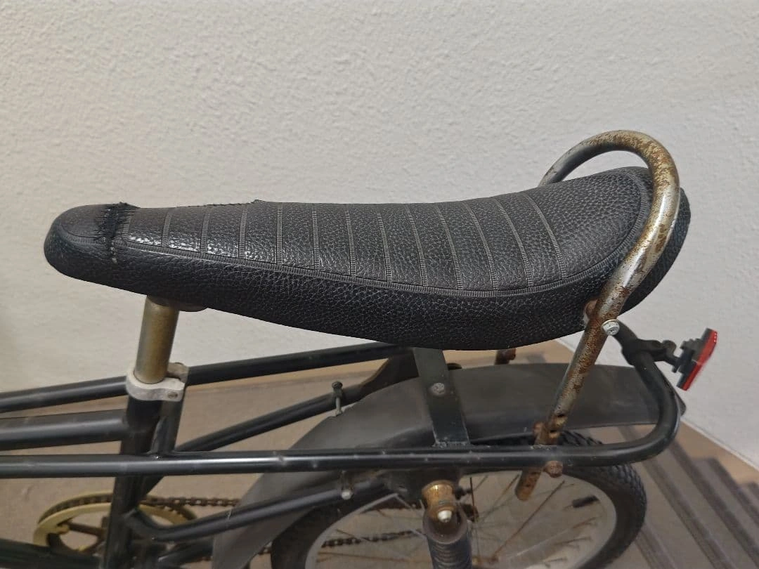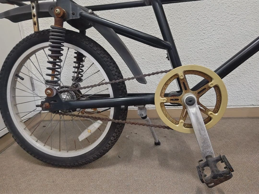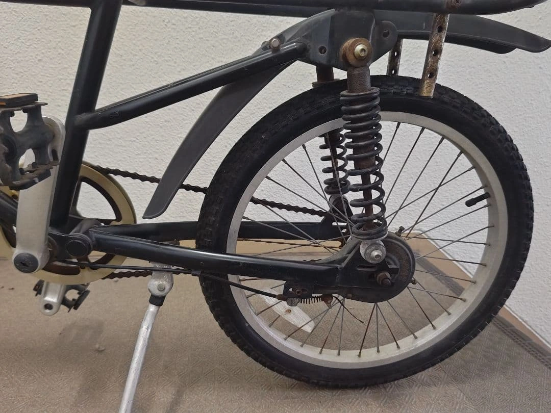 サウスベイ バハ BAJA MODEL SS ディスクブレーキ採用 約20年前に購入し、放置しておりました。当時別売りだったリアフェンダーもついております。 サドルの切れ割れが あり、無理やり補修してあります。その他サビ、汚れなどあります。ブレーキなど整備が必要なため、ジャンクとして出品いたします。状態については画像にて判断頂き、判断できない場合は購入をお控えください。 自転車の整備が自力で可能な方のご購入をお願いいたします。 大田区大森駅近辺で直接引き取り可能です。 防犯登録はしておりません。 特徴:'80年代の「ヤマハ・モトバイク」をイメージしたデザインの商品。前後のサスペンションとタンデム風のサドルを搭載。フレームワークが美しい、スタイリッシュな、シティバイクです。リヤのツインショックによりレトロなモーターサイクルを彷彿させるスタイルが個性的 タイヤサイズ...20インチ 変速機...なし ブレーキ..フロントディスク/リヤバンド センタースタンド フレーム素材...クロモリ