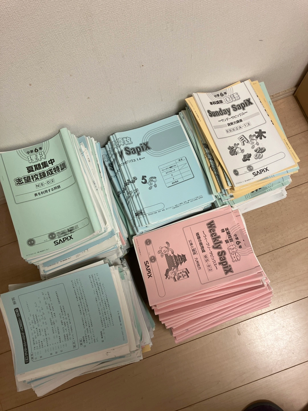 2021年度版の小学6年生のSAPIXのテキストです GS特訓やウィークリーSAPIX 夏期講習 サンデーSAPIX等オプションの講座のテキストです 全て揃っているかも分かりませんが通常授業以外の特訓講座等の物になります 捨てずにいたのですが、欠番があるかは確認出来ていません テキストなども全て6年生の物ですが整理整頓されておらずバラバラです 学校別授業は慶應早稲田のテキストが捨てずに入っておりますが、バラバラで整理されていません ご質問も簡単なものしかお答え出来ないので何卒ご了承ください 全部30kgで以上あり膨大な量です  自宅に取りにきて下さる方にお願いします 中身に関しては書き込みもありますし、欠番もあるかも知れませんがノークレームノーリターンでご理解頂ける方にお願い致します