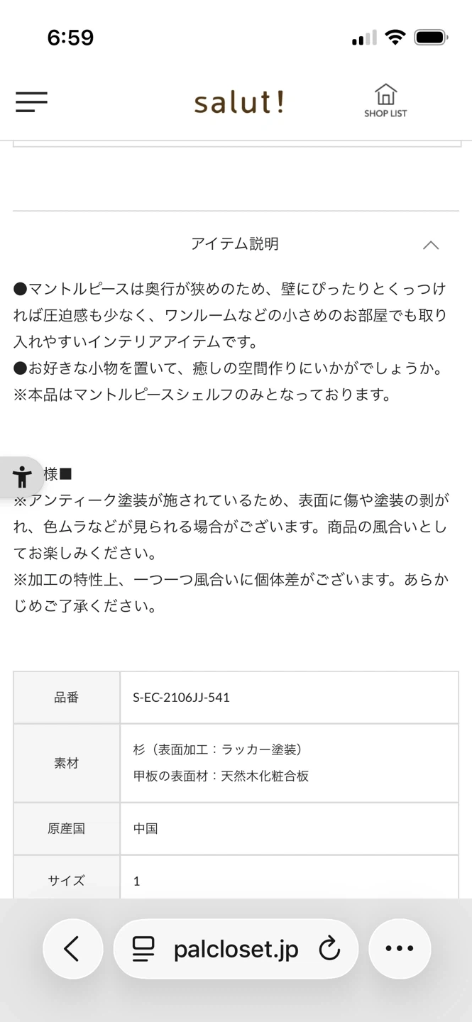 サリュのマントルピースシェルフです 【情報】 ブランド:サリュ 商品名:マントルピースシェルフ 品番:S-EC-2106JJ-541 サイズ:約幅65×奥行18×高さ70cm(上段)、約幅67×奥行20×高さ24cm(商品外装サイズ) 耐荷重:約20kg(上段)、約6kg(中・下段) 【状態】 使用感、キズ、塗装の剥がれがあります Salyuの商品はアンティーク塗装が施されているため、表面に傷や塗装の剥がれ、色ムラなどがあります。 中古品であることご了承ください 仕事をしている為お取引き曜日限りあります 他のサイトにも出してる為お取引き終了の可能性があります