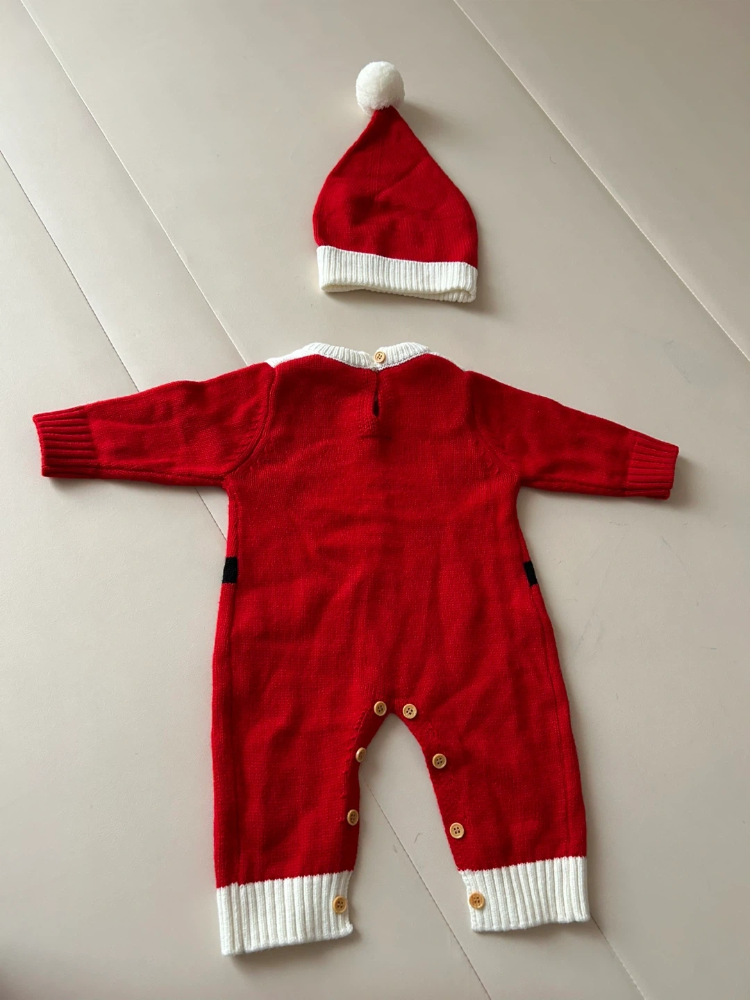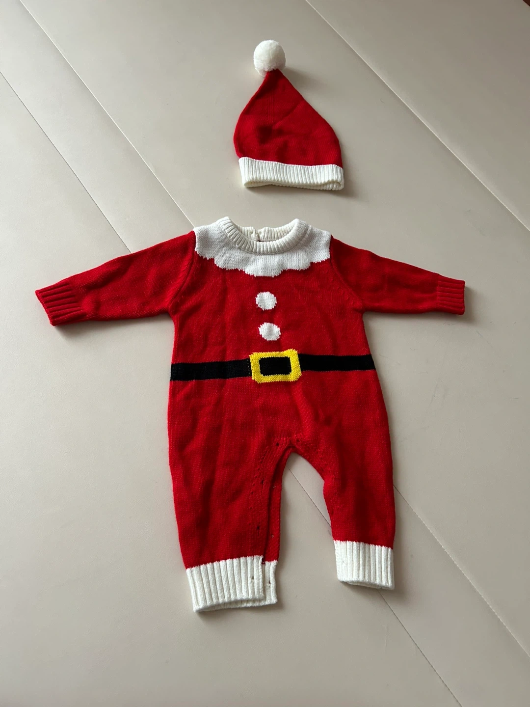 サンタクロースのベビー服です。 ・素材:100% アクリル ・中国製 ・サイズ:66 ・去年の冬、1回しか着用してないため綺麗です。 中古品であることをご了承ください。