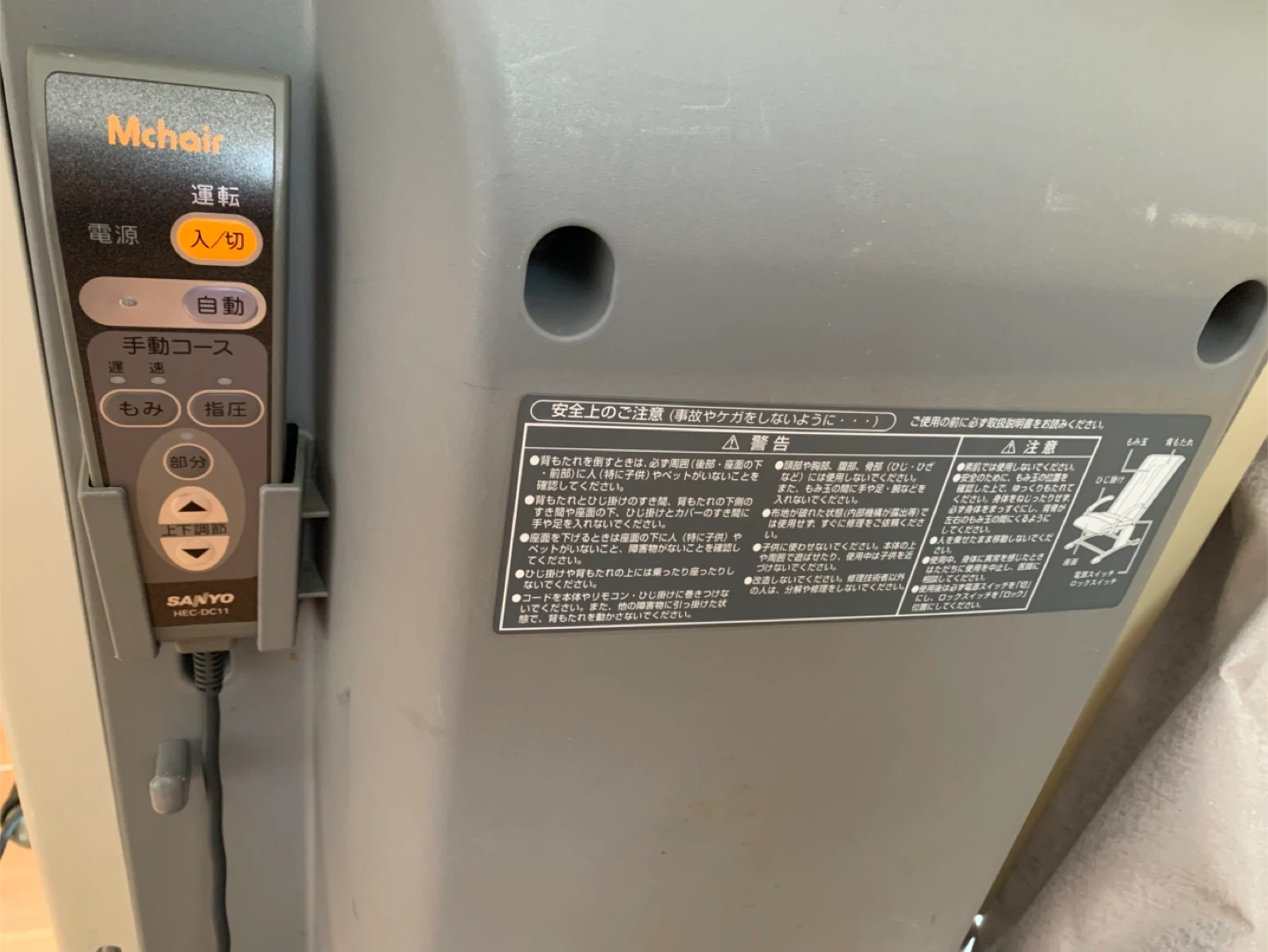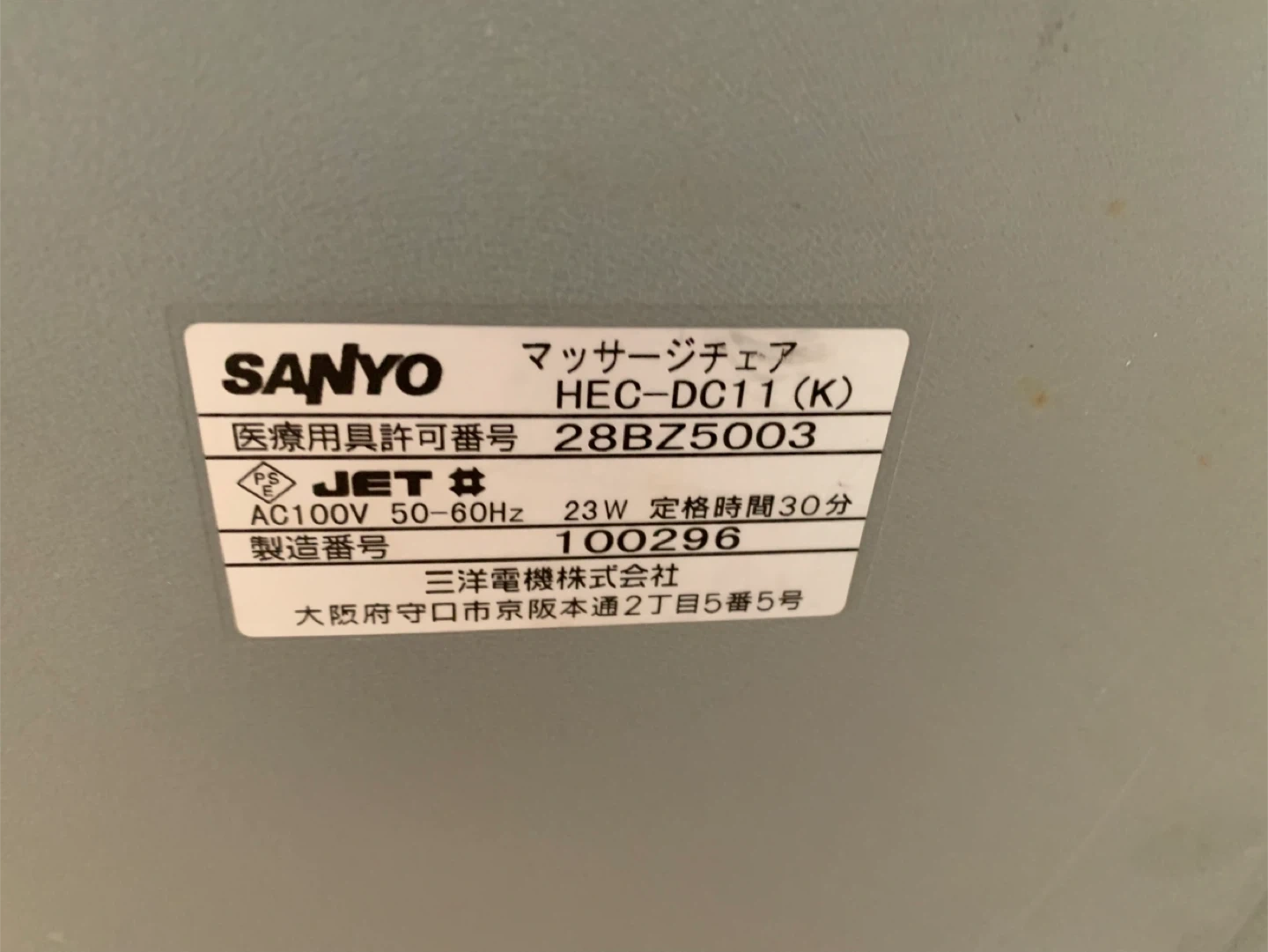 サンヨーのマッサージチェアです。 もちろんまだ正常に問題なく作動します。 マッサージチェアとしては小さめです。 幅65cm 奥行き125cm 高さ111cmです。 【情報】 ブランド:サンヨー 型番:HEC-DC11(K) 【状態】 使用感はありますが正常に動きます。 2 人で運べる重さですが お近くなら車で運びます。 平日なら火曜日 木曜日。 土曜日 日曜日も取り引き可能です。 ご不明点があればお気軽にご連絡ください。