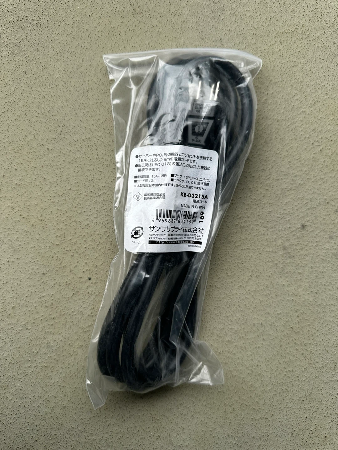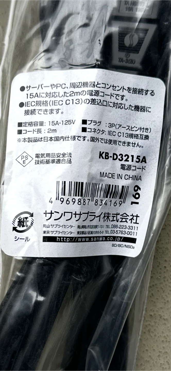 サンワサプライの電源コードです 現在在庫 数4ケ 単価700円 【情報】 ブランド:サンワサプライ 型番:K8-D32-5A 色:ブラック 未開封未使用 ●サーバーやしたこの電源コンセントを接続する 75Aに対応した2mの電源コードです。 ●EC規格(ECC1.3)の差込口に対応した機器に 接続できます。 ■定格容量:15A・125V ■コード長:2m ■プラグ:3P(アースピン付き) ■コネクタ:IEC C13規格互換 ※本製品は日本国内仕様です。国外では使用できません。 電気用品安全法 技術基準適合品 KB-D3215A 電源コード MADE IN CHINA サンワサプライ株式会社