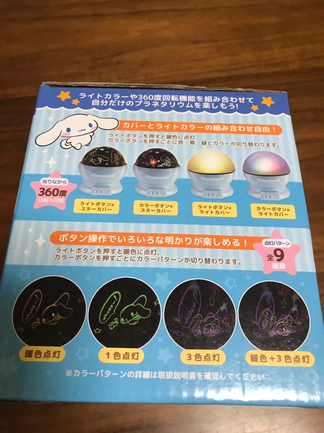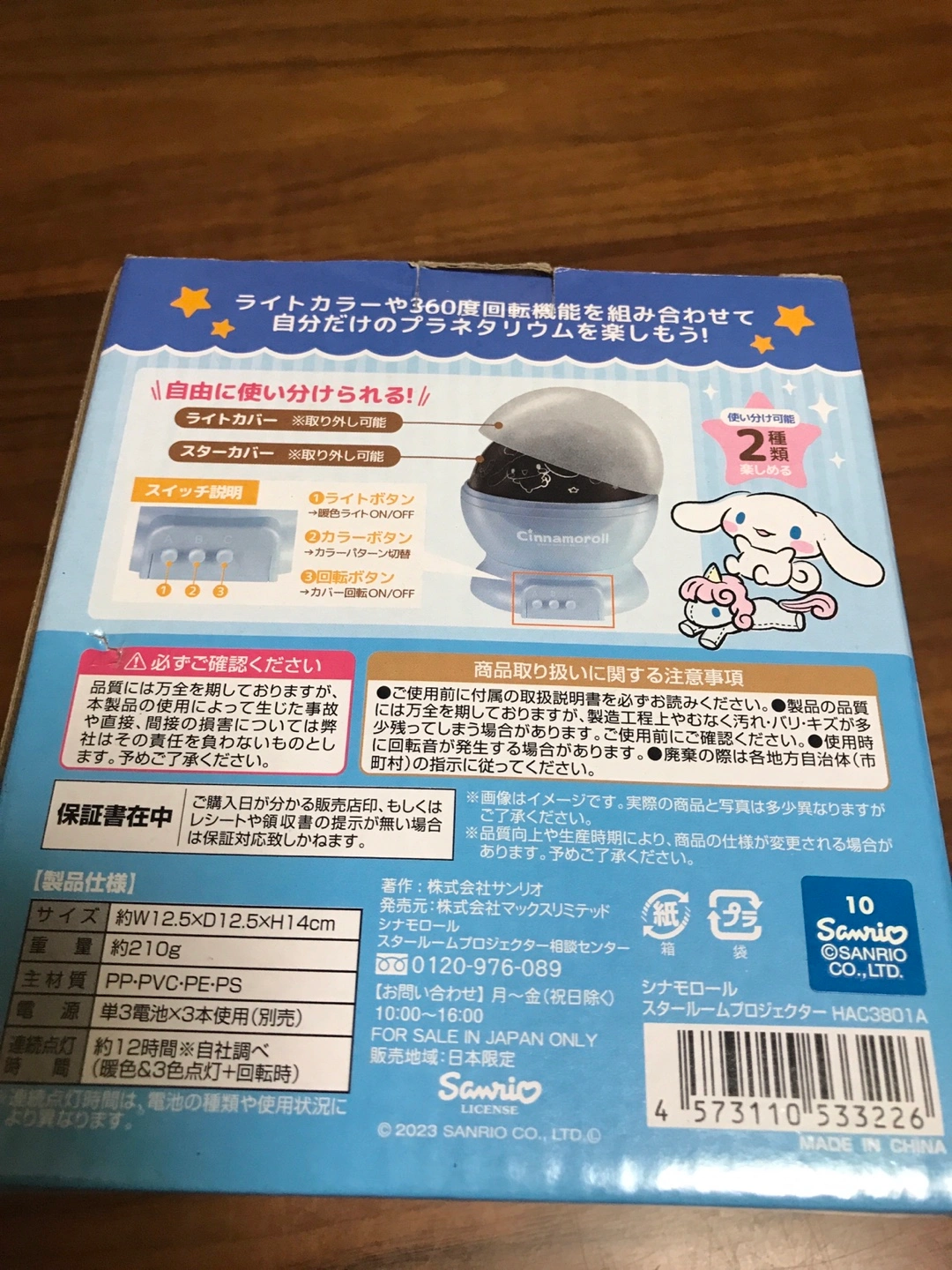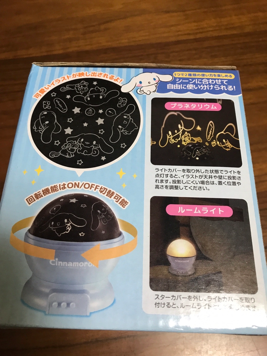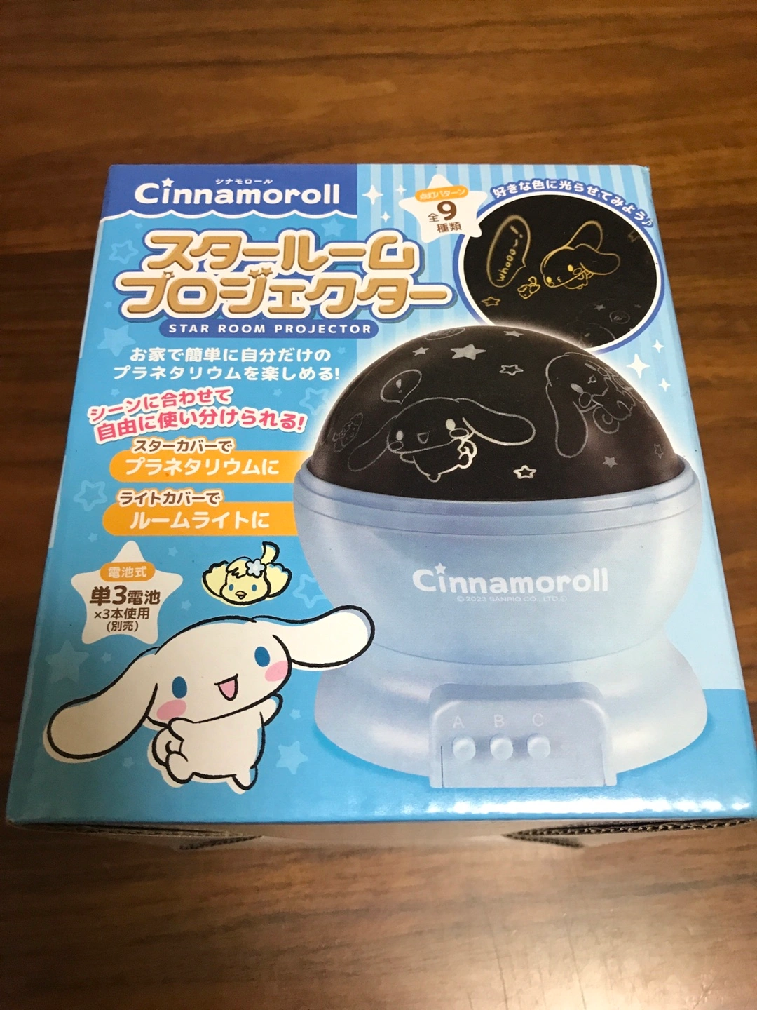 サンリオ、シナモロールのスタールームプロジェクターになります。自分だけのプラネタリウムを楽しめます。 プラネタリウム、ルームライトにもなります。 新品未使用ですが、箱はシールを剥がした跡があります。 電池は単3電池3本をご用意ください。