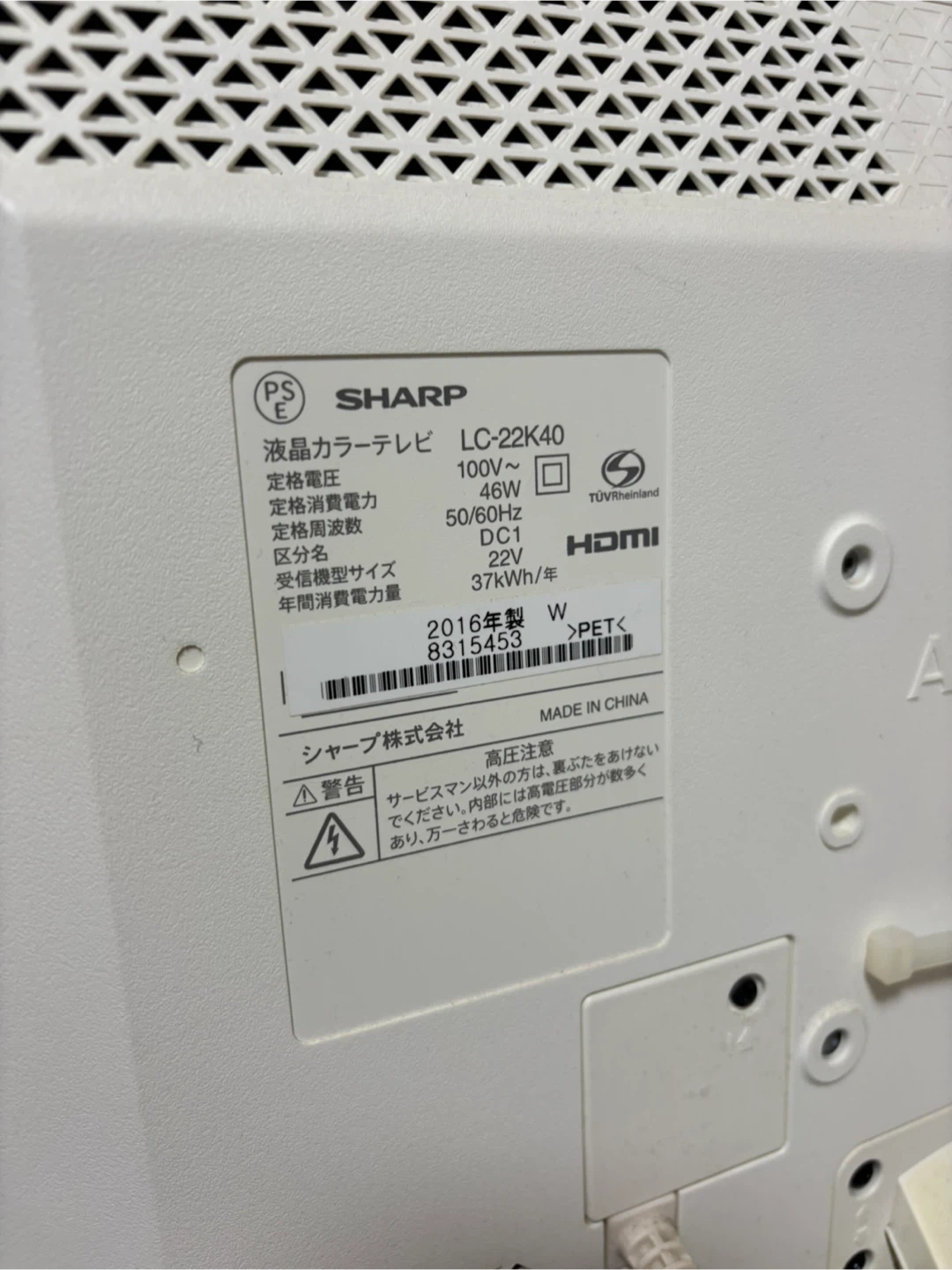 シャープの液晶カラーテレビです。 【情報】 ブランド:シャープ 型番:LC-22K40 年式:2016年製 【状態】 使用感あり 画面に傷がございますので、ご了承の上お願いします。 ご不明点があればお気軽にお尋ねください。