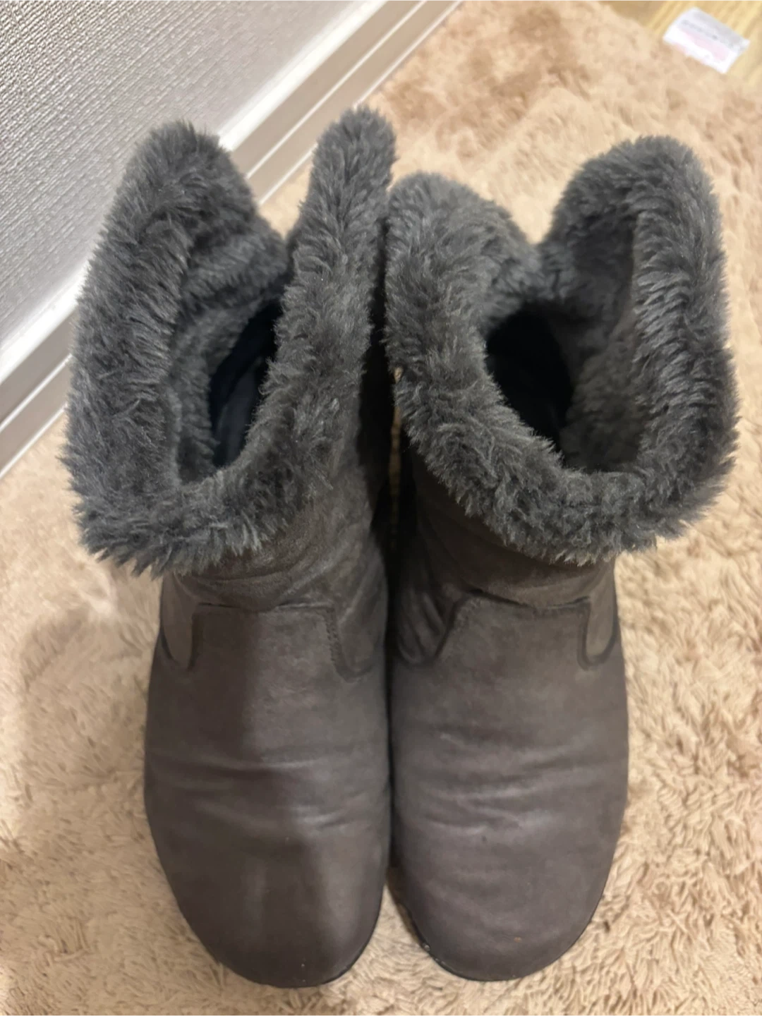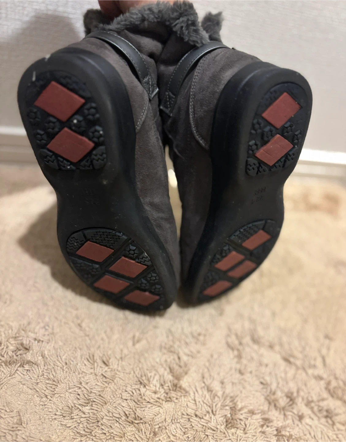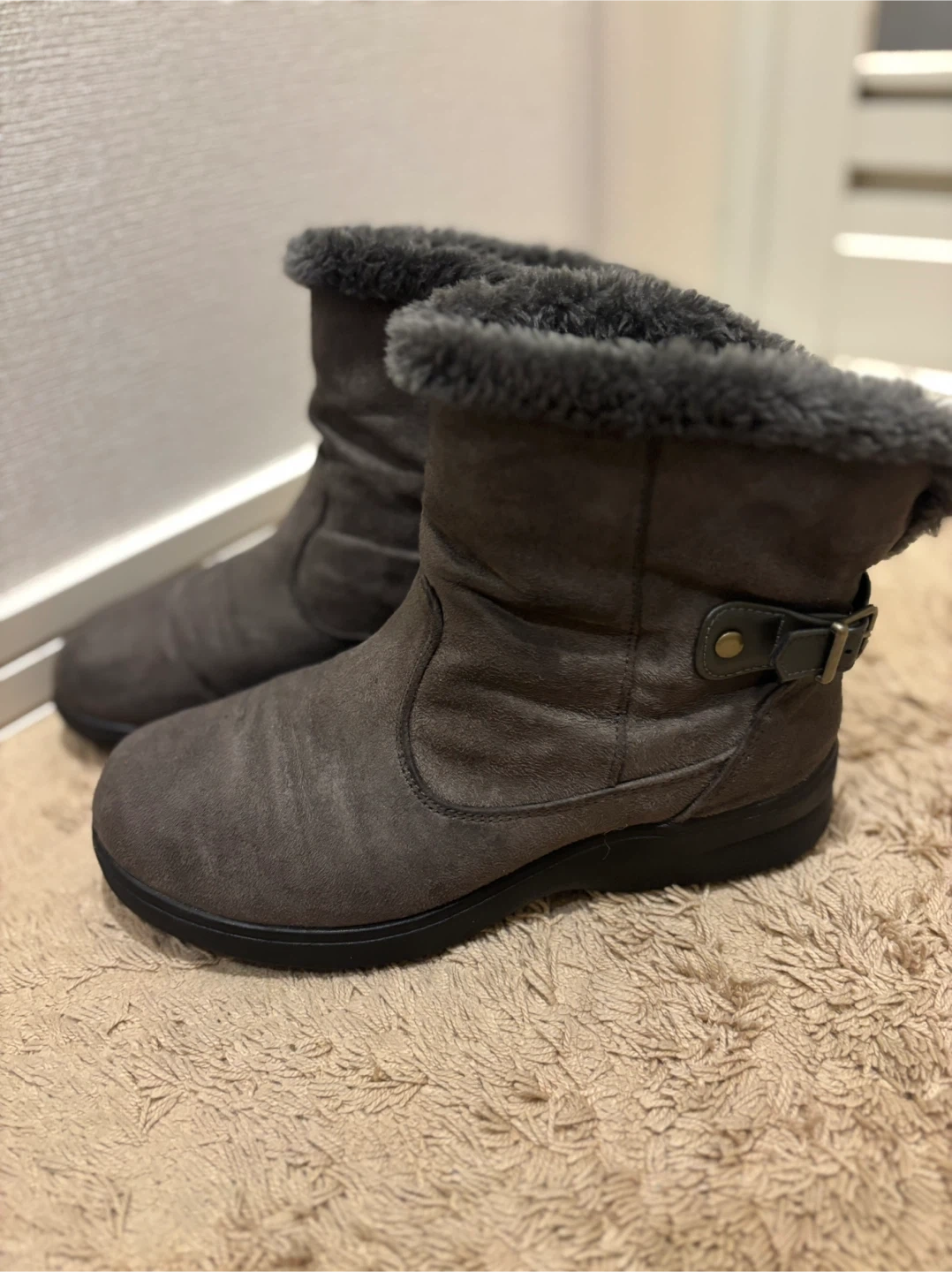 滑りにくい足裏加工のショートブーツです。 小雨にも対応 ・色:グレー ・素材:スエードのような素材 ・履き口にファーのデザイン ・サイズ:22.5cmEEEE ・小雨対応 やや使用感ありますが、かかとや裏の擦れも少なくまだお使い頂けそうです。