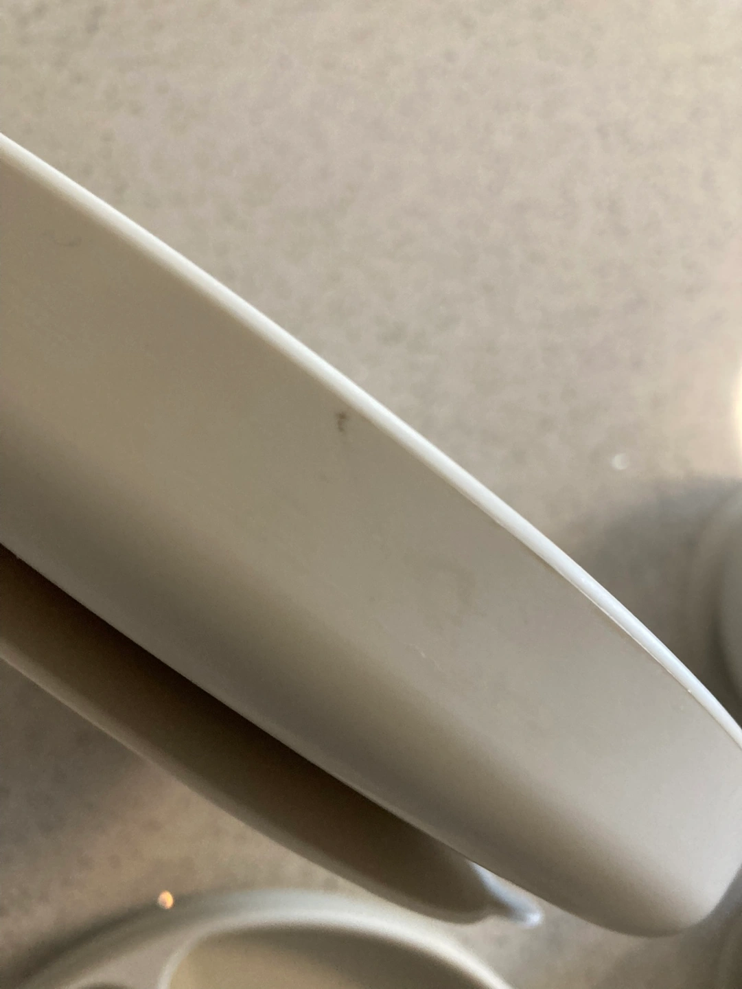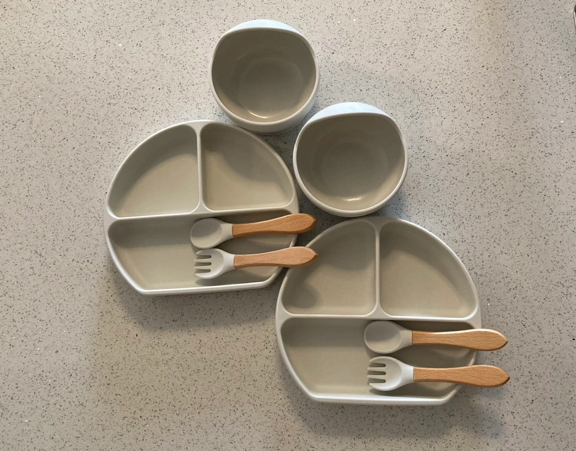 BabyGoo のシリコンお食事プレートです。(仕切り皿、深皿、スプーン、フォークの4点で1セットです。) 色はスモーキーホワイトですが、薄いグレーという色味です。 楽天で購入して、離乳食後期頃に4ヶ月くらい使用しました。 4点セットが2セットあります。 双子ちゃんやご兄弟にいかがでしょうか? 【購入価格】1セット2980円 【傷などの状態】 主に仕切りのあるプレートの方を使っていたので、深皿の方は2〜3回ほどしか使っていません。 大きな汚れや傷などはありませんが、1つの仕切り皿の外側に小さい黒いシミのようなものがありました。(写真4枚目) スプーンとフォークは未使用です。 スプーンフォークは大きさが大きいので実際に幼児に使うには不向きですが、やわらかくて安全なのでおままごとなどに使えると思います。 テーブルにピッタリくっつくので、少し目を離してもひっくり返されることがなく重宝しました。 仕切り皿もまん丸ではなく手前が直線になっているので、お皿と体を近づけることができて使いやすかったです。 大きさも小さくないので、離乳食から幼稚園頃まで長く使えると思います。