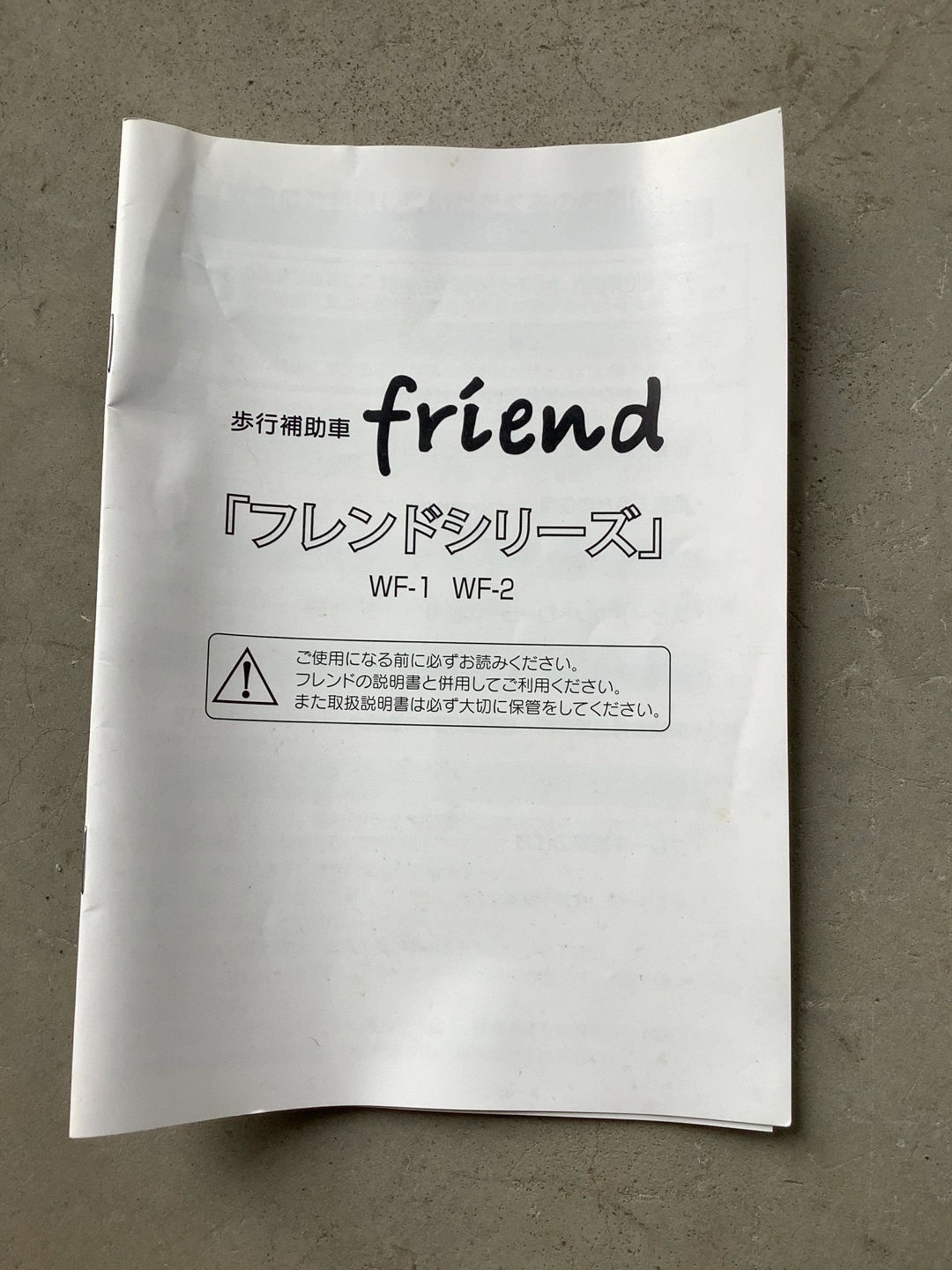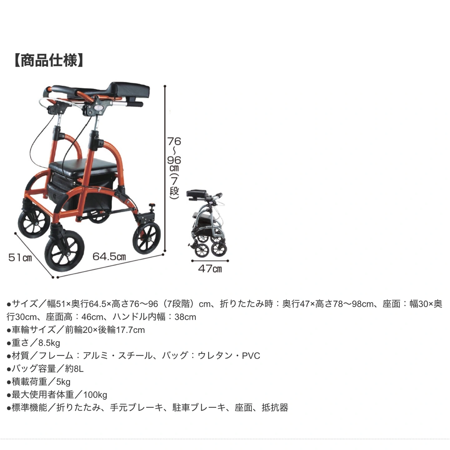 【情報】 種類:歩行補助車 型番:WF-1 サイズ:幅51×奥行64.5×高さ76~96cm(7段階)、折りたたみ時:奥行47×高さ78~98cm、座面:幅30×奥行30cm、座面高:46cm、ハンドル内幅:38cm 車輪サイズ:前輪20×後輪20×後輪17.7cm 重さ:8.5kg 材質:フレーム:アルミ・スチール、バッグ:ウレタン・PVC バッグ容量:約8L 積載荷重:5kg 最大使用者体重:100kg 標準機能:折りたたみ、手元ブレーキ、駐車ブレーキ、座面、抵抗器