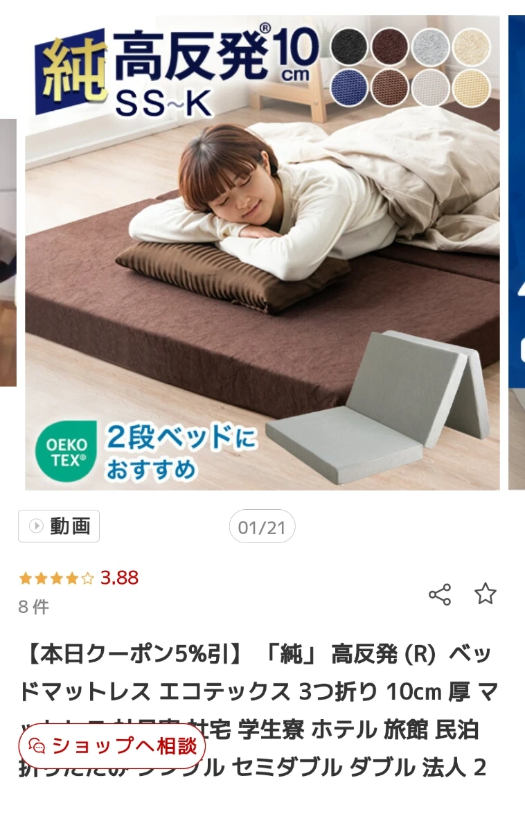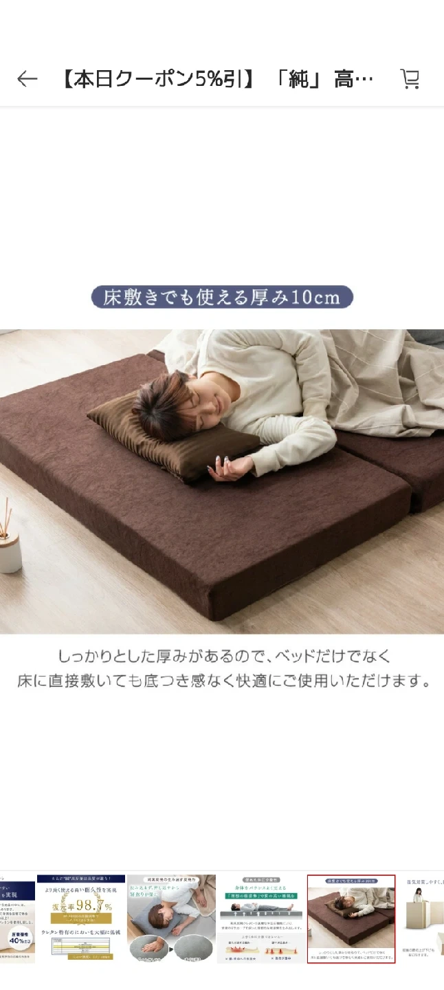 今年2月に楽天で新品購入し一ヶ月ほど使用。 その後はクローゼットで保管していました。 高反発マットレスです。 来客用にいかがでしょうか。 ・カラー:ブラウン ・厚さ:10cm ・3つ折り ・コンパクト収納 かなり美品だと思いますが中古品であることをご了承ください 自宅マンション前まで取りに来て頂ける方のみお願いします。※引き渡しが確定した際に場所をお伝えします。