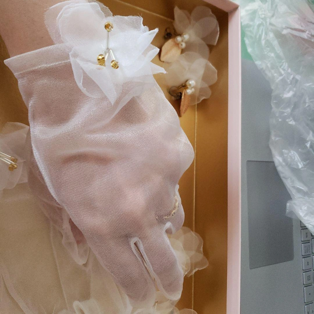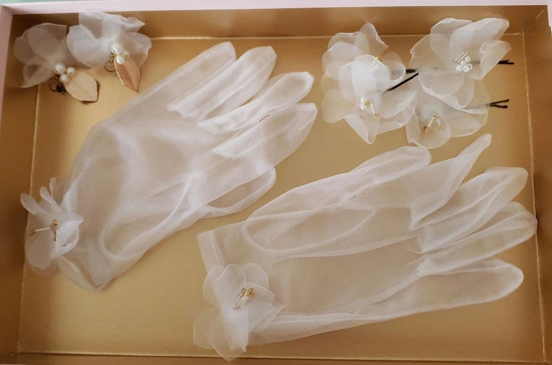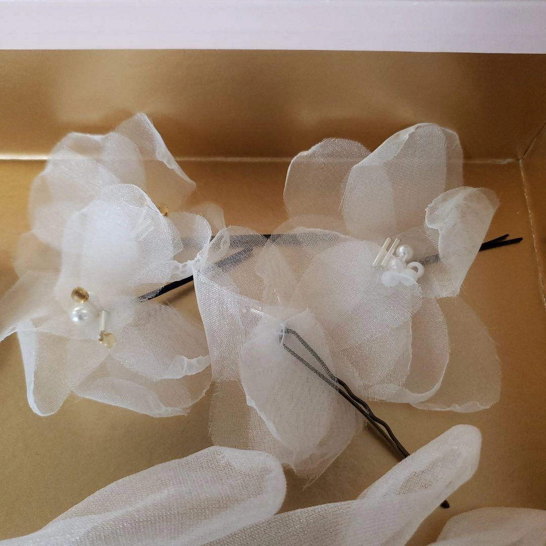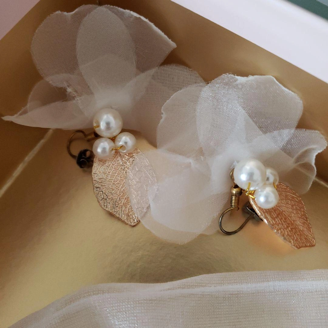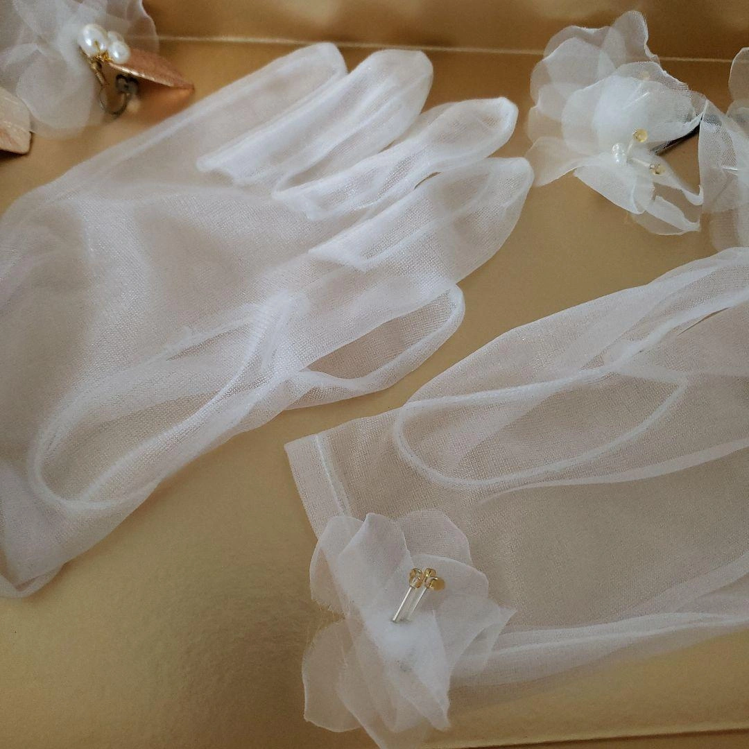 ビーズとオーガンジーの花のモチーフのついたセットです。とても繊細な作りでかわいいです。 結婚式の1回使用したのみで、とても綺麗な状態です。ご希望の方はお気軽にご連絡ください。