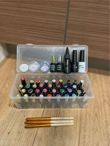ジェルネイルのセットです。 ライトは付きませんので別途ご用意ください。 残量はおおよそ8割程だと思います。 ▼内容▼ ネイルブラシ(ネイル工房) フレンチ#6 ラウンド、ミディアム#5 ブラシクリーナー ネイルタウン ギャラクシー05(マグネット) キャリー ベースコート、トップコート セリアジェル ▼カラー スモーキーピンク、ベイクドピンク、ミスティピンク、ネオンピンク、コーラル、ベージュ、ミルキーベージュ、スカーレット、マゼンタ、レッド、バイオレット、マスタード、ディープグリーン、ミント、マイルドカーキ、ネイビー、ブルー、ミルキーブルー、デニムブルー、グレー、ニュアンスグレー、ダークブラウン、ブラック、ホワイト、(24本) ▼ラメ  ゴールド、グリッターシルバー、シルバー、グリッターグリーン、グリッターブルー、オーロラ、ダークパープル、シャイニングベージュ、マゼンタ、(9本) ▼パール シナモンベージュ ▼ベース ノンワイプマットコート、トップ&ベースコート ▼パーツ 花柄シール、オーロラフィルム ご希望の方はお気軽にご連絡ください。