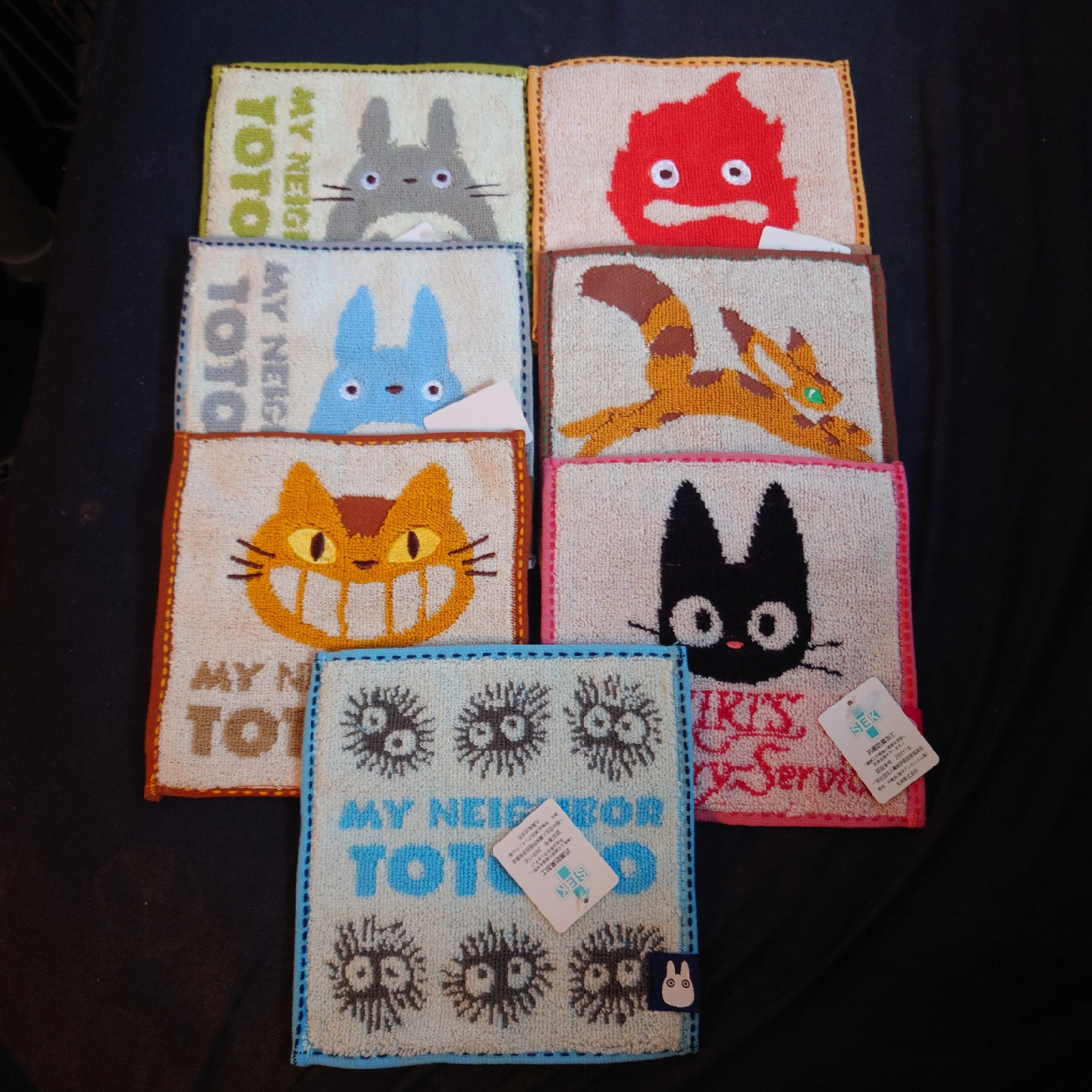 ジブリのハンカチセット ×7 新品です。 ・魔女の宅急便 キキ ・となりのトトロ 青、黄緑 ・ナウシカ テト ・となりのトトロ ネコバス ・となりのトトロ クロスケ ・ハウルの動く城 カルシファー