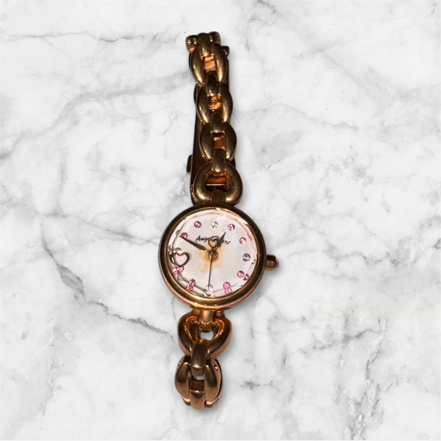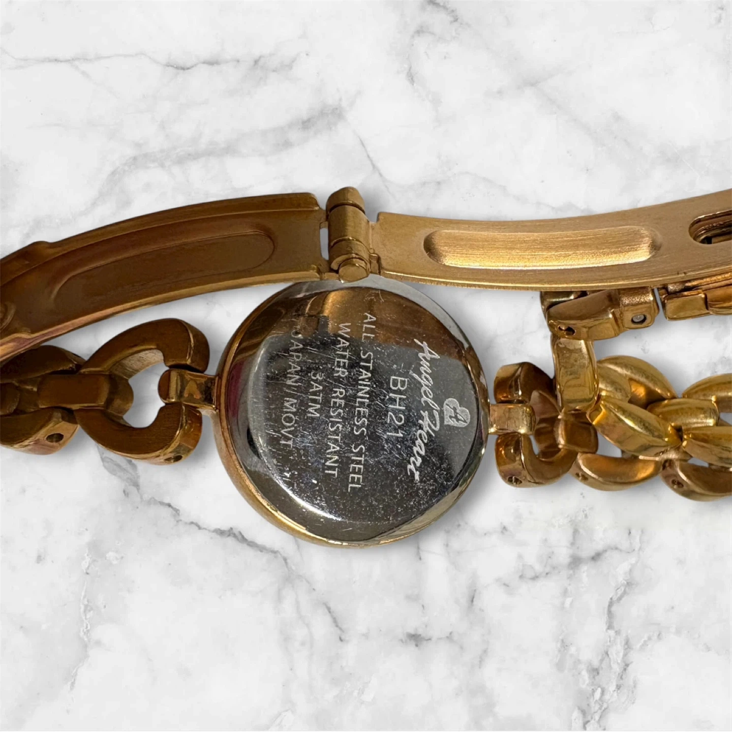 エンジェルハートの腕時計です。 ・ブランド:エンジェルハート ・文字盤カラー:白 ・ベルトカラー:ゴールド ・「Angel Heart BH21」の刻印あり ・生活防水 ・日本製ムーブメント 他の物とセットでお安くします。 配達可◎場所により追加料金を頂く場合がございます。 お気軽にお問い合わせ下さい☺︎