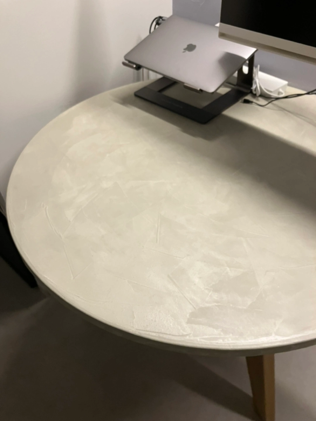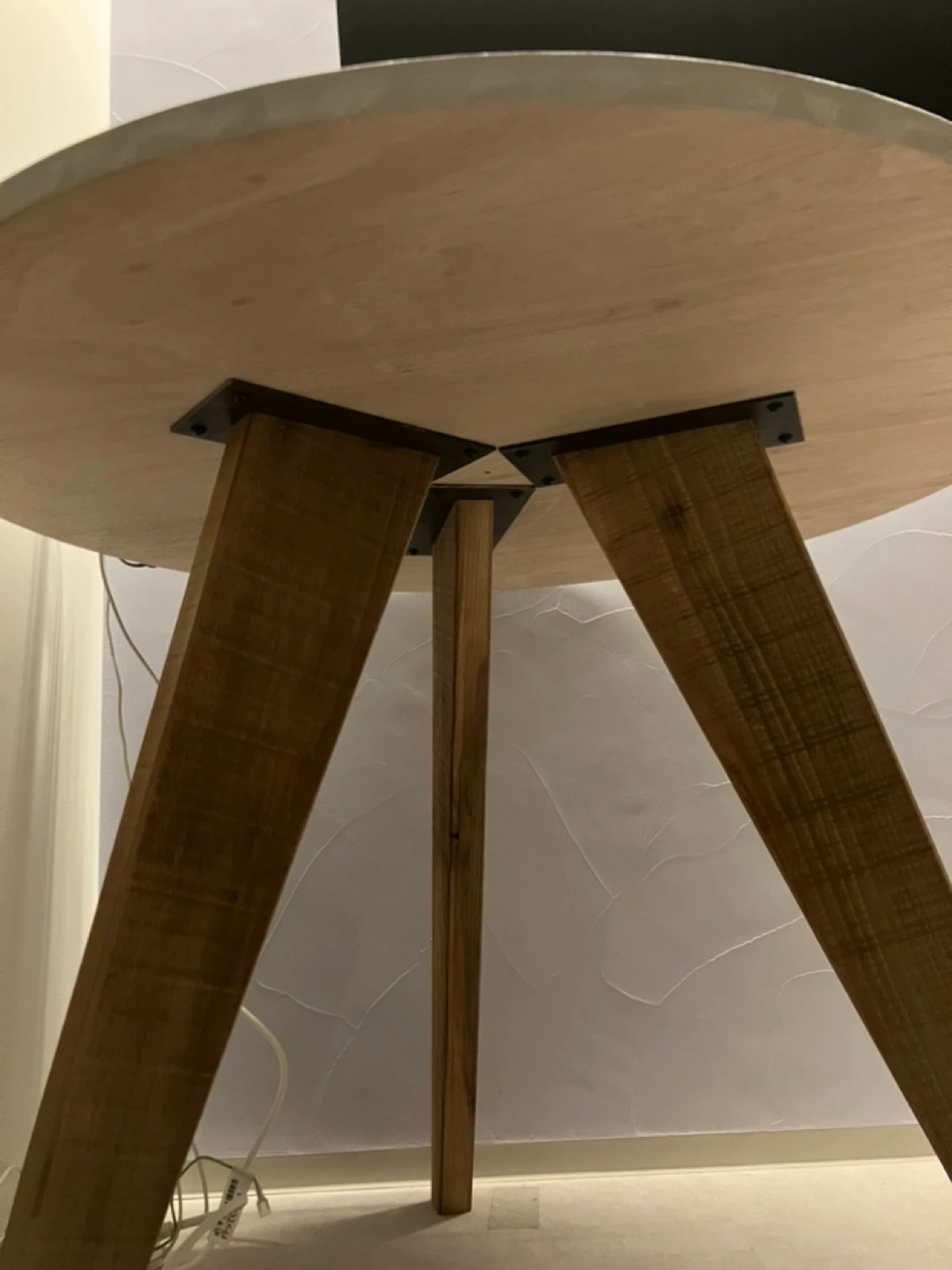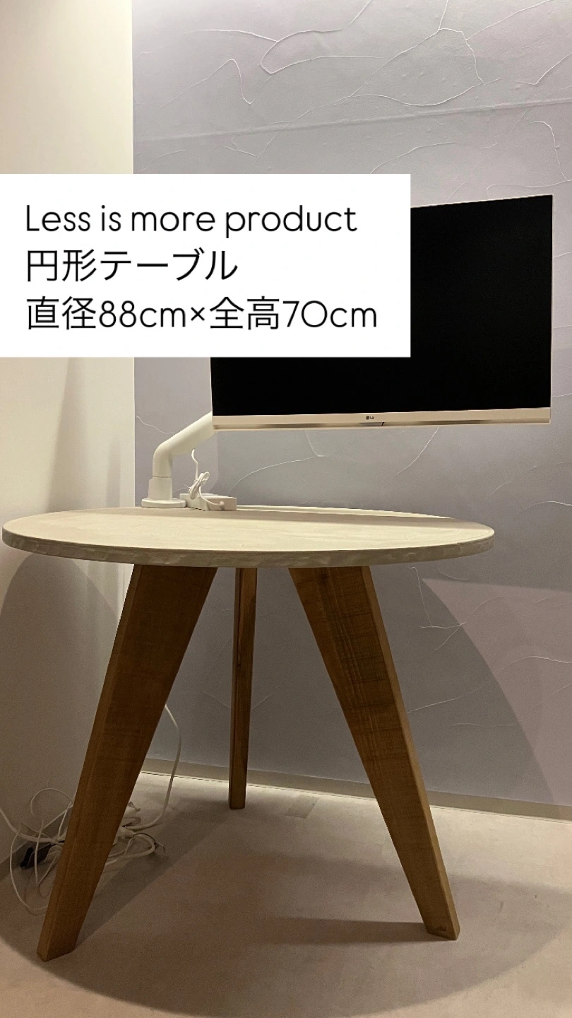 [出品背景] 新築後一時的なテーブルとして購入しました。 1ヶ月ほどしか使っていないので、新品同様ですが 古材を使ったデザインですので、味があります。 他であまり見ないサイズ感もポイントで、 1-3人程度のダイニングテーブルとして、ちょうどいいサイズ感です。 [商品詳細] ヴィンテージ仕様のため、鋸目やヤスリの跡が残してあります。 品 目:ラウンドテーブル サイズ:直径88cm×全高70cm 素材:薄塗りモルタル|板厚:2.5cm|木部塗装:オイルステイン+ウレタンニス モールテックスではなく薄塗りモルタルです。イミテーション塗り材の風合いが苦手な方にもおすすめです。 天板の素材···その他 [その他] 脚は外せます。 モニターアームをつけていた所に跡がついているため、(最後の写真参照)直せる方や気にならない方、お買い求め下さい。 部屋まで階段8段ほどありますが、重くないテーブルなのでお一人でも大丈夫かと思います。