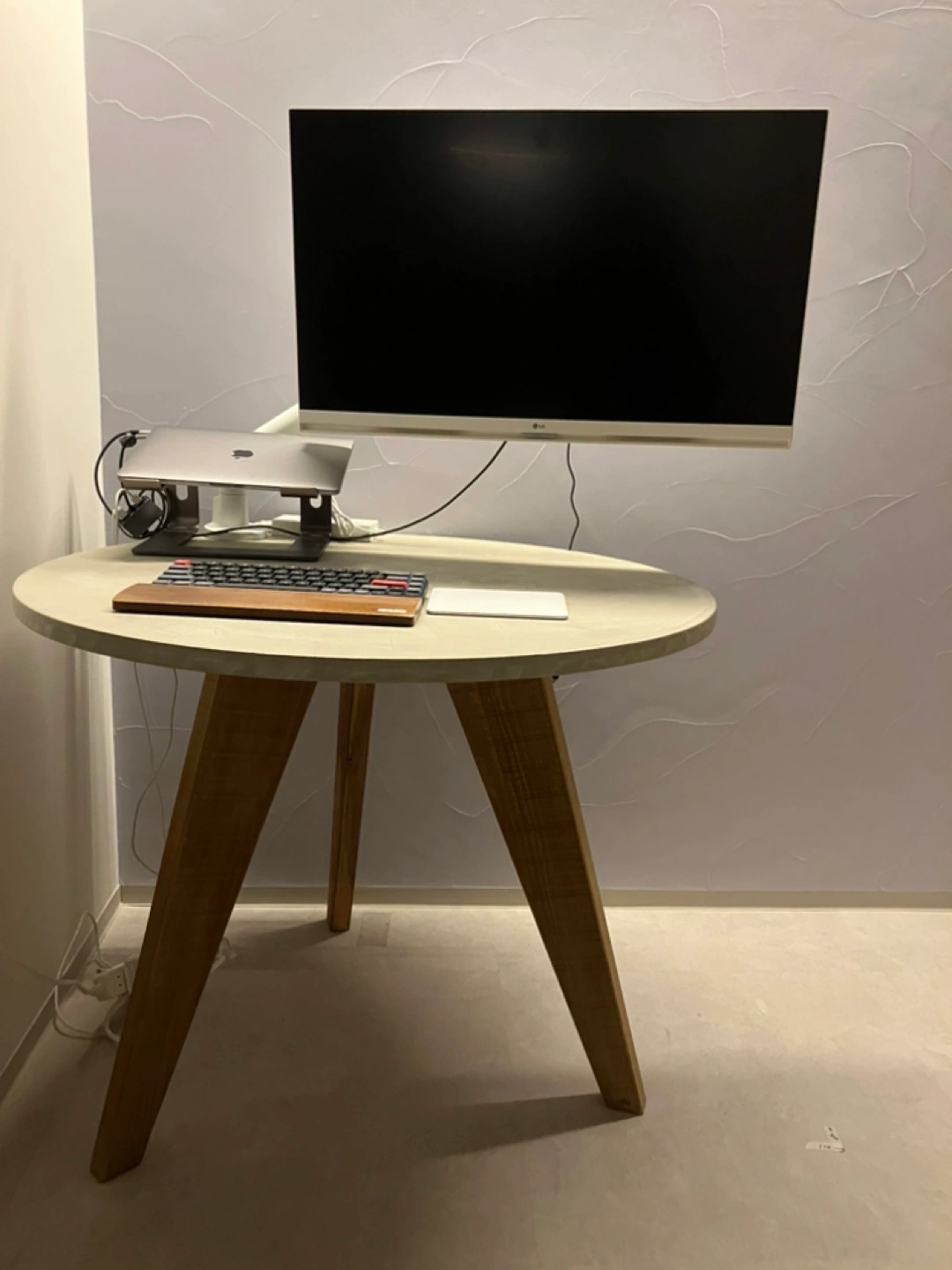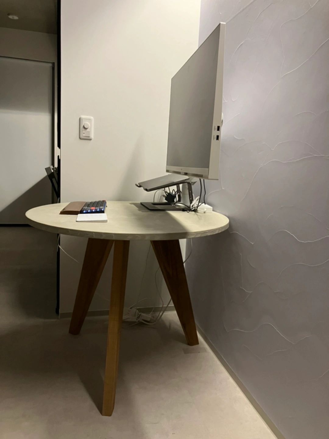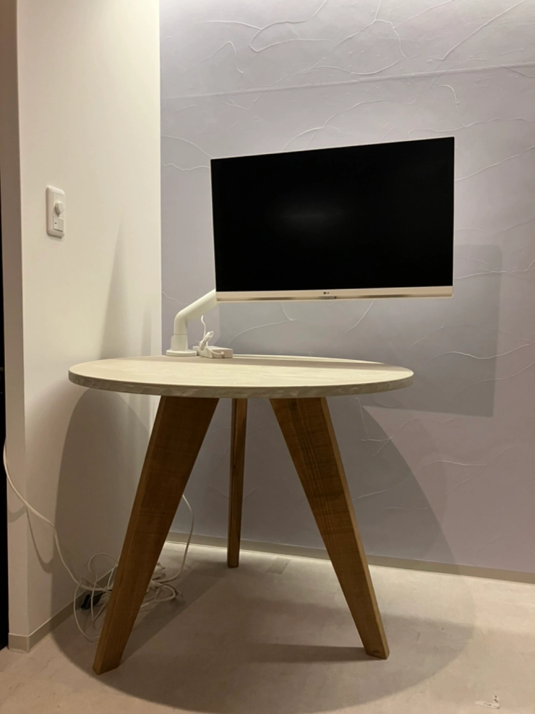 [出品背景] 新築後一時的なテーブルとして購入しました。 1ヶ月ほどしか使っていないので、新品同様ですが 古材を使ったデザインですので、味があります。 他であまり見ないサイズ感もポイントで、 1-3人程度のダイニングテーブルとして、ちょうどいいサイズ感です。 [商品詳細] ヴィンテージ仕様のため、鋸目やヤスリの跡が残してあります。 品 目:ラウンドテーブル サイズ:直径88cm×全高70cm 素材:薄塗りモルタル|板厚:2.5cm|木部塗装:オイルステイン+ウレタンニス モールテックスではなく薄塗りモルタルです。イミテーション塗り材の風合いが苦手な方にもおすすめです。 天板の素材···その他 [その他] 脚は外せます。 モニターアームをつけていた所に跡がついているため、(最後の写真参照)直せる方や気にならない方、お買い求め下さい。 部屋まで階段8段ほどありますが、重くないテーブルなのでお一人でも大丈夫かと思います。