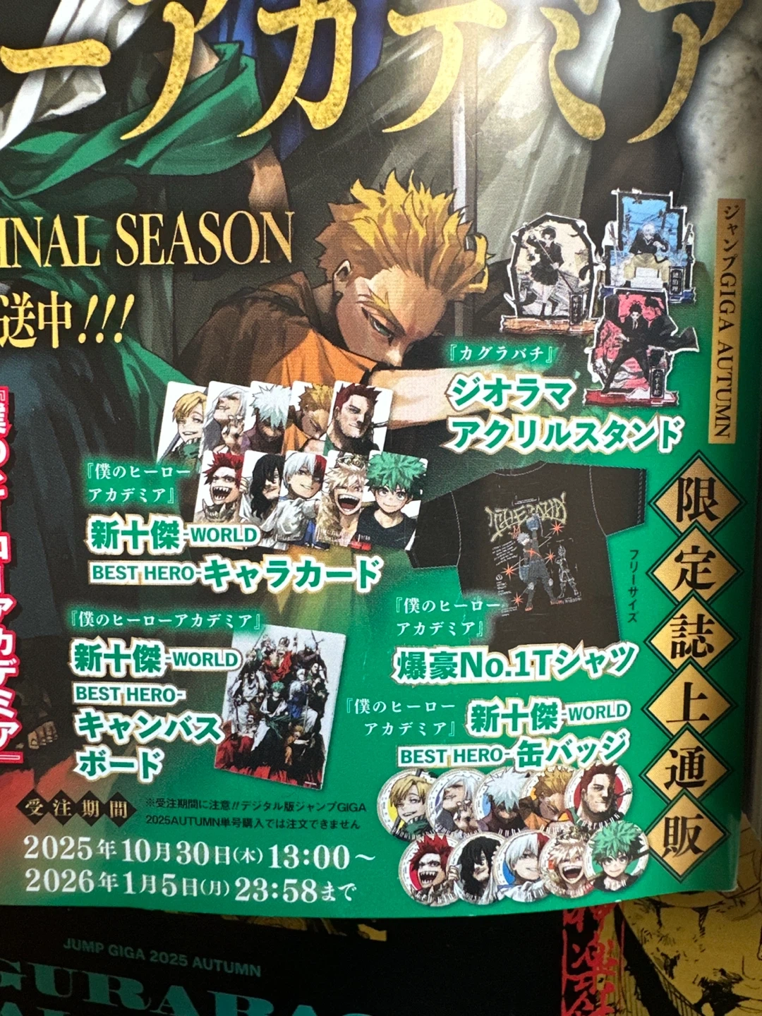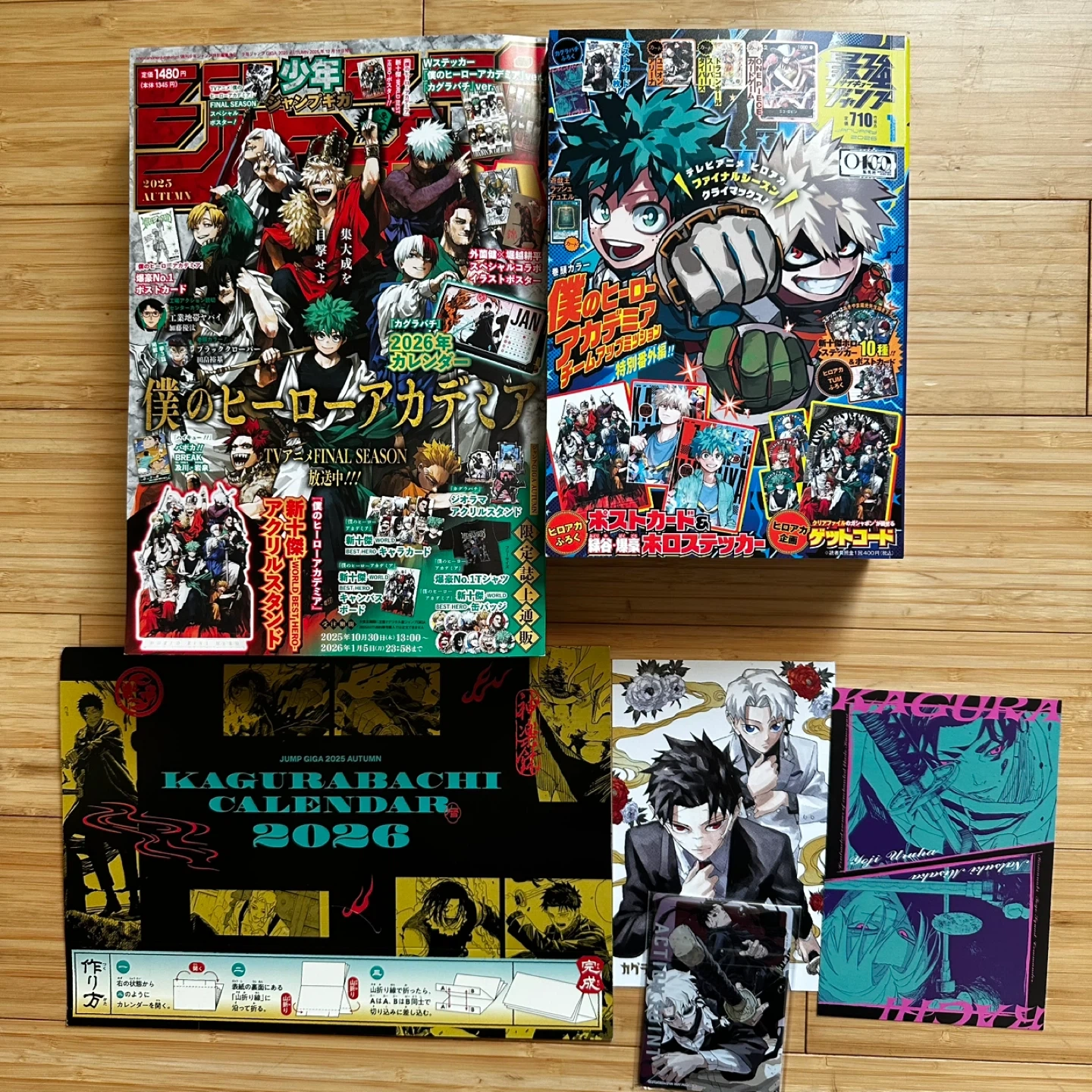 少年ジャンプGIGA(2025 AUTUMN) 最強ジャンプ 2026年1月号 2冊セットです。 ヒロアカ付録とハイキューのバボカ、ONEPIECEカードは付きません。 下記付録のみお付けします。 少年ジャンプGIGA ・カグラバチステッカー(ヒロアカは無し) ・カグラバチ×ヒロアカ作者コラボポスター ・カグラバチ2026年 カレンダー (・ジャンプGIGA AUTUMN誌上通販シリアルコード(未使用)) 最強ジャンプ ・カグラバチ ユニオンアリーナカード ・カグラバチ ポストカード2枚 ・ドラゴンボールスーパーダイバーズカード ・遊戯王ラッシュデュエルカード (・ヒロアカ クリアファイルゲットコード) 値段交渉は大幅で無ければ可能です。