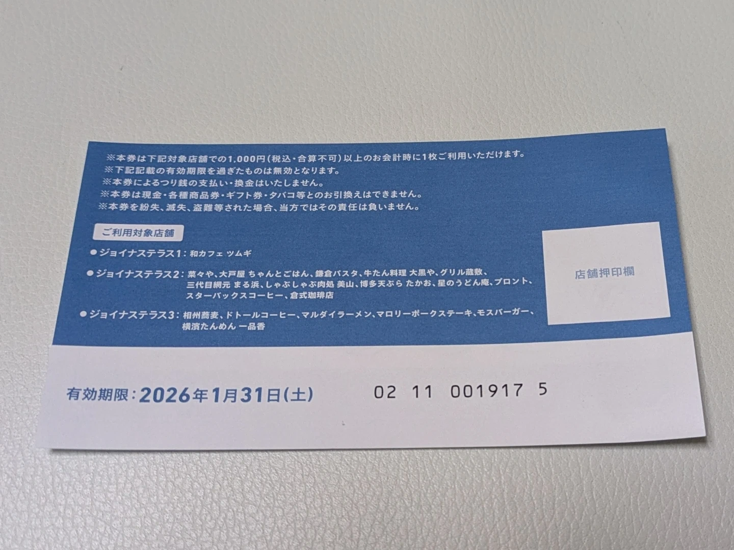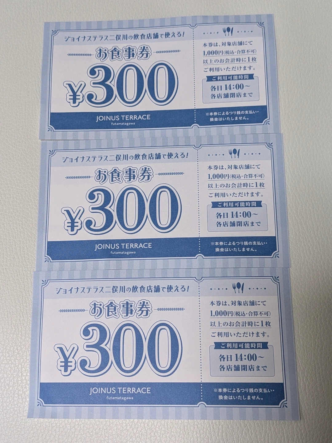 ジョイナステラスのお食事券300円券です。 ・300円券のお食事券 ・ジョイナステラス二俣川の飲食店舗で使用可能 ・1,000円以上の会計時に1枚利用可能 ・利用可能時間:14:00~各店舗閉店まで ・有効期限:2026年1月31日 欲しい方ご連絡ください。