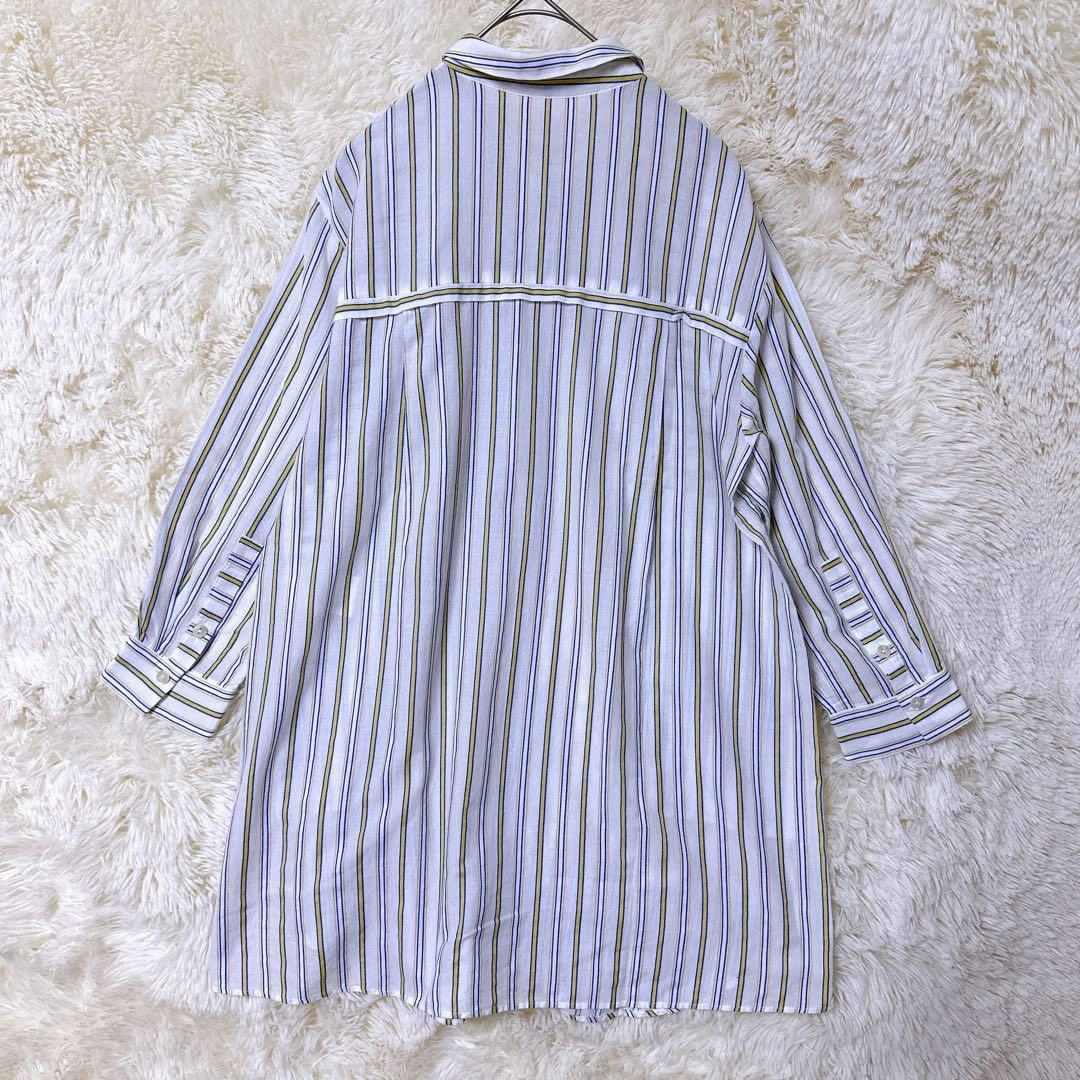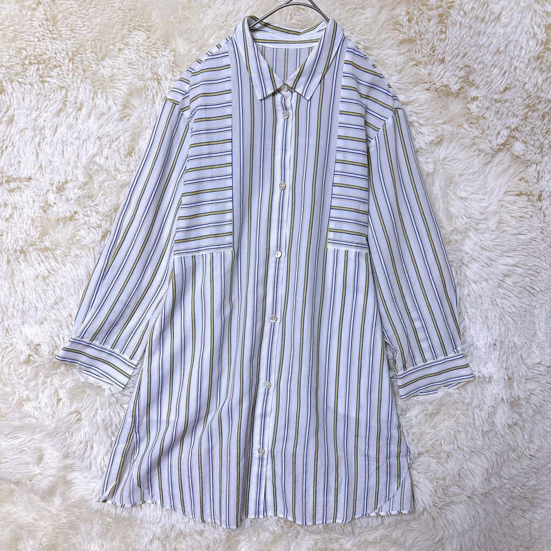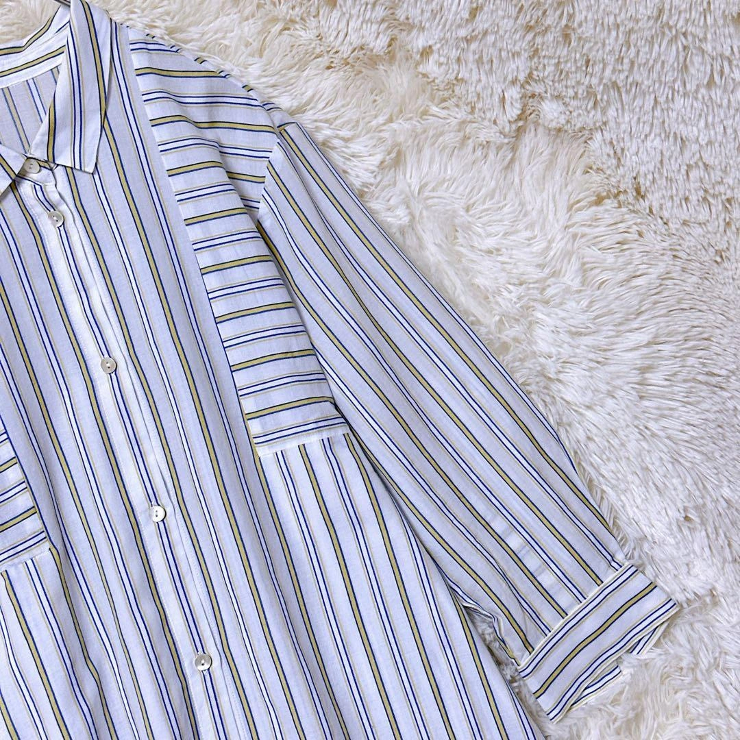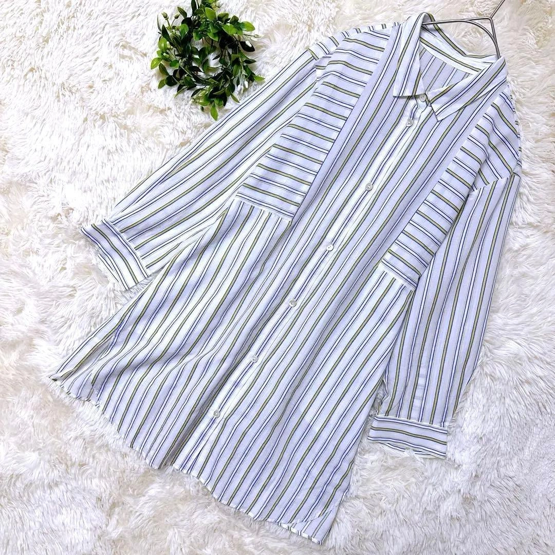 ストライプデザインの長袖ボタンシャツです。前面にポケットがあります。 写真にてご確認ください。 着丈:72cm 身幅:47cm 肩幅:41cm 袖丈:44cm 素材はコットン、カラーはストライプ(青、白、緑)です。 ご質問等ありましたら、購入前にお願いいたします。 ご希望の方はお気軽にご連絡ください。