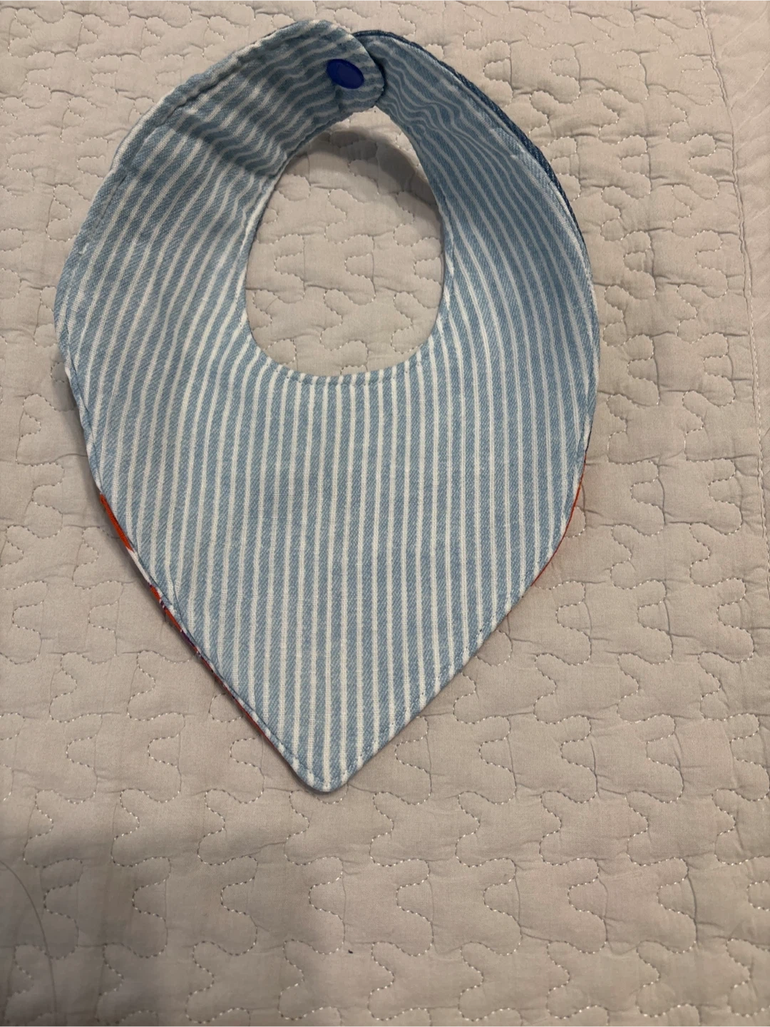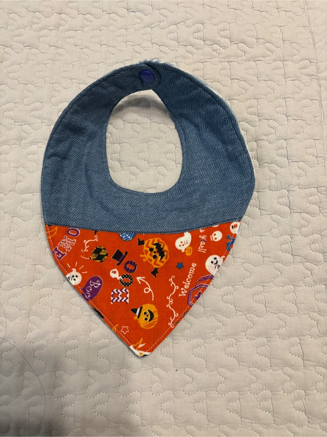 *ハンドメイド* 【スタイ★リバーシブル ハロウィン柄×青ストライプ】 《リバーシブルで、普段使いもできます》 *サイズ ・首まわり 約27㎝ ・首下 13 ㎝ ・幅 16㎝ *ダブルガーゼ × 綿1 *プラスチックスナップボタンを使用です。 (取外しの際は、丁寧に取扱いください) *ドミット芯を入れてありますので、肌触りソフトです。 *よだれふき・食事の際、リバーシブルで使えます。 【洗濯】 ・ネットにお入れするか、手洗いをしてください。 ・乾燥機のご使用はお避けください。 ・アイロンで、形を整えてください。 * 心を込めて一つ一つお作りしていますが、ハンドメイドですので、縫い目のズレや歪み等、ご理解の上お願い致します。