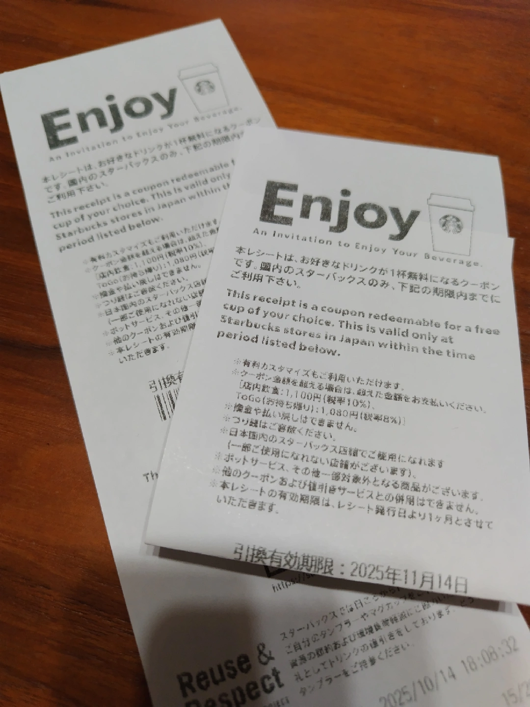 スターバックスのドリンク引換券です。 ・有効期限:2025年11月14日 ・国内のスターバックス店舗でのみ利用可能 ・お好きなドリンクが1杯1100円分無料 1枚650円で1100円分楽しめます フラペチーノをベンティサイズで色々カス タムするとお得です。 ⚠️お値下げ不可 受け渡しはアピタテラスか綱島駅近辺でお願いします。 27日(月)夕方お取り引き可能。 その他は問い合わせ下さい。 他にも出品中で、合計4枚あります。
