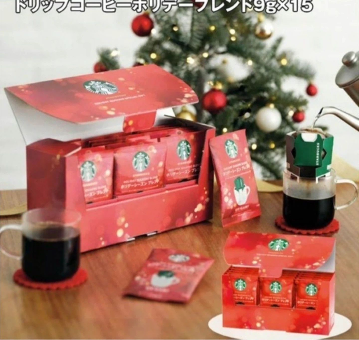 スターバックスのホリデーシーズンズブレンドのコーヒーです。 ・種類:ドリップコーヒー ・内容量:135g(9g×15袋) ・賞味期限:2026.08 写真撮影のため箱のシール剥がしあり 中古品であることをご了承ください。