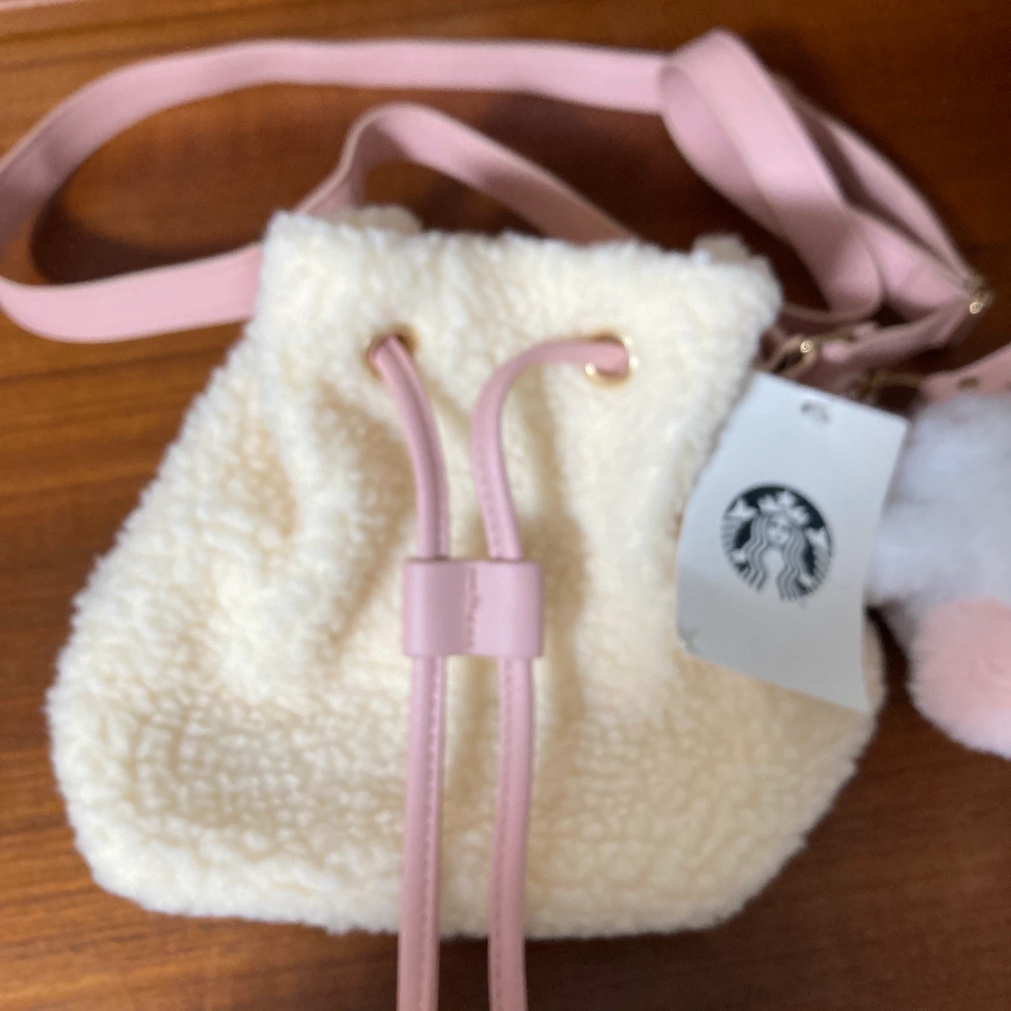 スターバックスの巾着バッグです。 ・ブランド:スターバックス ・色:白、ピンク ・素材:モコモコした素材 ・付属品:ウサギのチャーム(STARBUCKSのロゴ入り) ご不明点があればお気軽にお尋ねください。