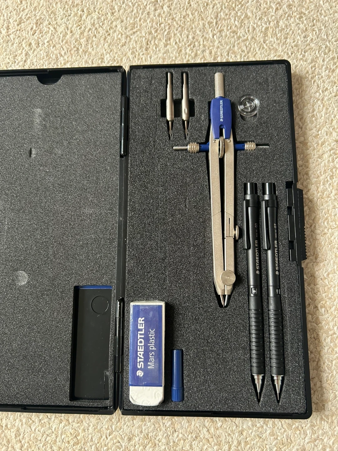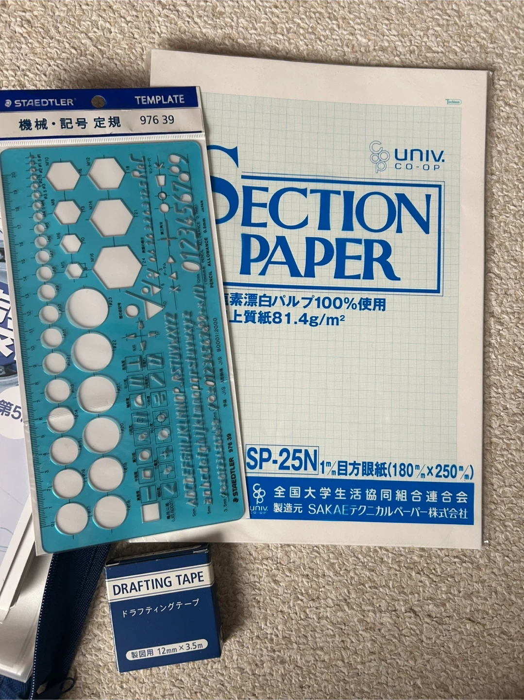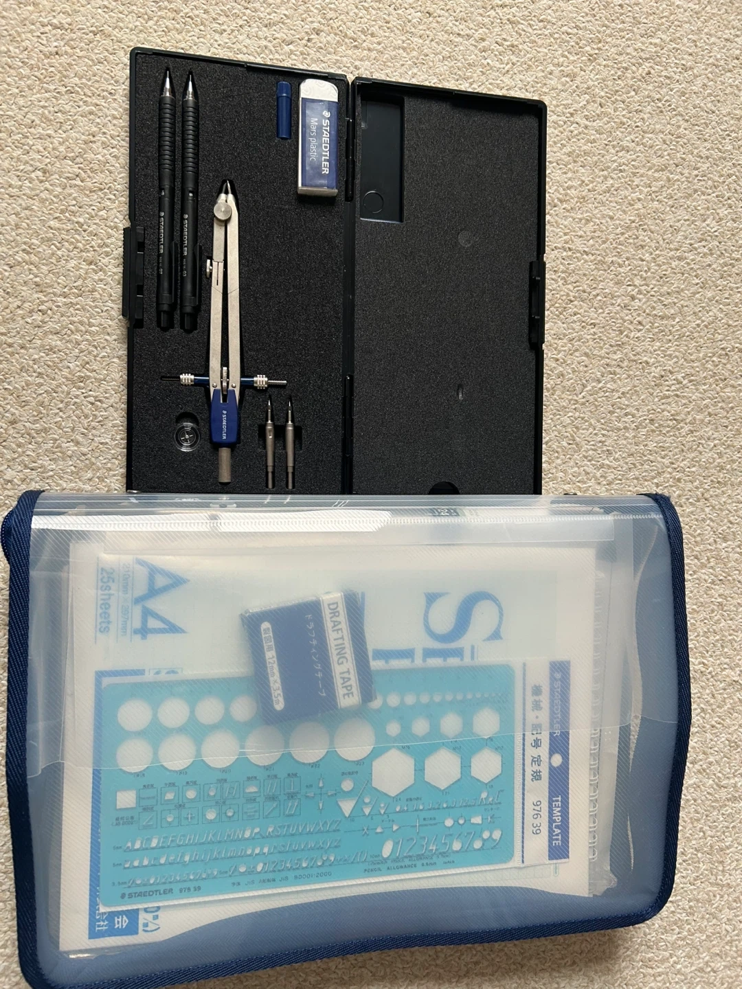 ステッドラーの製図セットです 【情報】 ブランド:ステッドラー 【内容】 ・コンパス ・シャープペンシル ・字消し ・テンプレート 976 39 ・ドラフティングテープ 12mm×3.5m ・三角定規 DRAPAS SIZE:30cm アクリル製 ・その他用紙、書籍 【状態】 使用感あり 大学でセットで購入して使用していました。 中古品であることご了承ください