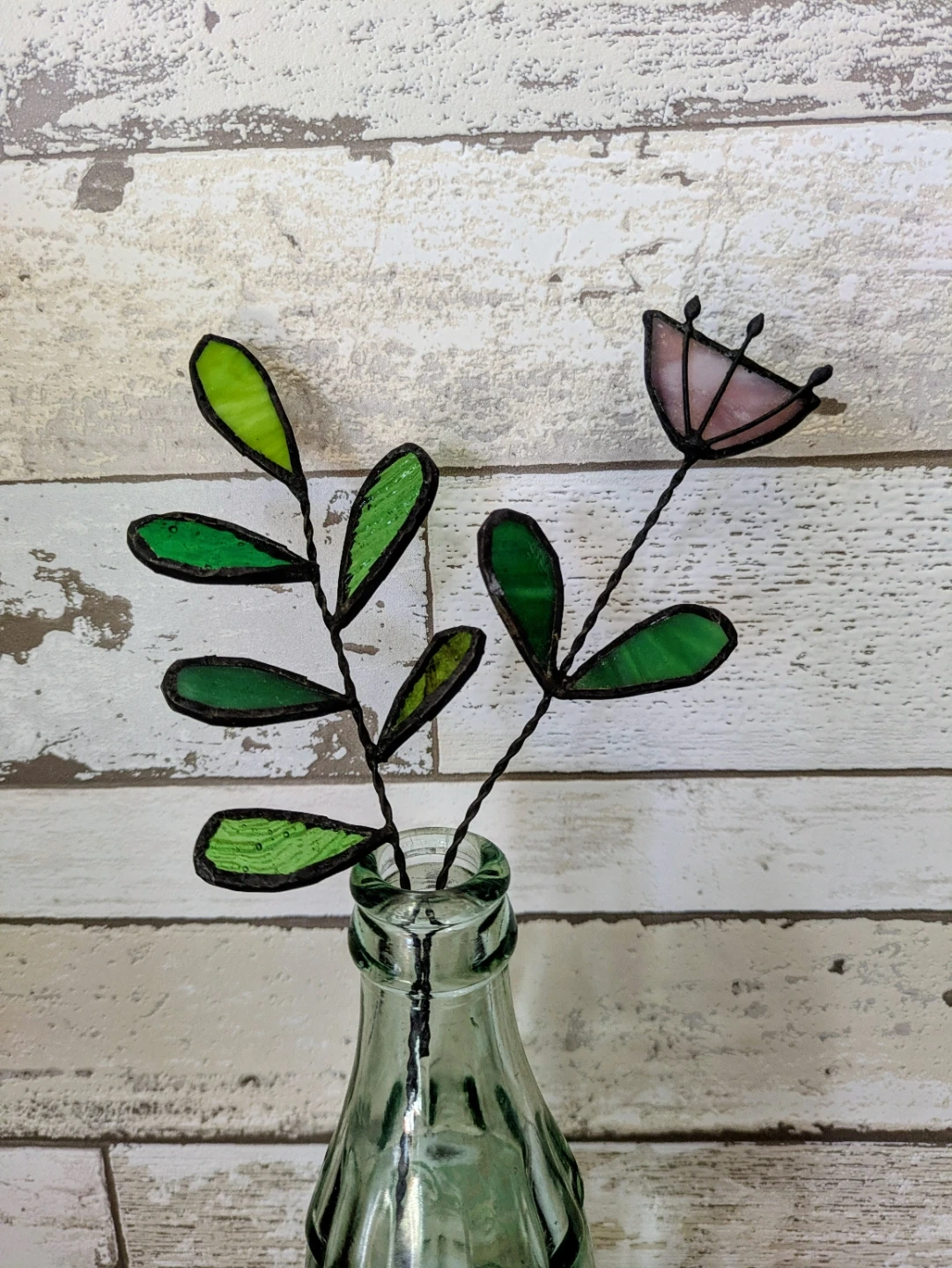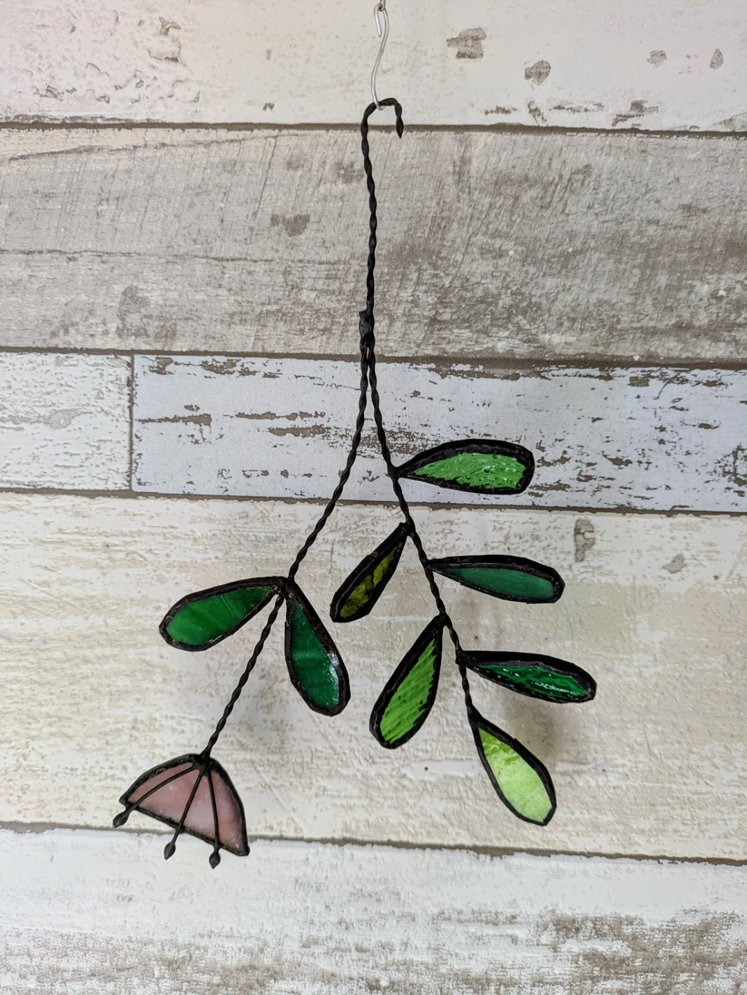 ステンドグラス製の花です。 ハンドメイド作品を購入したものです。 小さめで、縦19cmくらい、横12cmくらい、厚み1cmくらいです。 吊り下げても、一輪挿しにしても、素敵です。 ・色:グリーン、ピンク ・デザイン:葉、花 ・枝部分はワイヤー製