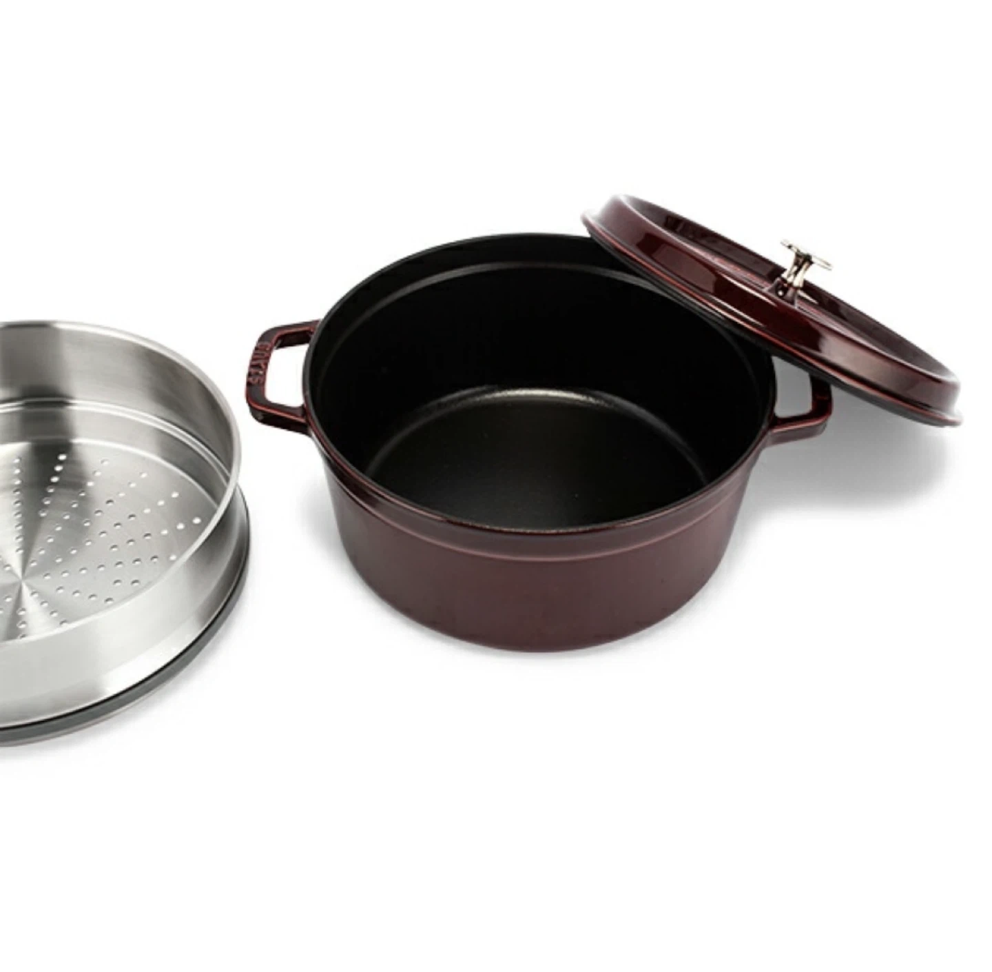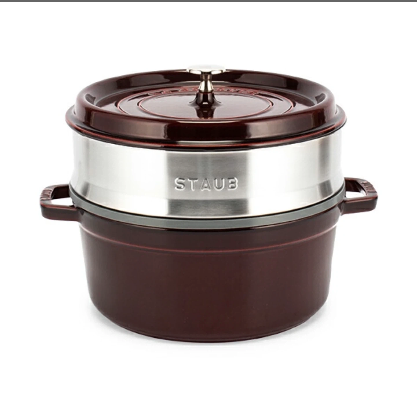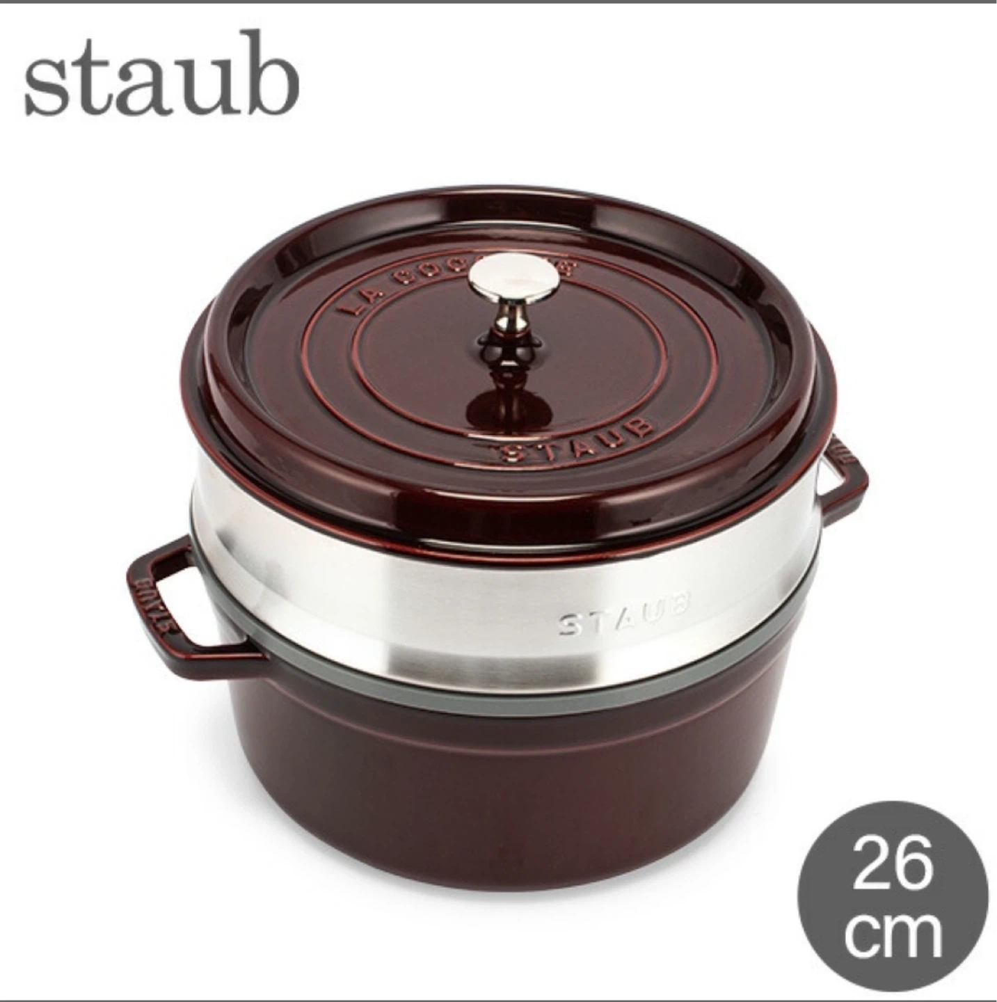 ストウブ ラウンドココット26cm 蒸し器付きのホーロー鍋です! 1度しか使ったことがなく、非常に新しいです! 便利なスチーマー付きで料理の幅が広がります! ・ブランド:ストウブ ・サイズ:26cm ・カラー:グレナディンレッド ・状態:新品から1度のみ使用。 美品ですが中古品であることはご了承ください。 ーーー [商品名] ストウブ【Staub】 ココットラウンド / スチーマーセット ラウンド 26cm Round Cocotte w/ Steamer Insert [カラー] グレナディンレッド [サイズ] トップ幅:32.5cm(両サイドの取って含む)、ボトム幅:25.5cm、高さ:20cm(鍋蓋含む) 重量:7kg 容量:5.2L 深さ:約11cm [素材] 鋳鉄ホーロー、ステンレススチール [商品について] 【特徴】 *種類:26cm鍋 *付属:同時に二つの料理も作れる便利なスチーマー付き *表面がザラザラ(黒マットエマイユ加工)している為、油が馴染みやすく焦げ付きを防ぎます。 *熱伝導・保温性に優れています。 *オーブンに使用できます。 *ガスコンロ・IH(100v、200v)・シーズヒーター・ハロゲンヒーター・オーブン・食洗器に対応します。 ※staub製品は手作りの為、色ムラ・気泡・小さな突起が見られる可能性があります。また、蓋の裏に塗装が剥げた様な跡がございますが製造過程で付くもので不良ではございません。 ■お手入れの仕方■ まずお湯をいれて洗ってください。 その後、弱火で乾燥させ、少量の植物性油を鍋の内側に塗ってください。 弱火で再度数分熱し、布やキッチンペーバーなどで余分な油をふき取ります。 油がホウロウの孔にしみこみ表面が自然に滑らかになります。 上記のお手入れを時々行ってください。 [ブランド] 【staub(ストウブ)】 フランスを代表する美食の街、アルザスで創業されたストウブ。伝統的な職人技に最新技術を加えて製造されたキッチンウェアは有名レストランのオーナーから一般家庭まで、多数のファンを生み出しています。 中でも無水調理ができる鋳物の鍋はストウブを代表する製品。現在ではヨーロッパをはじめ、日本やアメリカといった世界約50カ国に輸出され、広く愛用されています。 ーーー staub ストウブ ココットラウンド ホーロー鍋 両手鍋 スチーマー付き 蒸し器 キッチン おしゃれ かわいい 鍋 人気 調理器具 新生活