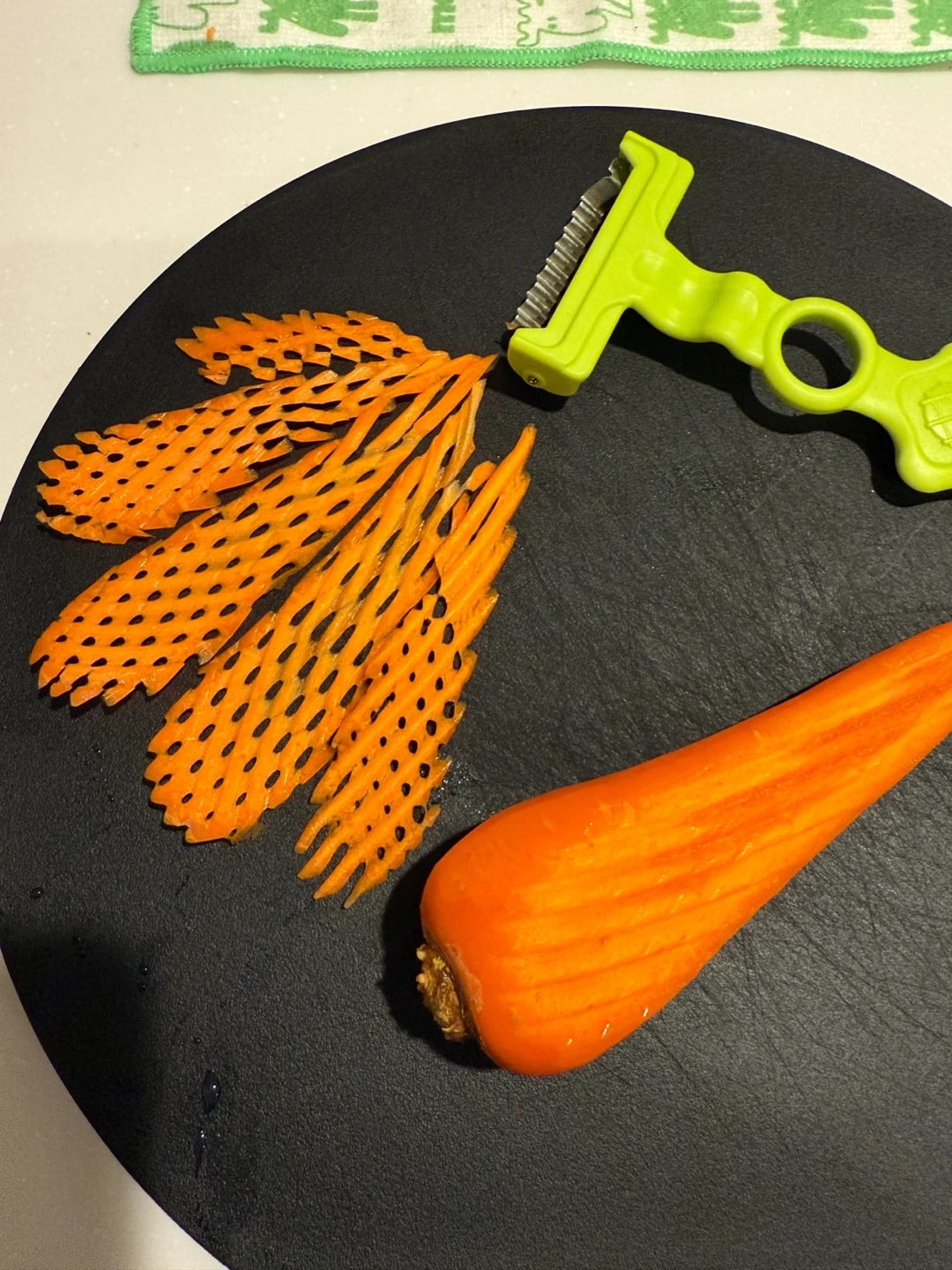 斜めに交差するようにスライスすると、写真のような飾り切りが簡単にできるスライサーです。 人参やポテトをおしゃれにスライスし、揚げてサラダの飾りなどにいかがですか? キッチン用品が多すぎるので整理したいと思い出品します。
