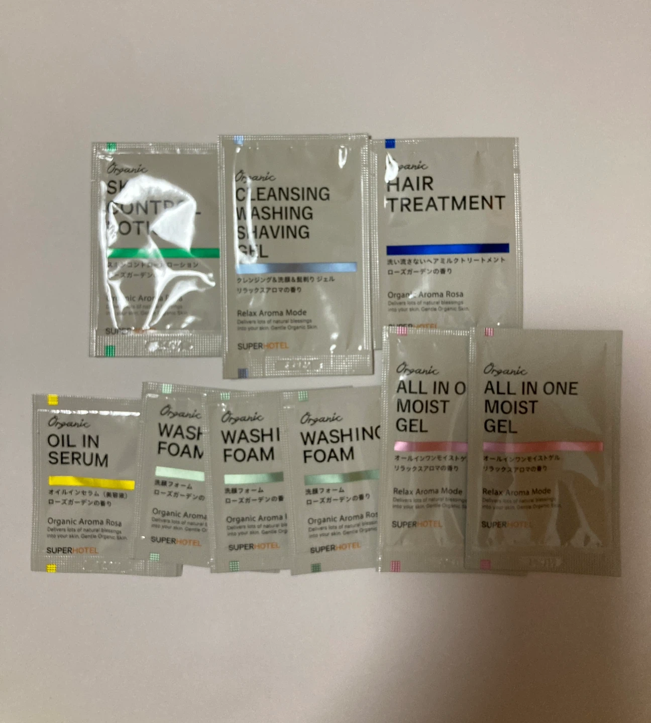 スーパーホテルのアメニティセットです。 ・オーガニック スキンコントロールローション ・オーガニック クレンジング ウォッシング シェービングジェル ・オーガニック ヘアトリートメント ・オーガニック オイルインセラム ・オーガニック ウォッシュフォーム ・オーガニック オールインワンモイストゲル