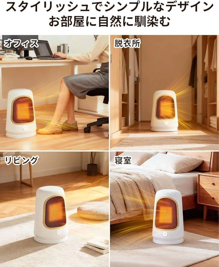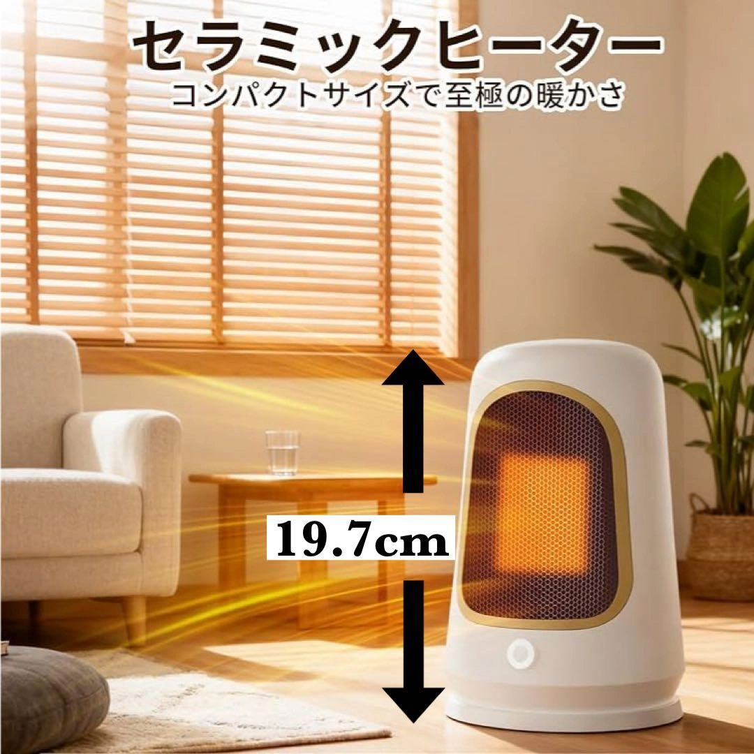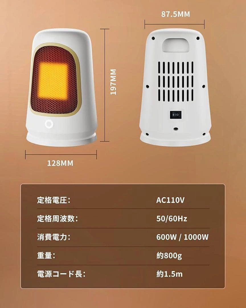 【サイズ】 画像10枚目参照 最新のPTCセラミック加熱技術を採用し、スイッチを入れた瞬間からわずか1秒で温風が吹き出します。最大1000Wの高出力でパワフルに加熱します。 600Wと1000Wの2段階出力モードを搭載しています。PTCセラミック発熱体を採用しており、温度が一定値に達すると自動的に発熱量を抑える自己温度制御機能を備えています。 二重防護機構を搭載:万が一転倒した場合には即座に電源が切れる「転倒自動OFF機能」と、内部温度が過度に上昇した際に作動する「過熱保護装置」を搭載しております。 シンプルで現代的なデザインです。寝室、更衣室、トイレ、リビング、オフィスなどの多重シーンに適しています。 運転音は約34dBです。寝室や書斎、オフィスなど音を気にしたくない場所でも快適にご使用いただけます。 ご希望の方はお気軽にご連絡ください。