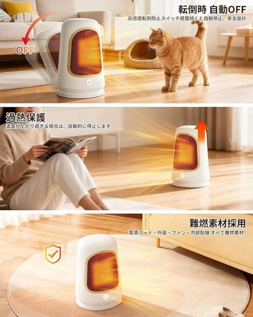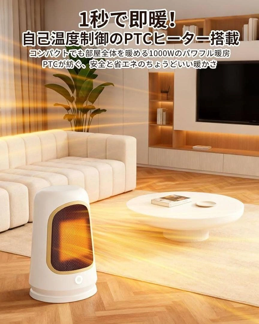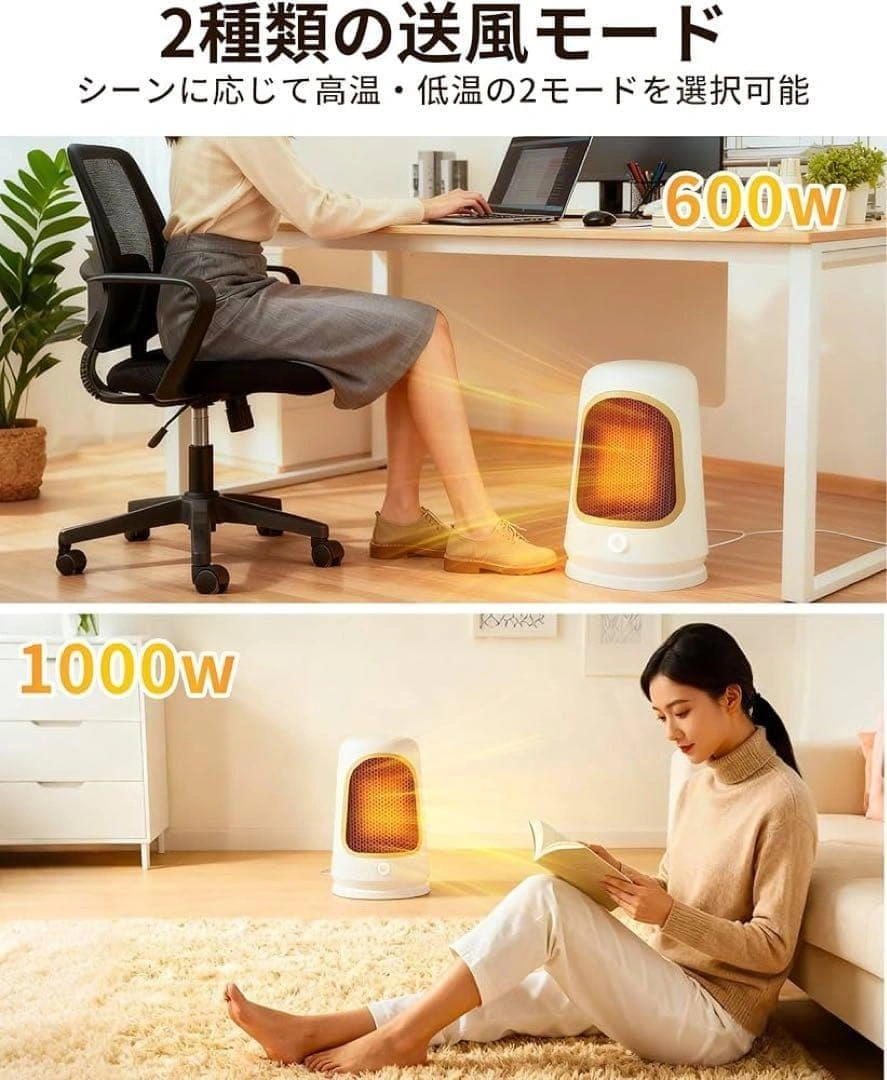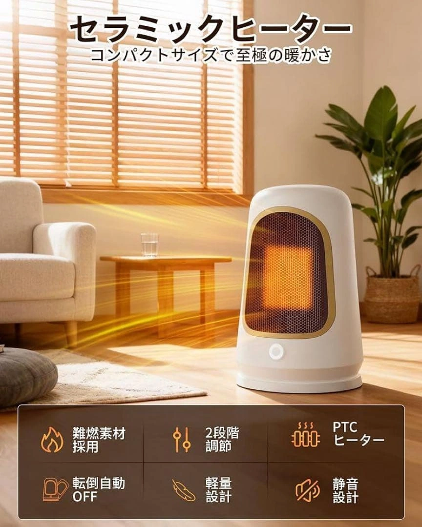 【サイズ】 画像10枚目参照 最新のPTCセラミック加熱技術を採用し、スイッチを入れた瞬間からわずか1秒で温風が吹き出します。最大1000Wの高出力でパワフルに加熱します。 600Wと1000Wの2段階出力モードを搭載しています。PTCセラミック発熱体を採用しており、温度が一定値に達すると自動的に発熱量を抑える自己温度制御機能を備えています。 二重防護機構を搭載:万が一転倒した場合には即座に電源が切れる「転倒自動OFF機能」と、内部温度が過度に上昇した際に作動する「過熱保護装置」を搭載しております。 シンプルで現代的なデザインです。寝室、更衣室、トイレ、リビング、オフィスなどの多重シーンに適しています。 運転音は約34dBです。寝室や書斎、オフィスなど音を気にしたくない場所でも快適にご使用いただけます。 ご希望の方はお気軽にご連絡ください。