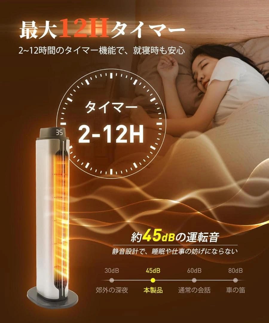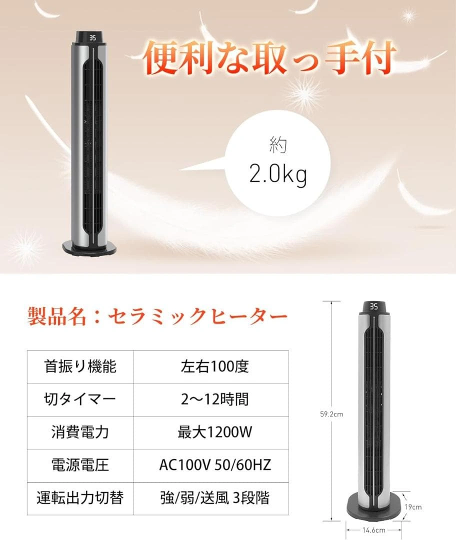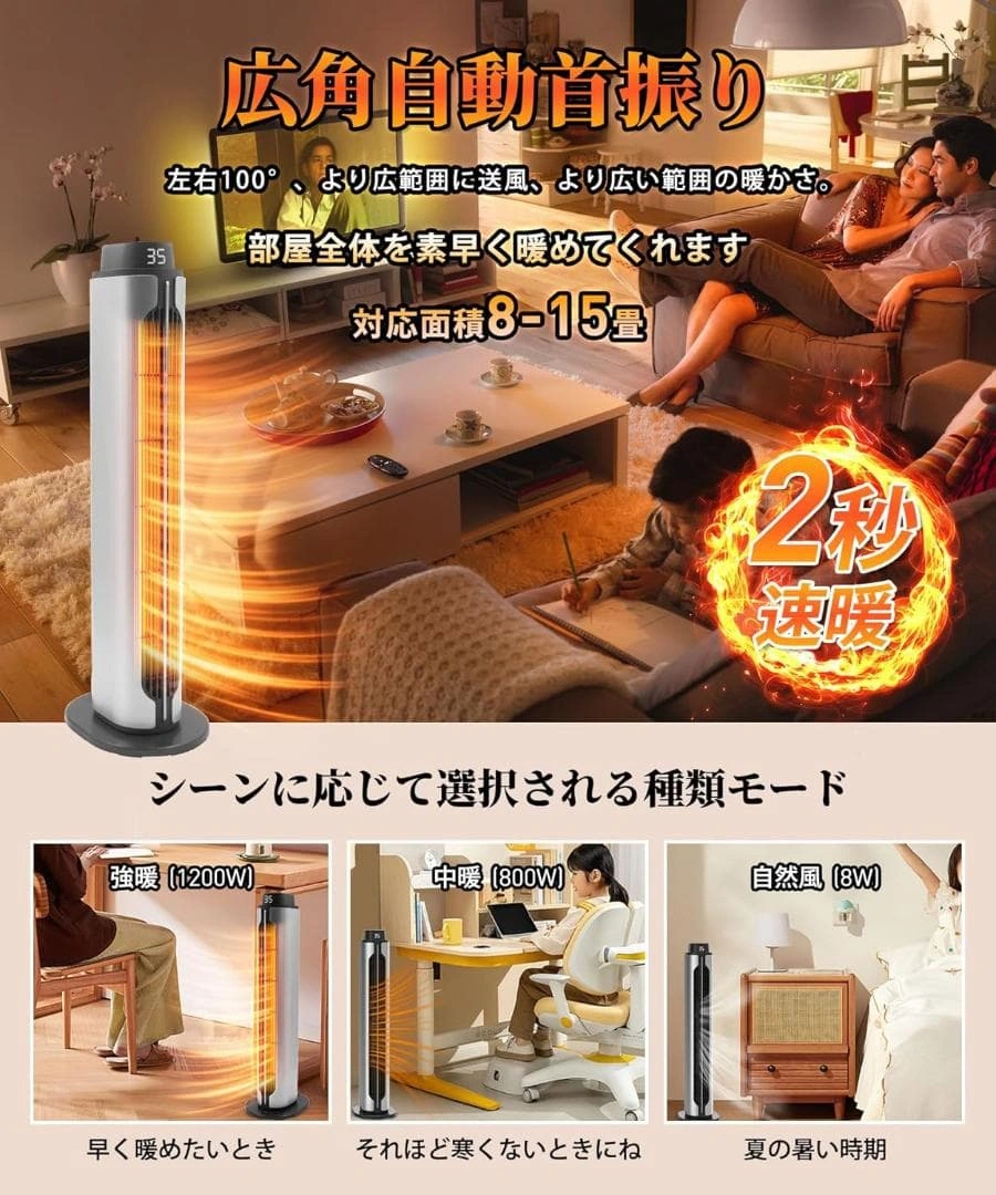 ご覧いただきありがとうございます✨ セラミックヒーター 速暖ヒーター PSE認証済 販売価格:13,979円 【2025年冬新型の電気ファンヒーター&今冬には最適な選択だ!】新型電気ファンヒーターは、最強1200W、2秒速暖! 左右100°自動首振り、大風量立体送風、従来品の電気ファンヒーターと比べで送風範囲さらにアップする、対応8畳~15畳の範囲ならまったく問題ない!2秒速暖、電源ボタンを押せばすぐに暖気が出るので、寒い冬の日に家に帰れば、あっという間に暖かくなる! 【3段階送風&ECO省エネモード】ヒーターは自然風8W、弱温風800W、強温風1200WとECO省エネモード四つの温度モードが搭載される冷暖兼用ヒーターです。また、設定温度に合わせて自動で出力が切り替わるECOモード搭載!室温センサー付きで、温度を無段階(15°~35°)に調整できるエコ節電モードも搭載しているので、快適な温度を自由に選択でき、同時に節電もできる!脱衣所やトイレ、デスク周りなどエアコンの風が届かず寒くなりがちな場所で、手軽に使いやすい省エネ暖房器具です。 【付属のリモコン&9時間タイマー機能&低騒音操作】新しくアップグレードされたーセラミックヒーターは、45dB以内の騒音で動作し、一晩中静かで暖かい環境で眠らせる超静かな機器です。タイマー機能を備え、2時間から12時間までの自動シャットダウン機能により、エネルギー効率が更に向上し、環境にも配慮します。2 つの操作モード、ボタン操作に加えて、専用リモコンが付属しており、遠隔操作が可能。便利です。 【異臭なし&多重保護機能】多重保護機能搭載、高品質耐燃材料--V0級耐燃材料で、長時間利用しても、焼けや臭など匂いしません。転倒自動OFF機能--地震や小さな子供やペットのいる家庭での不注意で転倒しても、セラミックヒーターが自動に電源OFFになります。加熱保護機能--温度は65°以上になると、セラミックヒーターが自動に電源OFFになります。30秒冷却機能--電源を切ようとする時、ヒーターが給気機能まで30秒のカウントダウンを開始し、完全な冷却を保証し、不慮の怪我を防ぎます。各種安全機能により、使用中の快適性と安心感を提供します。 N355 ご希望の方はお気軽にご連絡ください。