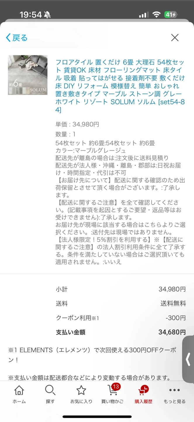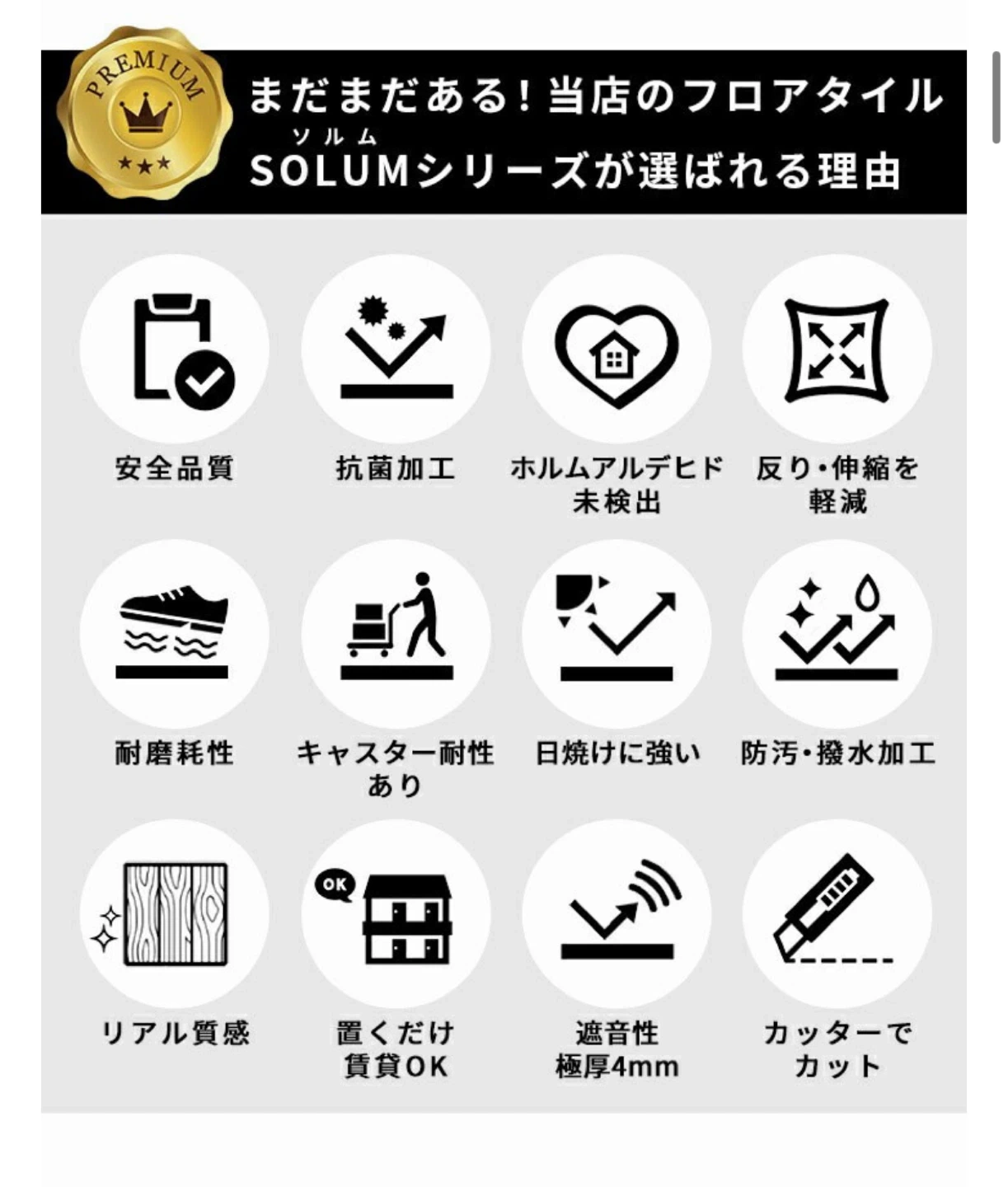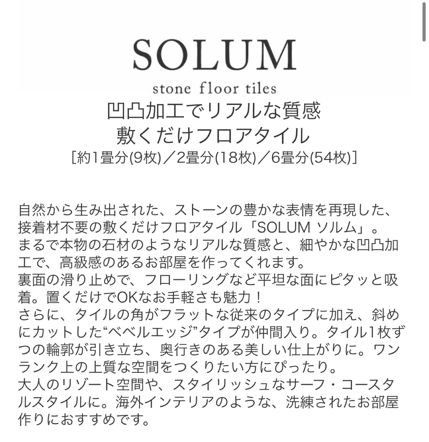 ソルム SOLUMのおくだけフロアタイルです。 34,000円で購入しました。 新しい家のインテリアと合わなくて処分します。 9ヶ月使いましたが汚れやキズは無いです。 ・ブランド:SOLUM(ソルム) ・商品:フロアタイル ・カラー:マーブルグレージュ ・セット内容:54枚(約6畳分) ・サイズ(1枚あたり):約W609×D304×H4mm ・素材:PVC(グラスファイバー入り) 中古品であることをご了承ください。 フロアタイル 置くだけ 6畳 大理石 2畳 1畳 9枚〜54枚 賃貸OK 床材 フローリングマット 床タイル 吸着 貼ってはがせる 接着剤不要 敷くだけ 床 DIY リフォーム 模様替え 簡単 おしゃれ 置き敷きタイプ マーブル ストーン調 グレー ホワイト リゾート SOLUM ソルム [stc54-84] [楽天] #Rakutenichiba https://item.rakuten.co.jp/zakka-elements/set54-84/?scid=wi_ich_iphoneapp_item_share