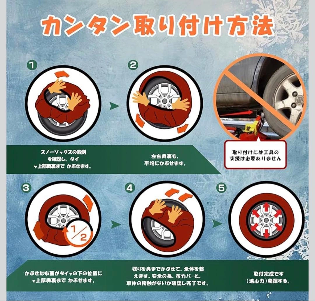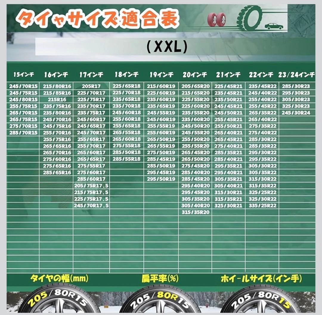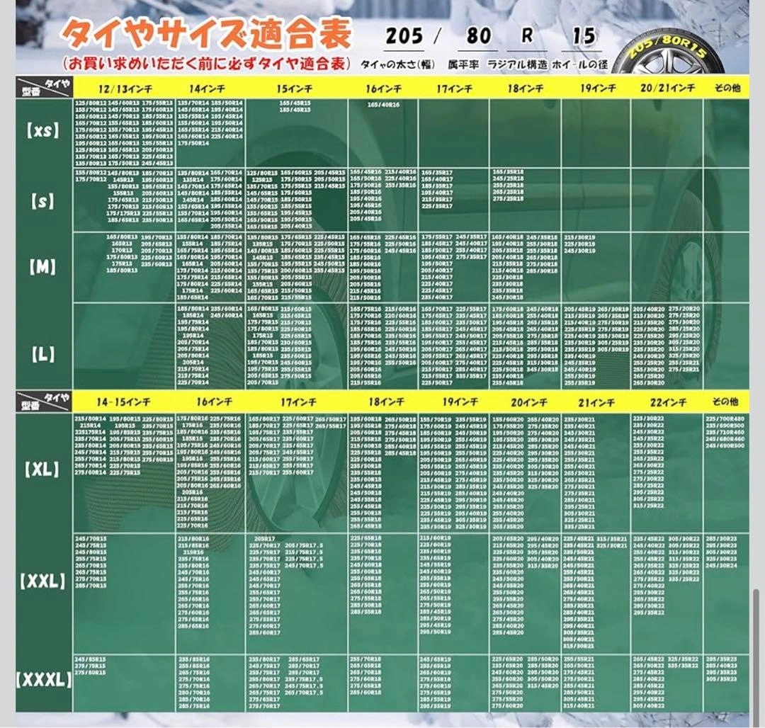 数ある中からご覧頂きありがとうございます(^○^) サイズ XXL 【布製タイヤすべり止め】 チェーン規制対応。緊急用タイヤすべり止めです。スノーチェーンの完璧な代替品: このタイヤ スノー ソックス 5 個セットは、コンパクトなキャリング ケースに折りたたんで、雪や氷の緊急事態に備えて車に保管できます。従来のタイヤ チェーンに伴う衝撃、騒音、リムの損傷が軽減され、よりスムーズな乗り心地をお楽しみいただけます。 車両とリムに安全: 車の安全性を考慮して設計されたスノーソックスは、タイヤとリムの損傷を防ぐように設計されています。従来のスノーチェーンとは異なり、これらのソックスは車両のシステムに害を及ぼさないため、冬の間中安心して使用できます 堅牢な 3D 生地: 従来のスノータイヤチェーンやタイヤケーブルを上回る優れたトラクションとグリップを実現する超強力な 6D 生地で比類のない耐久性を体験してください。当社の生地は、氷の路面で最適な安定性と制御性を実現するように作られています 耐久性があり再利用可能: 高品質の耐裂性素材で作られたスノーソックスは、何冬も耐えられるように作られています。これらの洗えて再利用可能なスノーソックスは、最も過酷な条件に耐えるように設計されており、長持ちするパフォーマンスと価値を提供します 強化されたトラクション: タイヤ用スノーソックスは、雪に覆われた道路で優れたトラクションを提供し、冬の条件でも安全で自信を持って運転できるようにします。滑りやすい道路とはおさらばして、改善されたハンドリングとコントロールをお楽しみください ご希望の方はお気軽にご連絡ください。