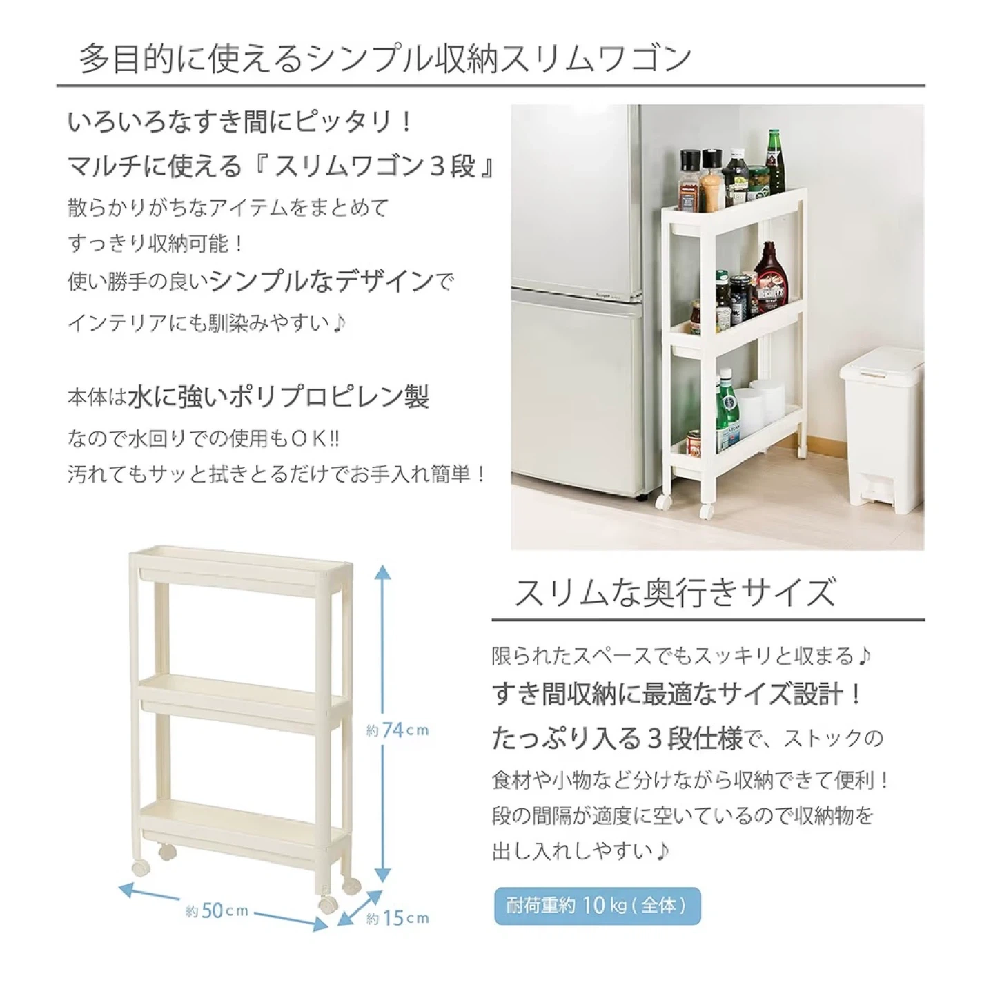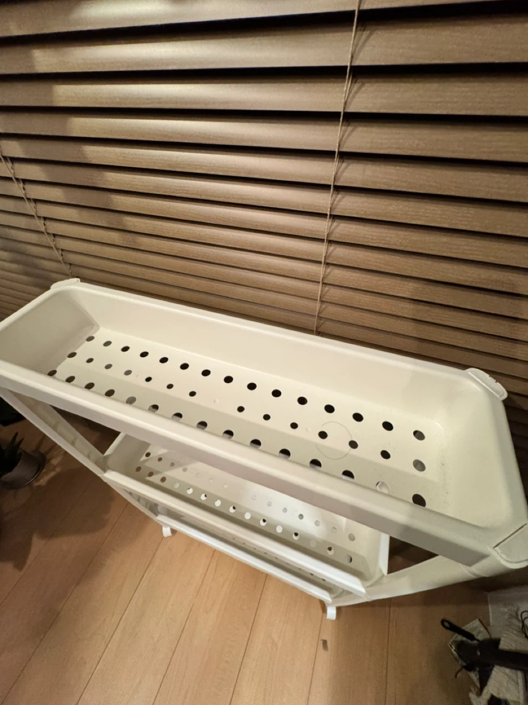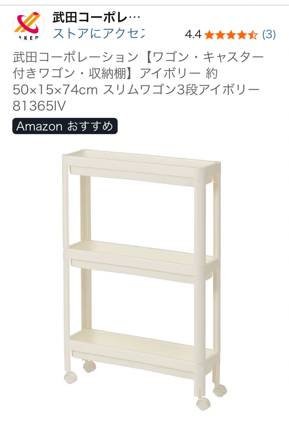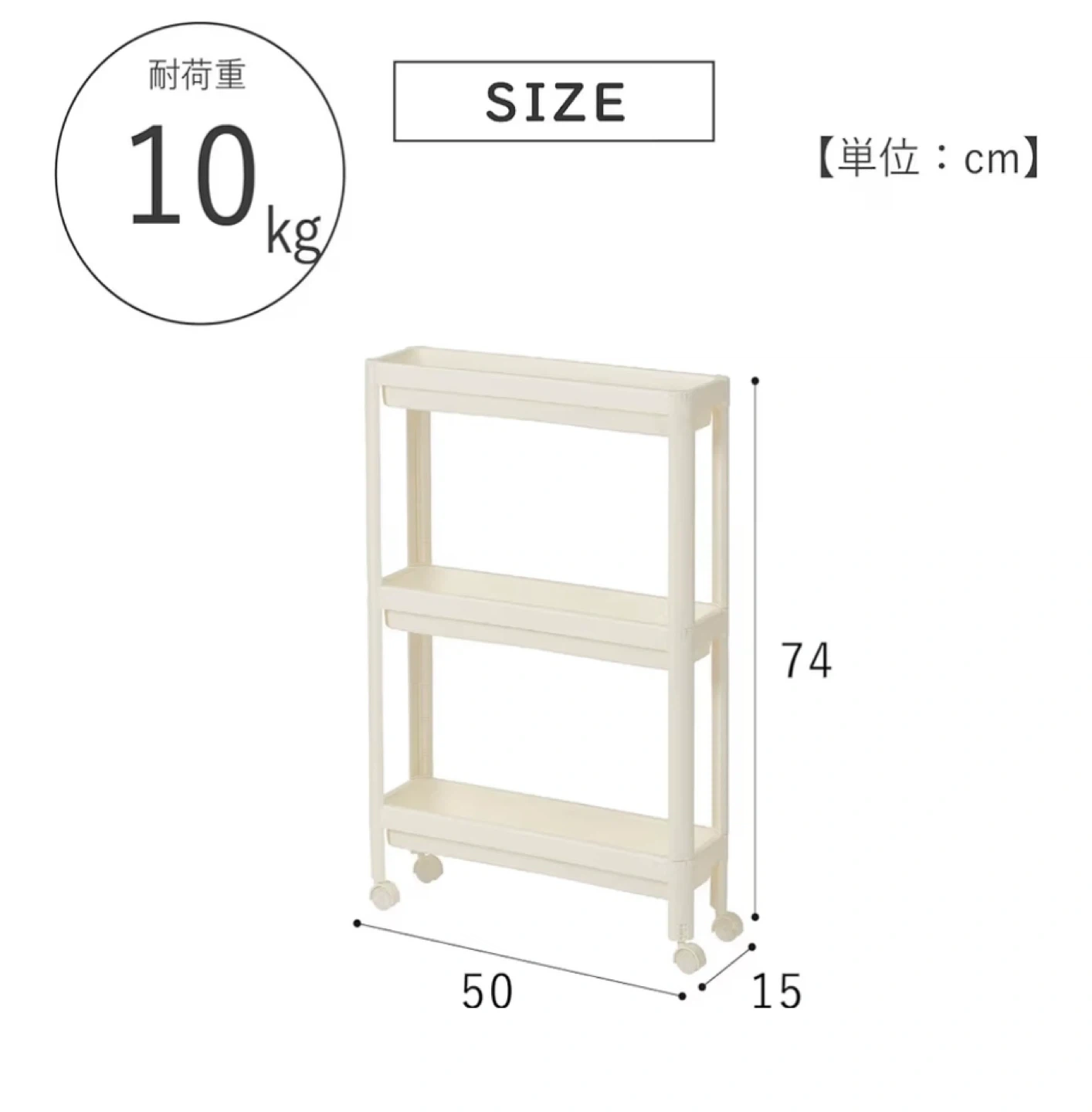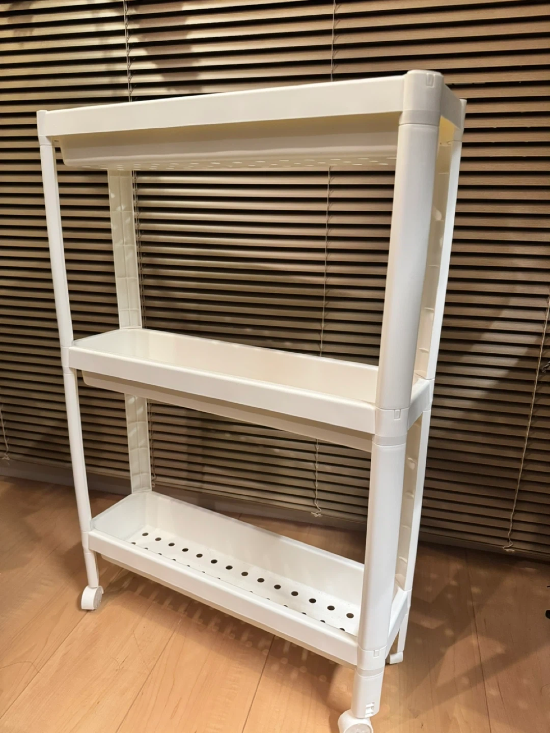 タケダコーポレーションのスリムワゴン3段です。 サイズ間違えて購入してしまいました。 組立後に気づいたので、梱包箱など処分しています。 お渡しは、このままでも、分解してもどちらでも。ただし説明書はありません。(無くても、作れます) 通気性もあるので、水回りでも便利かと! ・カラー:アイボリー ・サイズ:約50×15×74cm ・全体的にきれい ・キャスター付き 中古品であることをご了承ください。