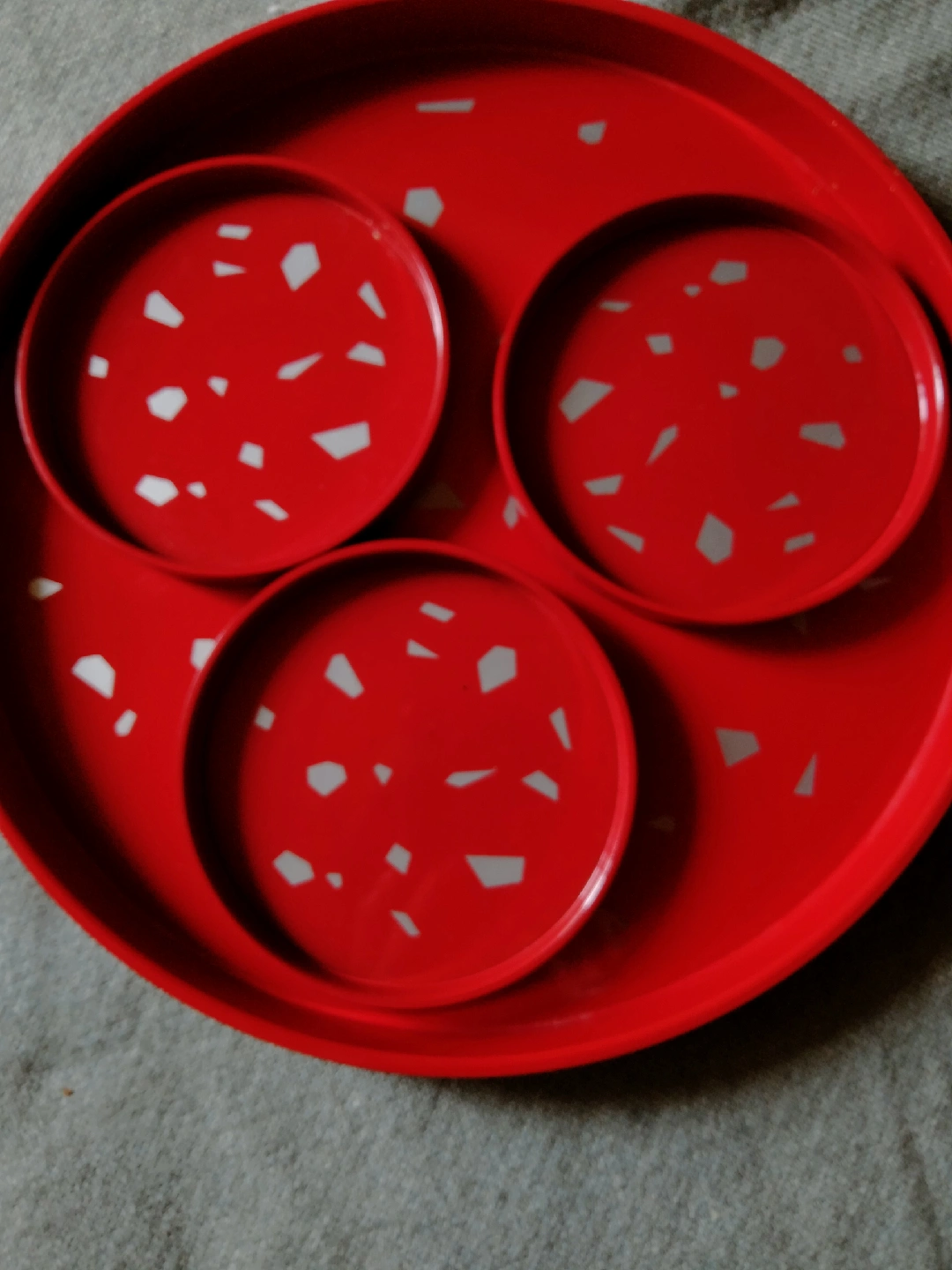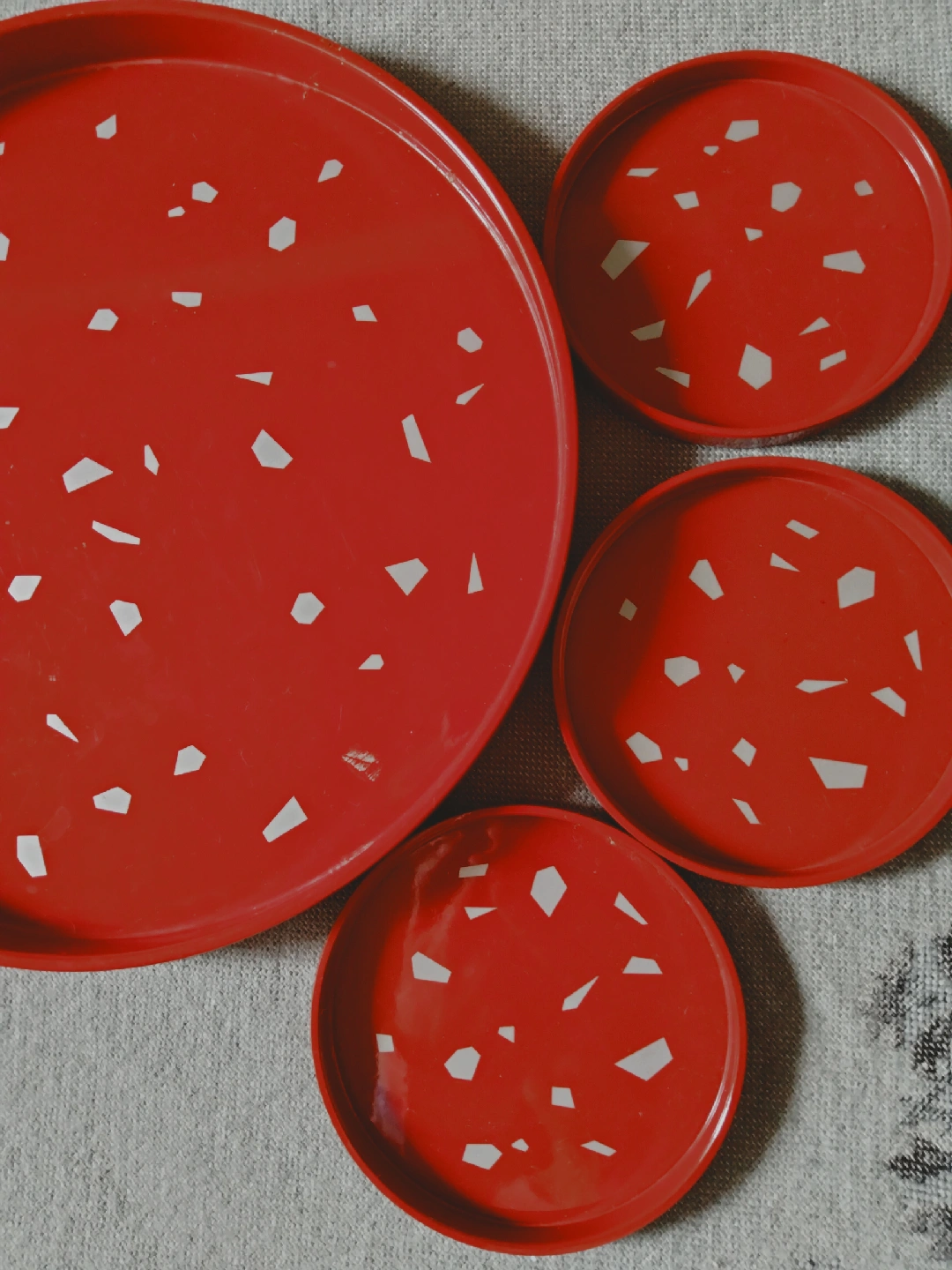 タチキチのトレイとコースター3枚のセットです。 ・カラー:赤 ・デザイン:シルバーグレーの模様 ・状態:使用感少なめ 艶のある素材なので、擦れはあります。気になさらない方のみご検討ください。